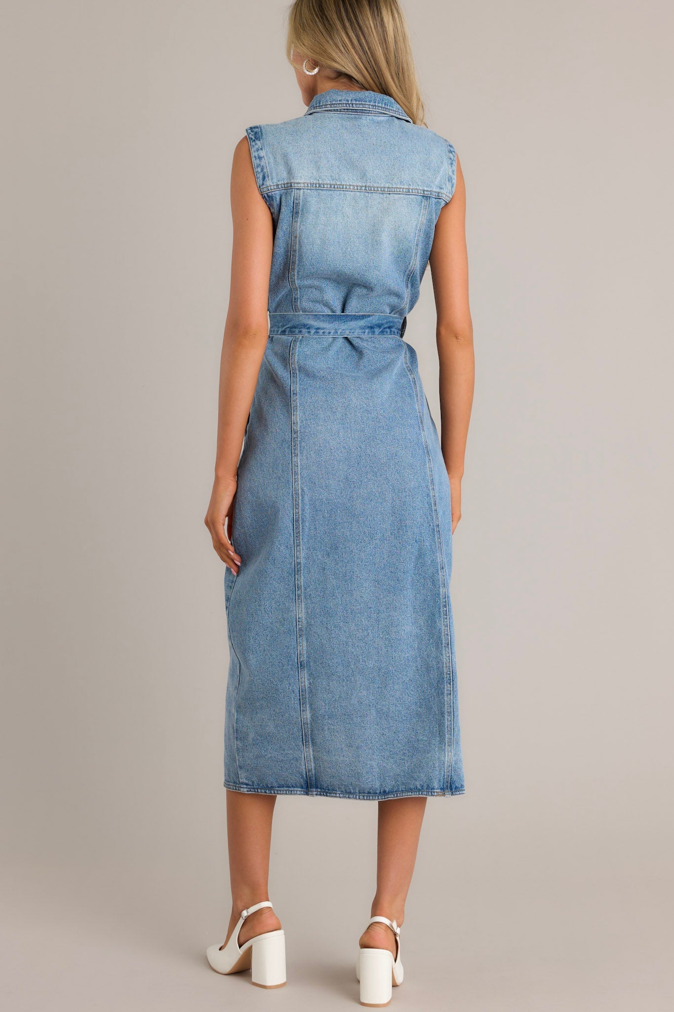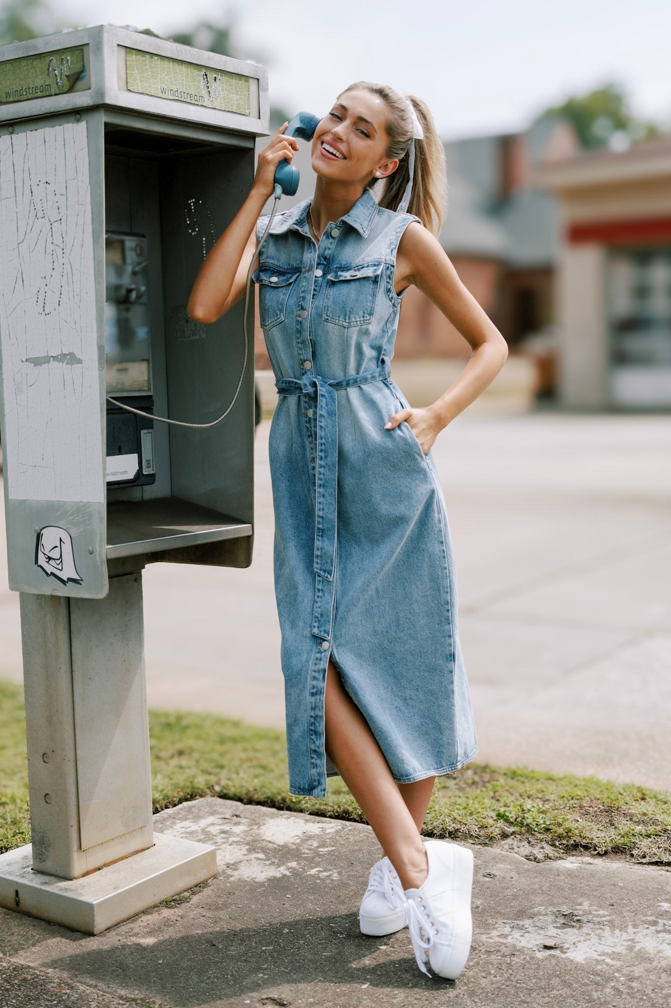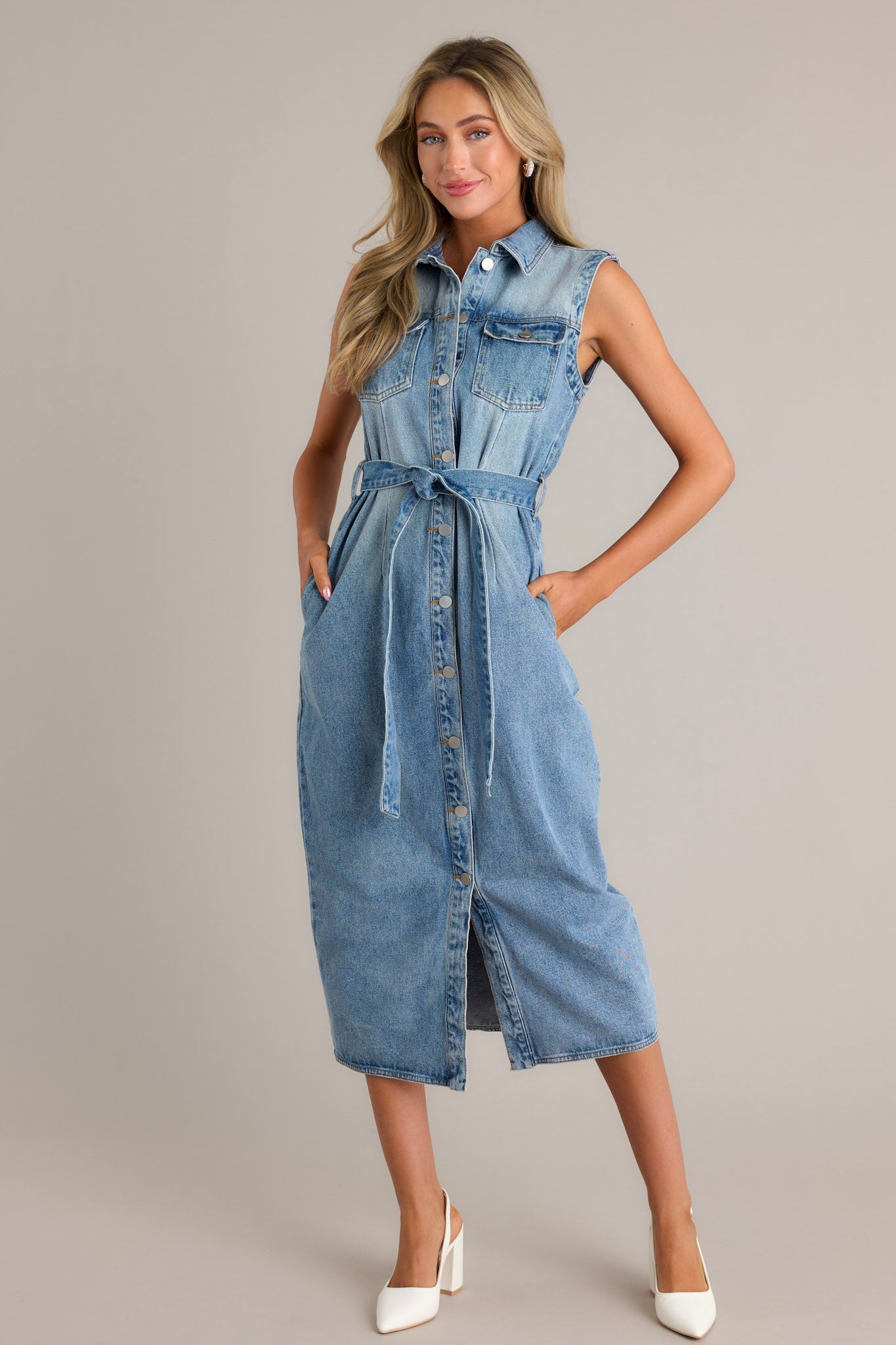 Get ready to rock the denim trend with our Blue Jean Babe Maxi Dress! This medium wash denim dress is the perfect blend of style and comfort. With a flattering fit, you'll be turning heads and feeling fabulous. Don't miss out on this must-have piece for any fashion-forward wardrobe! This denim maxi features a collared neckline, a functional button front, functional breast pockets, a self-tie waist belt, belt loops, functional hip pockets, and a sleeveless design.
