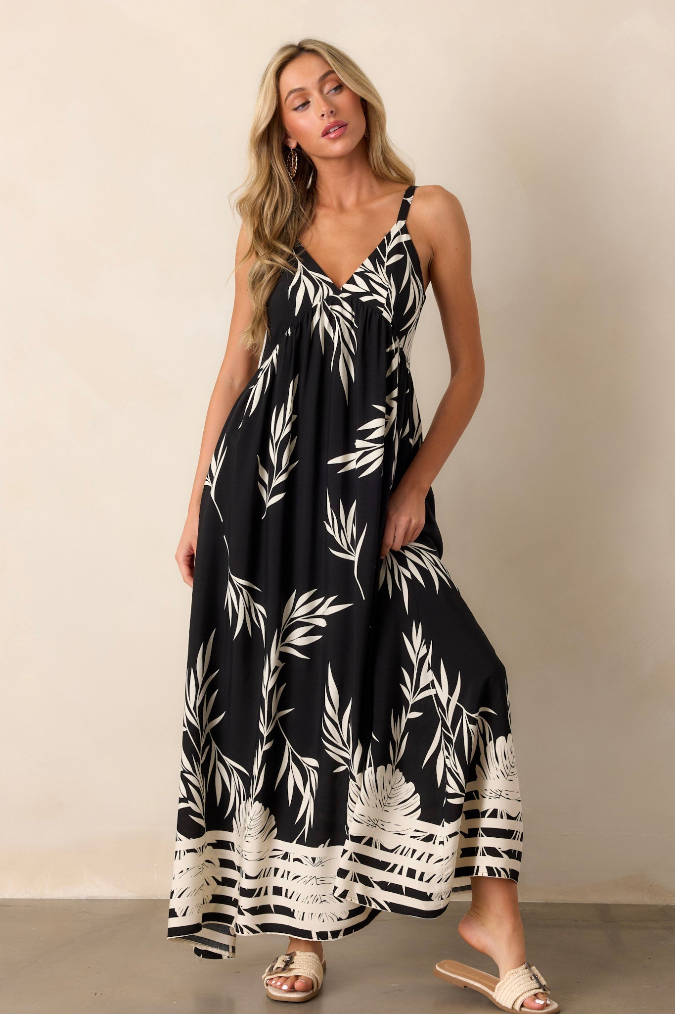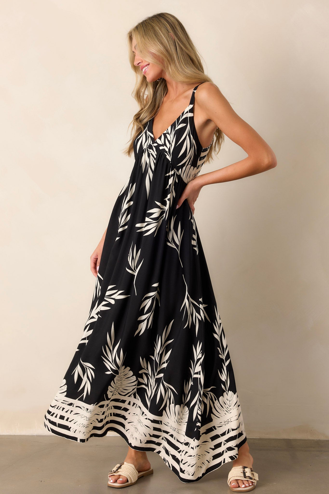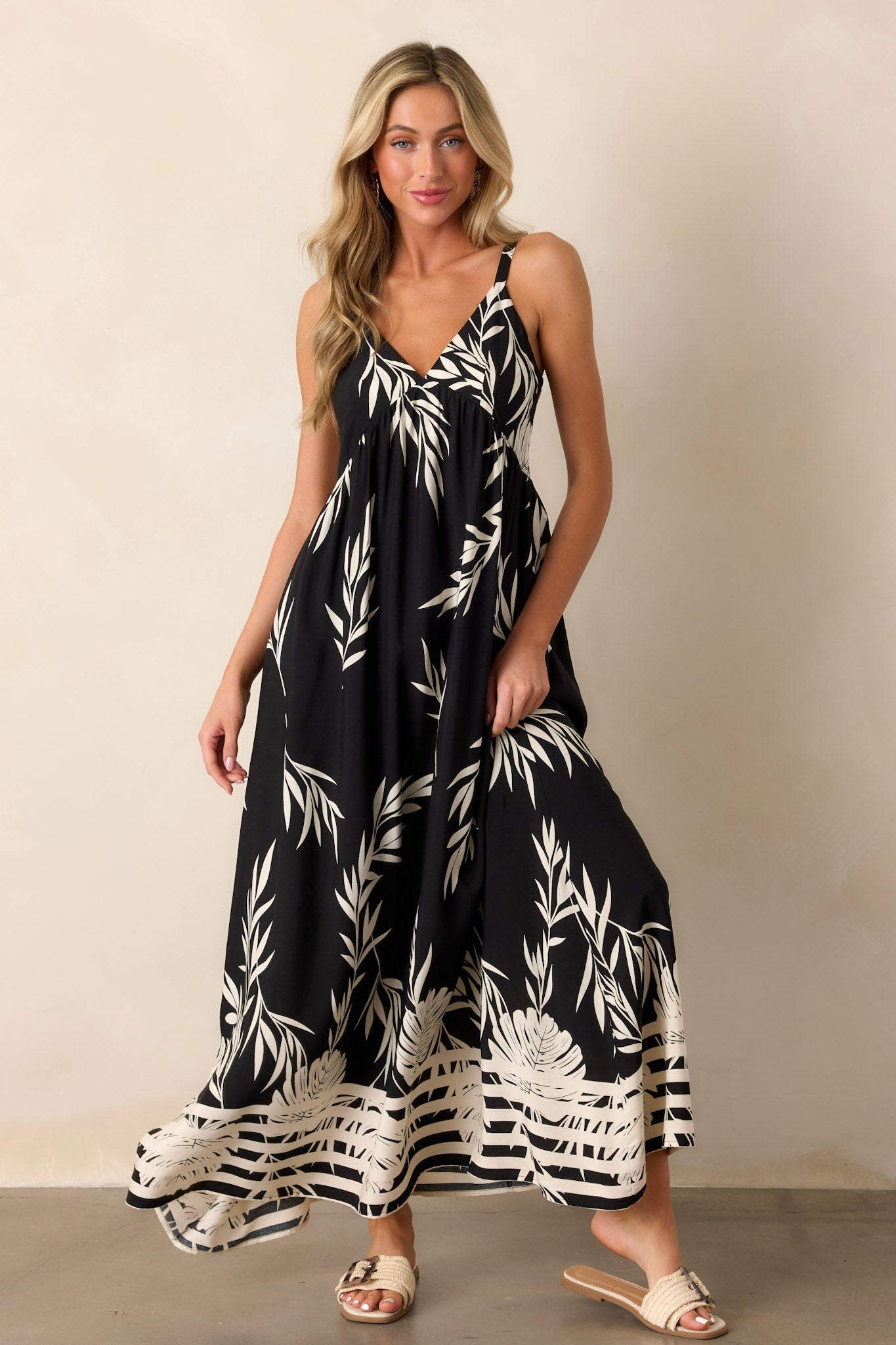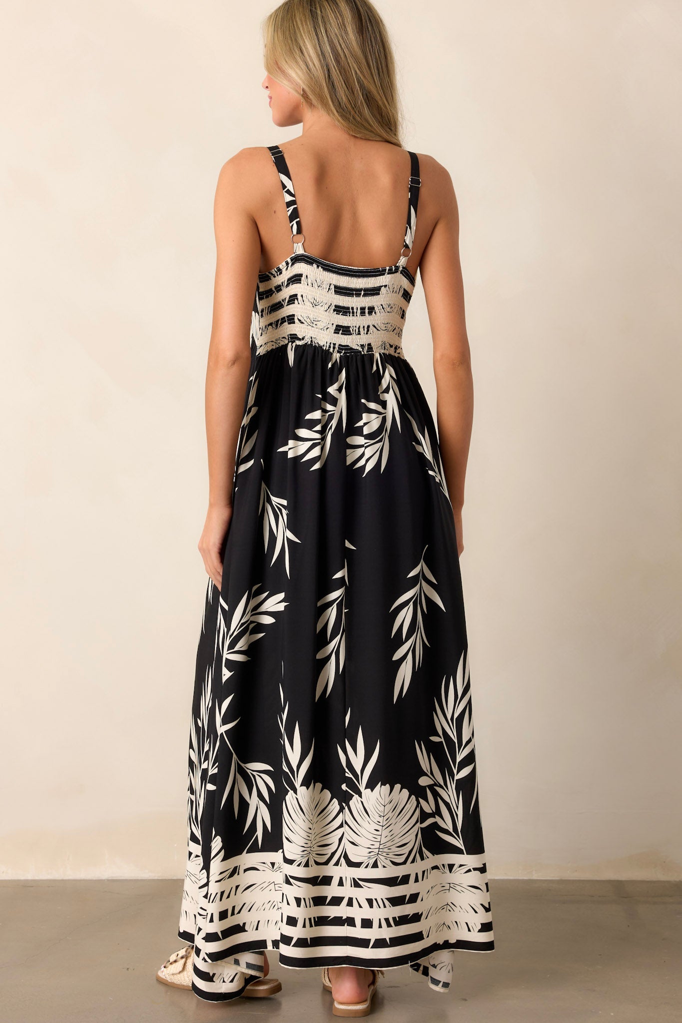 Get ready to embrace your bohemian side with our Bohemian Life black Floral Maxi Dress! This dress features a stunning floral design that will make you stand out and feel free-spirited. Made with soft and comfortable fabric, it's perfect for all-day wear. Say yes to adventure in this must-have dress. This black dress features a v-neckline, thin adjustable straps, a smocked back, and stripe detailing along bottom.