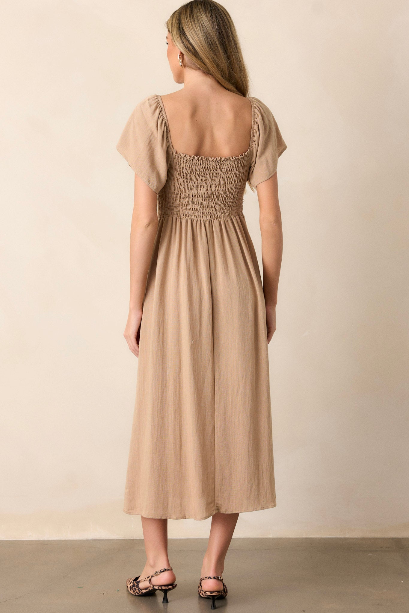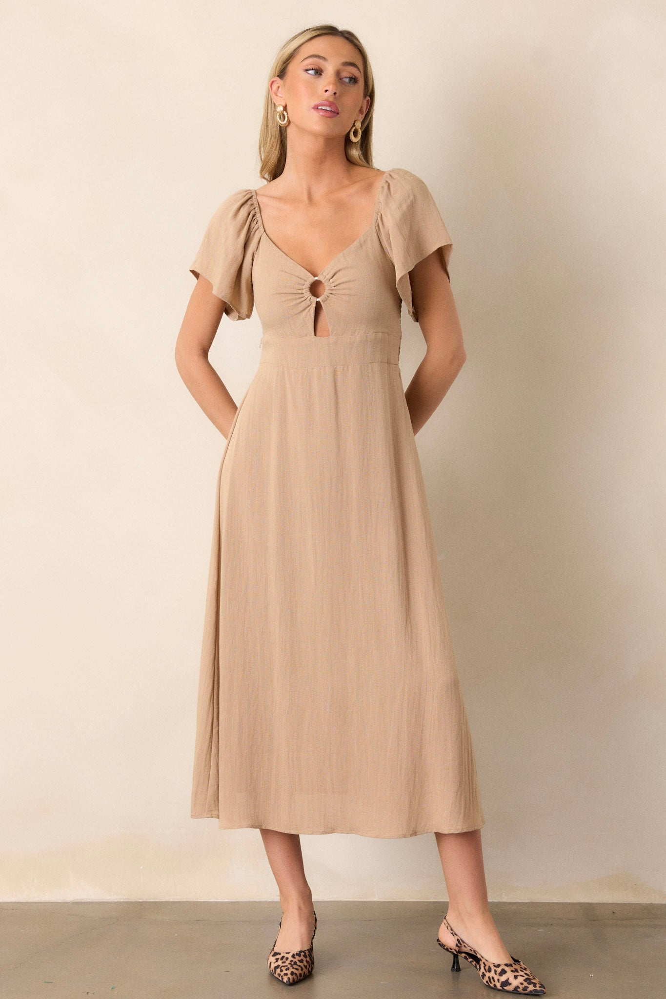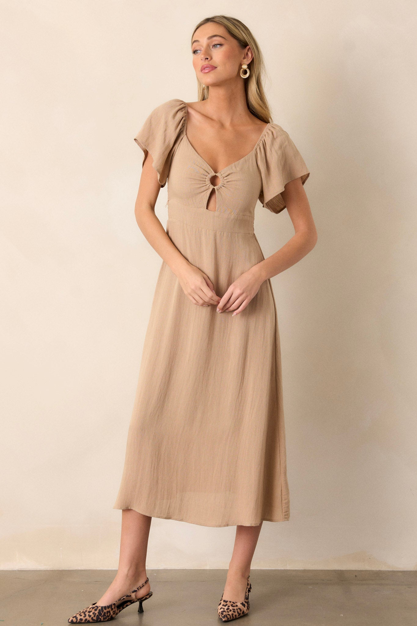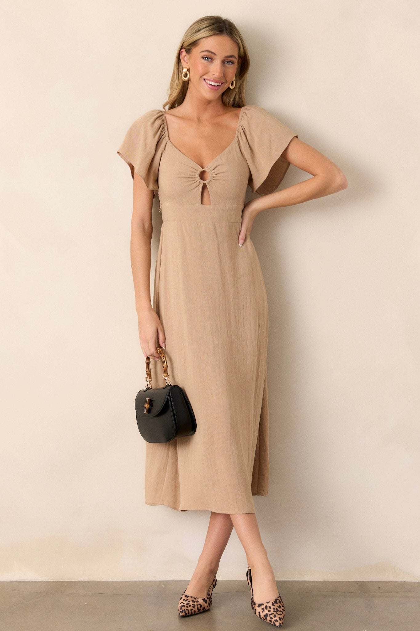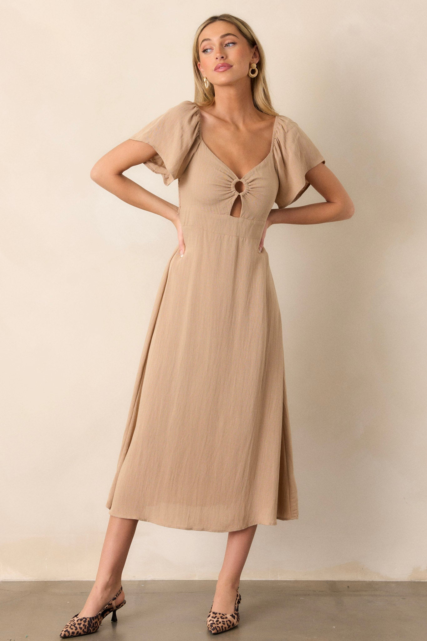 Get ready to strut your stuff in this flirty and fun Boho Beauty Tan Puff Sleeve Midi Dress! Featuring a playful puff sleeve design and flattering midi length, this dress is perfect for all your warm weather adventures. Embrace your inner bohemian with style and confidence in this one-of-a-kind dress. This midi dress features a cut-out design in the chest, a smocked back, elastic cuffed puff sleeves, an accent gold ring in the bust, and a flowing silhouette.