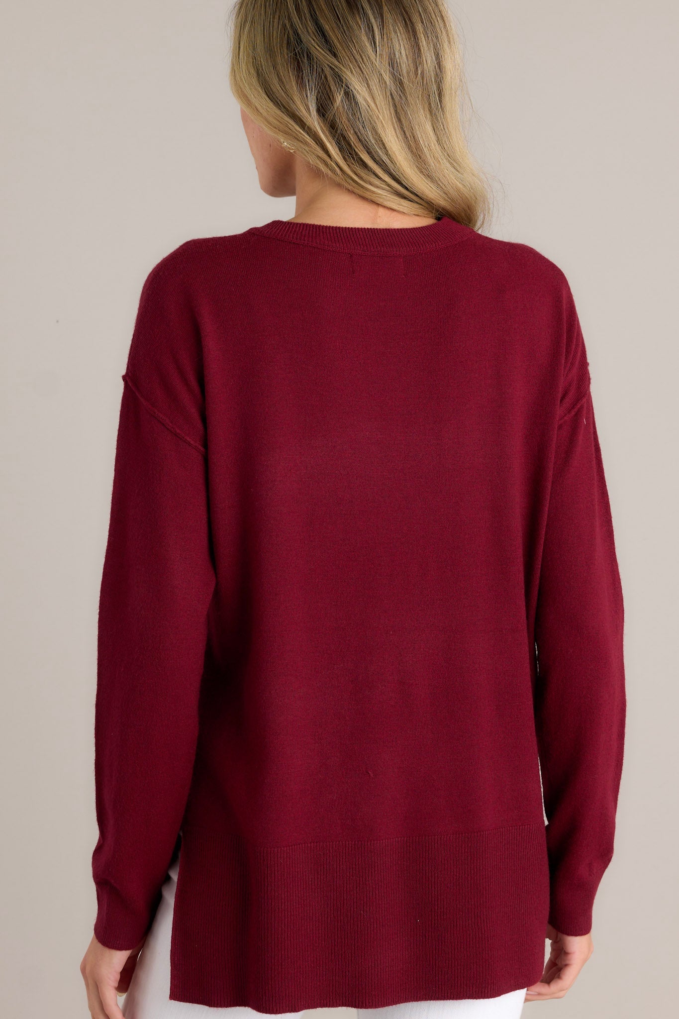 Stay cozy and stylish this fall with the Bonfire Weekends Burgundy Sweater! Featuring a lightweight, textured material, this top is perfect for any chilly fall day. Whether you're camping, toasting marshmallows, or hitting the town, you'll look and feel good in this cozy top! This sweater features a round neckline, long sleeves with ribbed cuffs, a bottom hemline that is slightly longer in the back and has slits up both sides, and a super soft feel throughout.