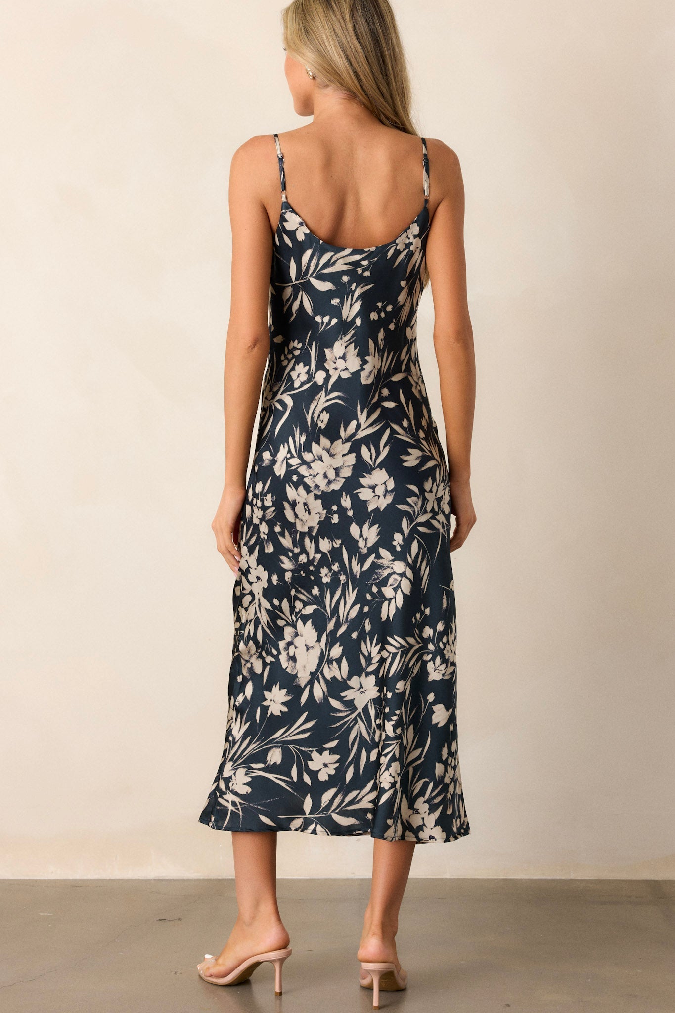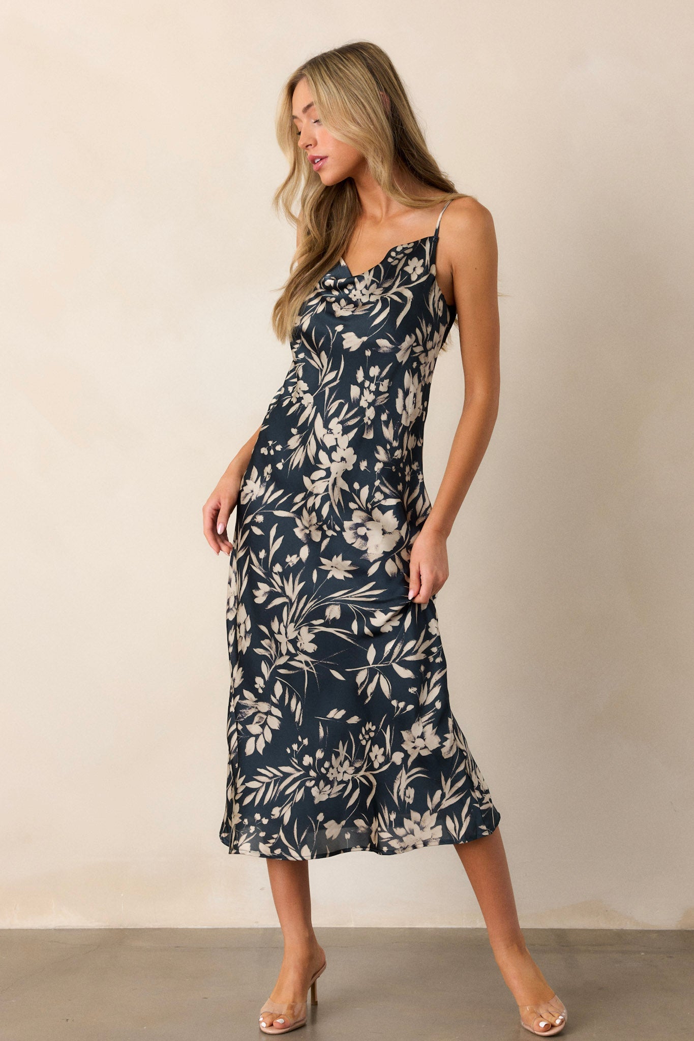 Elevate your wardrobe with our Botanical Escape Dark Teal Floral Satin Midi Dress. This stunning dark teal dress, with its beautiful floral design, will make you stand out in any occasion. The midi length adds sophistication while the satin material adds a touch of luxury. This dark teal dress features adjustable spaghetti straps, a cowl neckline, ivory floral print, and midi length.