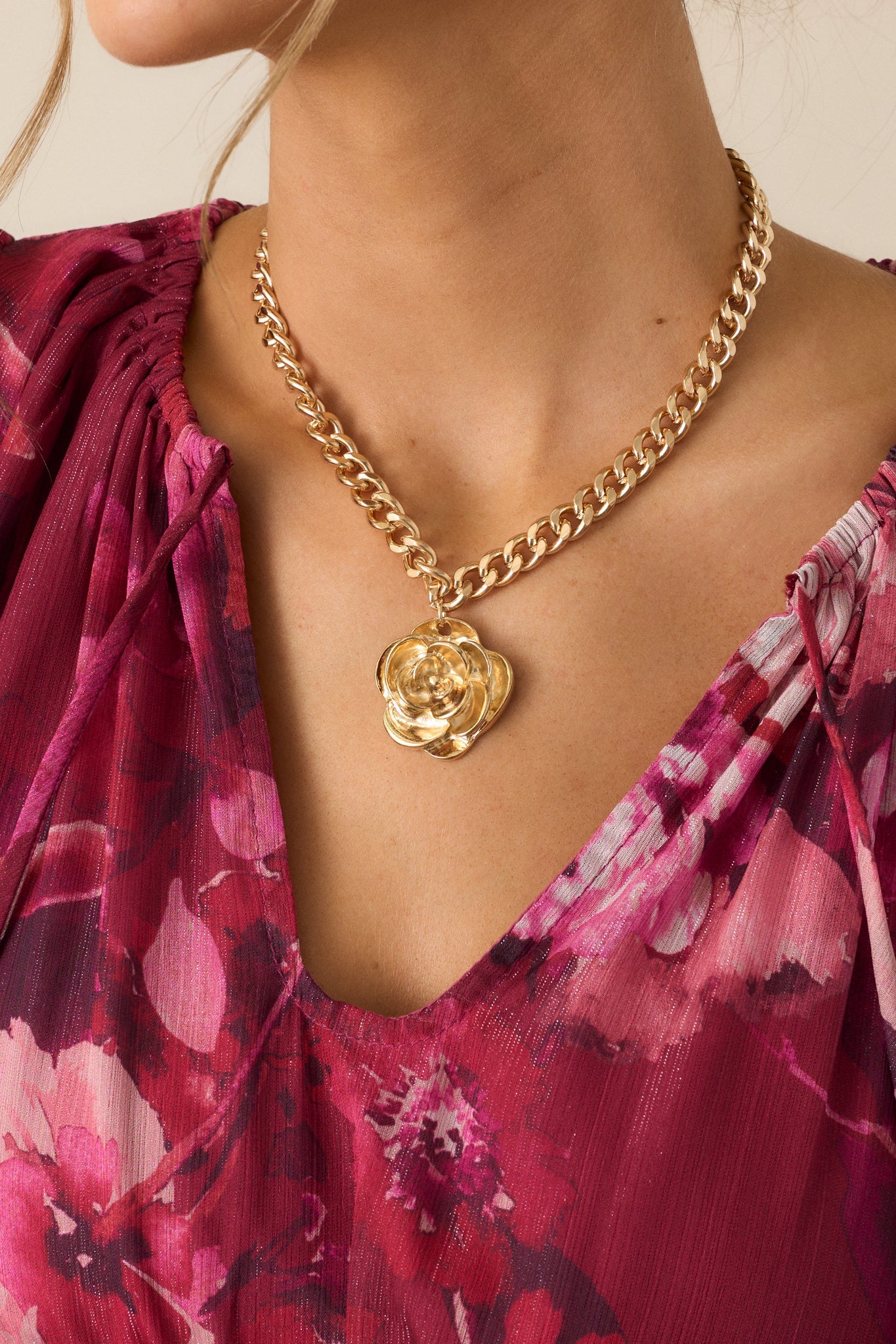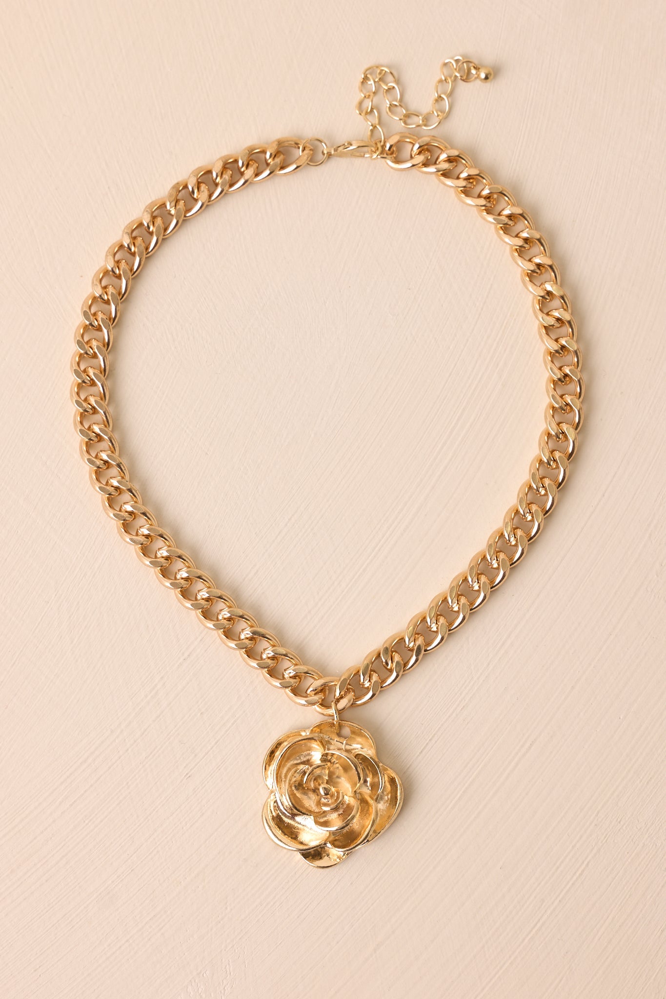 Unlock the beauty within you with our Breaking Through Gold Flower Pendant Necklace! Featuring a stunning gold flower pendant, this necklace will add a touch of elegance to any outfit. Perfect for any occasion, this necklace will make you shine and stand out from the crowd! This gold necklace features a thick gold chain, gold hardware, a large textured rose pendant, and a lobster clasp closure.