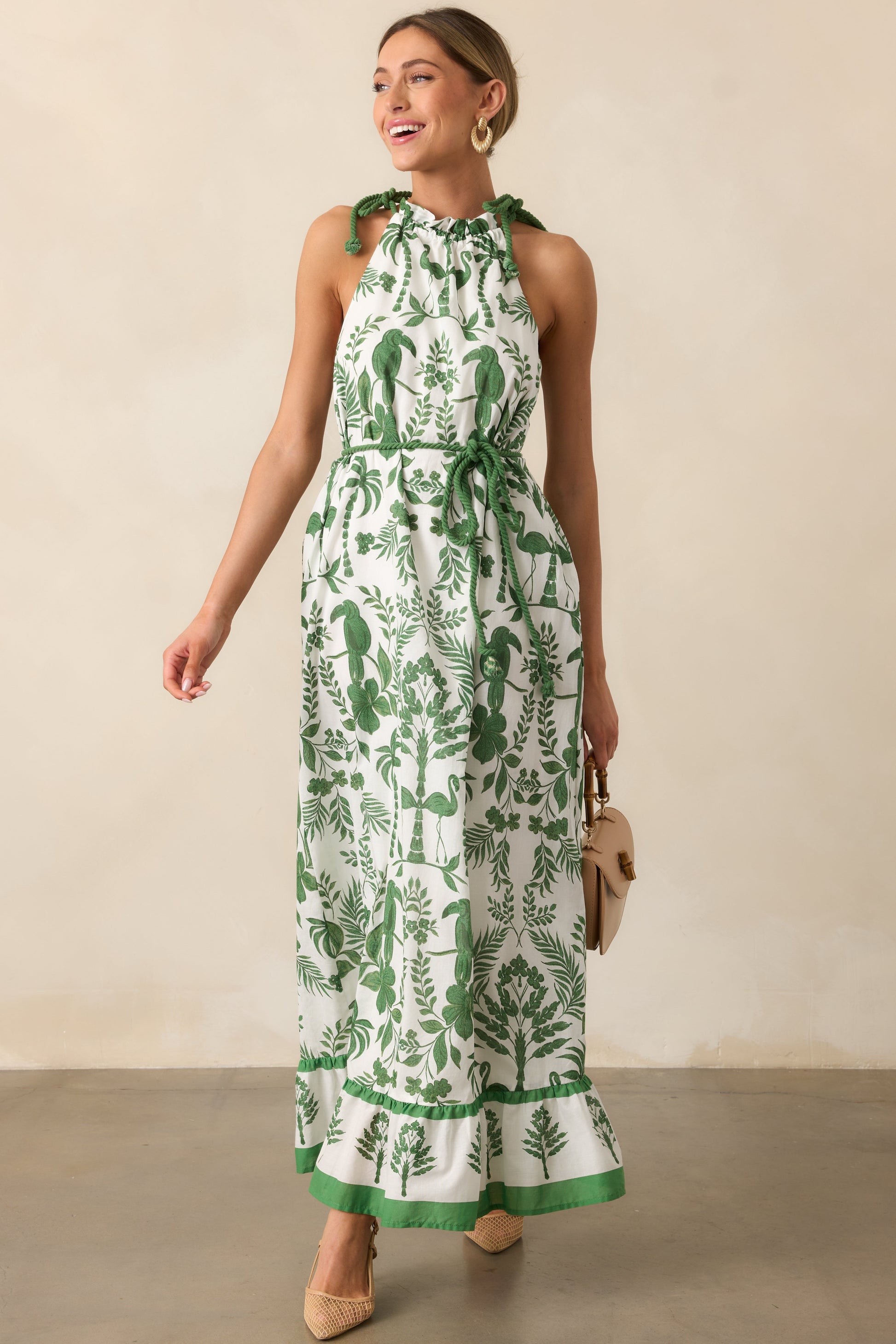 Stay cool and chic in our Breeze Through Paradise 100% Cotton Green Tropical Print Maxi Dress! This playful dress features a vibrant tropical print and flowy silhouette, perfect for any beach getaway. Say goodbye to discomfort and hello to effortless style with this must-have piece. This green dress features a halter neckline with self tie nautical rope on each shoulder, a beautiful tropical print, self tie nautical rope belt, and relaxed maxi skirt.