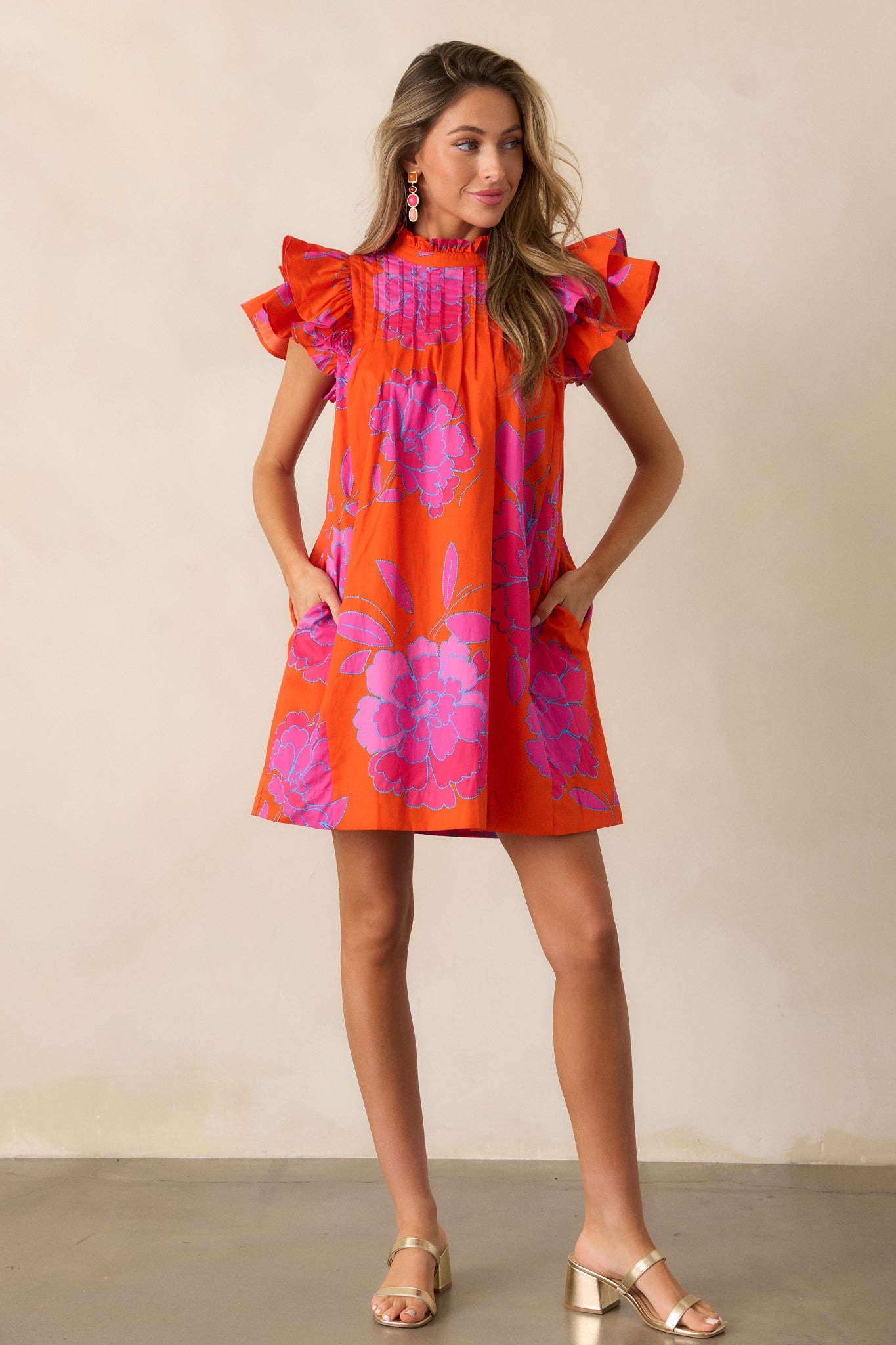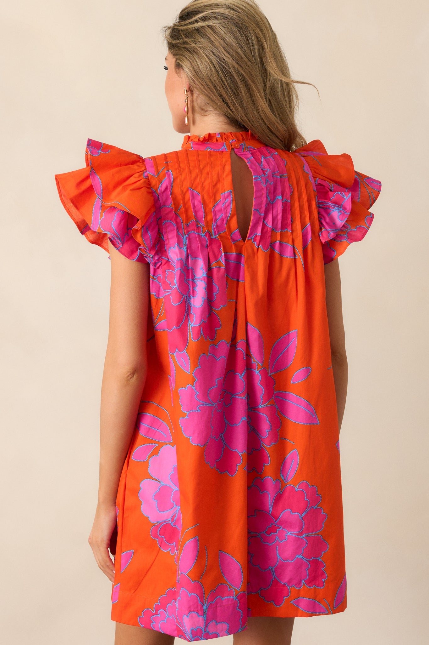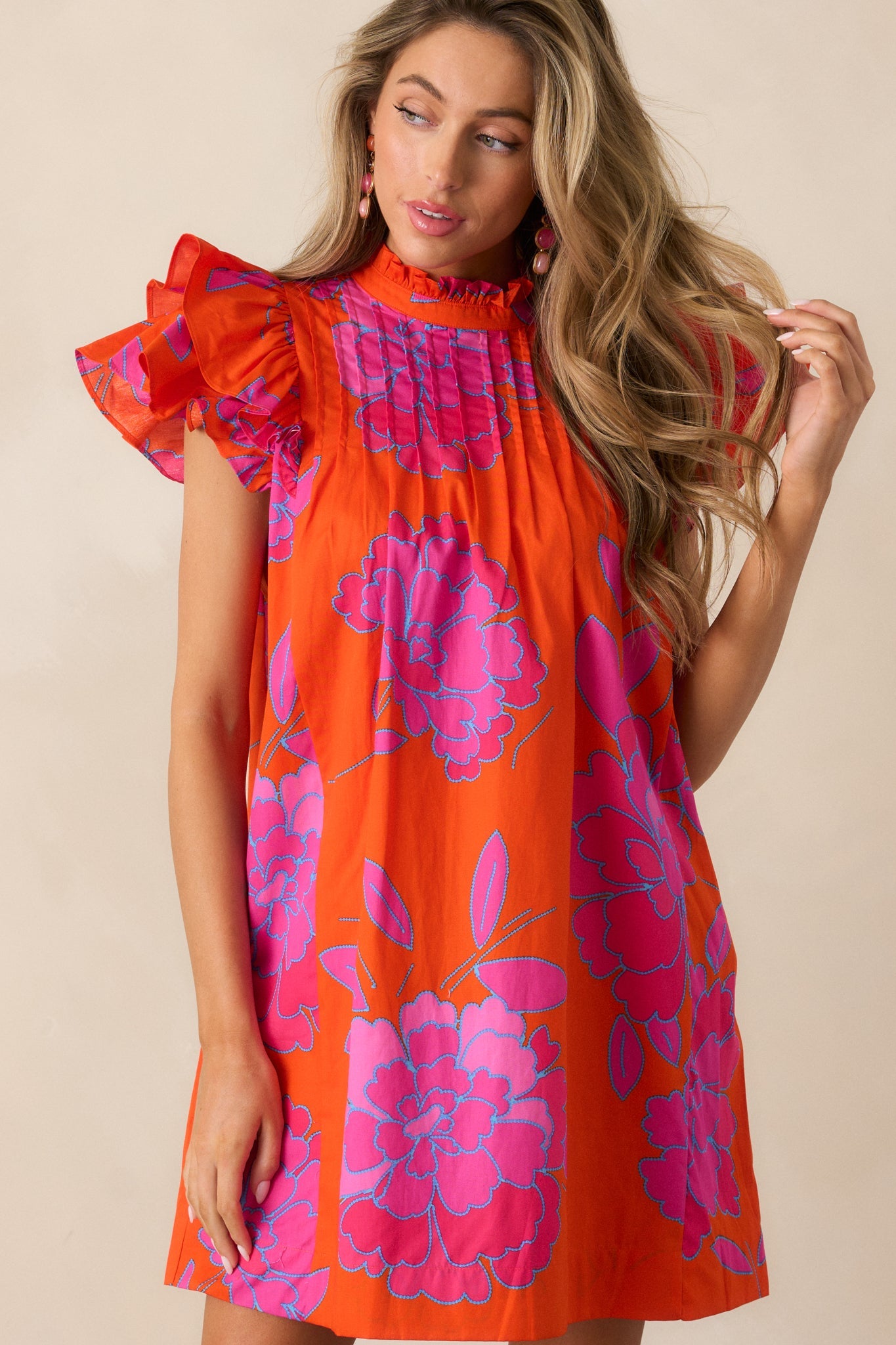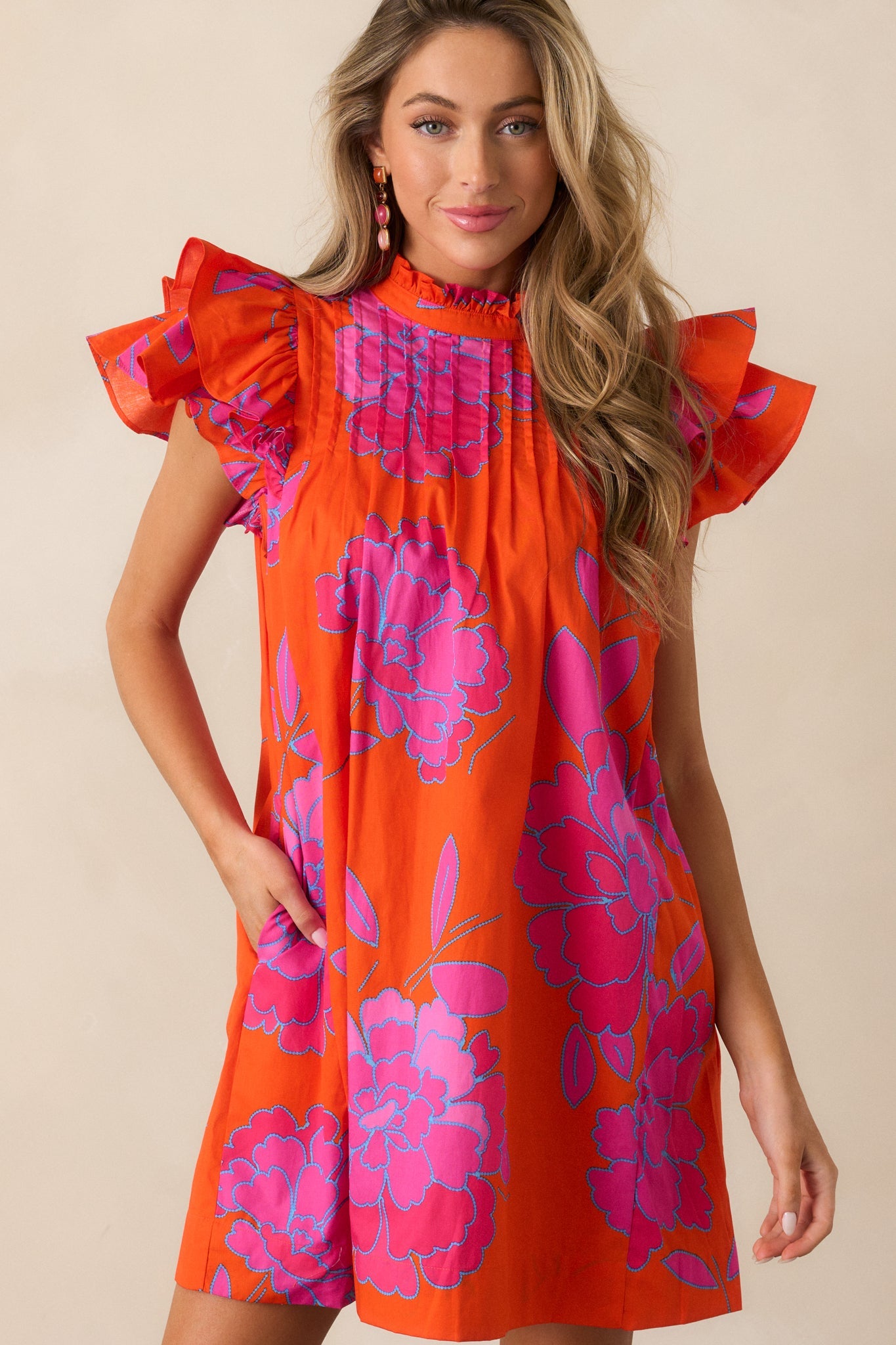 Experience the perfect blend of comfort and style with our Breezes And Blooms 100% Cotton Orange Flutter Sleeve Mini Dress! Made with 100% cotton, this dress is not only soft and breathable, but also features flutter sleeves for a touch of elegance. Stay cool and fashionable all day long. This orange dress features a high ruffled neckline, pleated yoke detailing, a relaxed fit, a keyhole button back, and short flutter sleeves.
