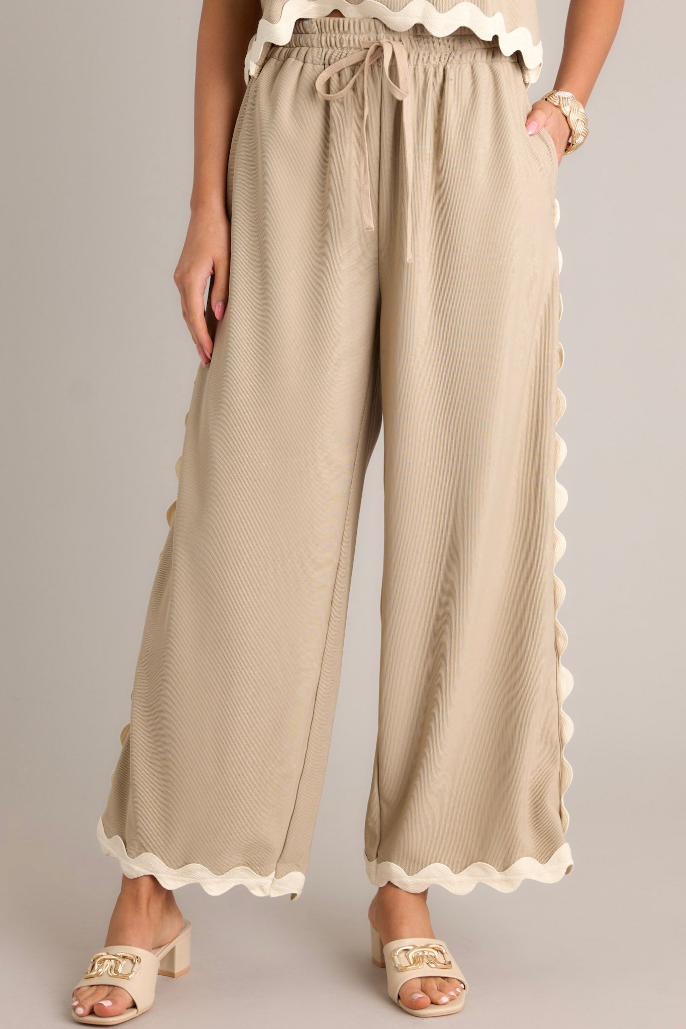 Get ready to breeze through your day with our Breezy Charm Taupe Ricrac Pants! These stylish pants not only feature a charming and unique ricrac pattern, but also provide the ultimate comfort and style. Say goodbye to boring pants and hello to a fun and playful look! These taupe pants feature a high waisted design, an elastic waistband, a self-tie drawstring, functional hip pockets, a ribbed texture, and ricrac hemlines.
