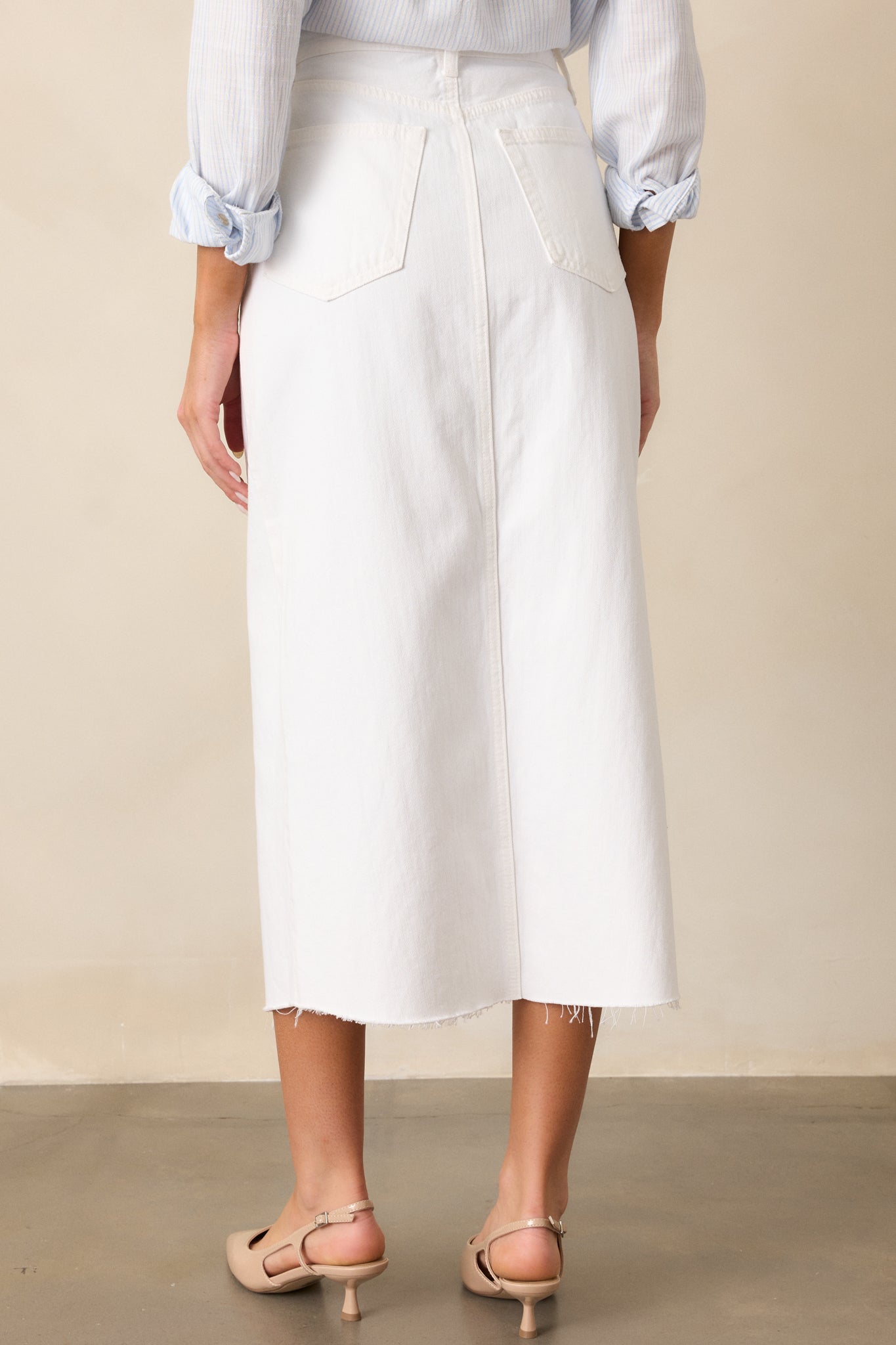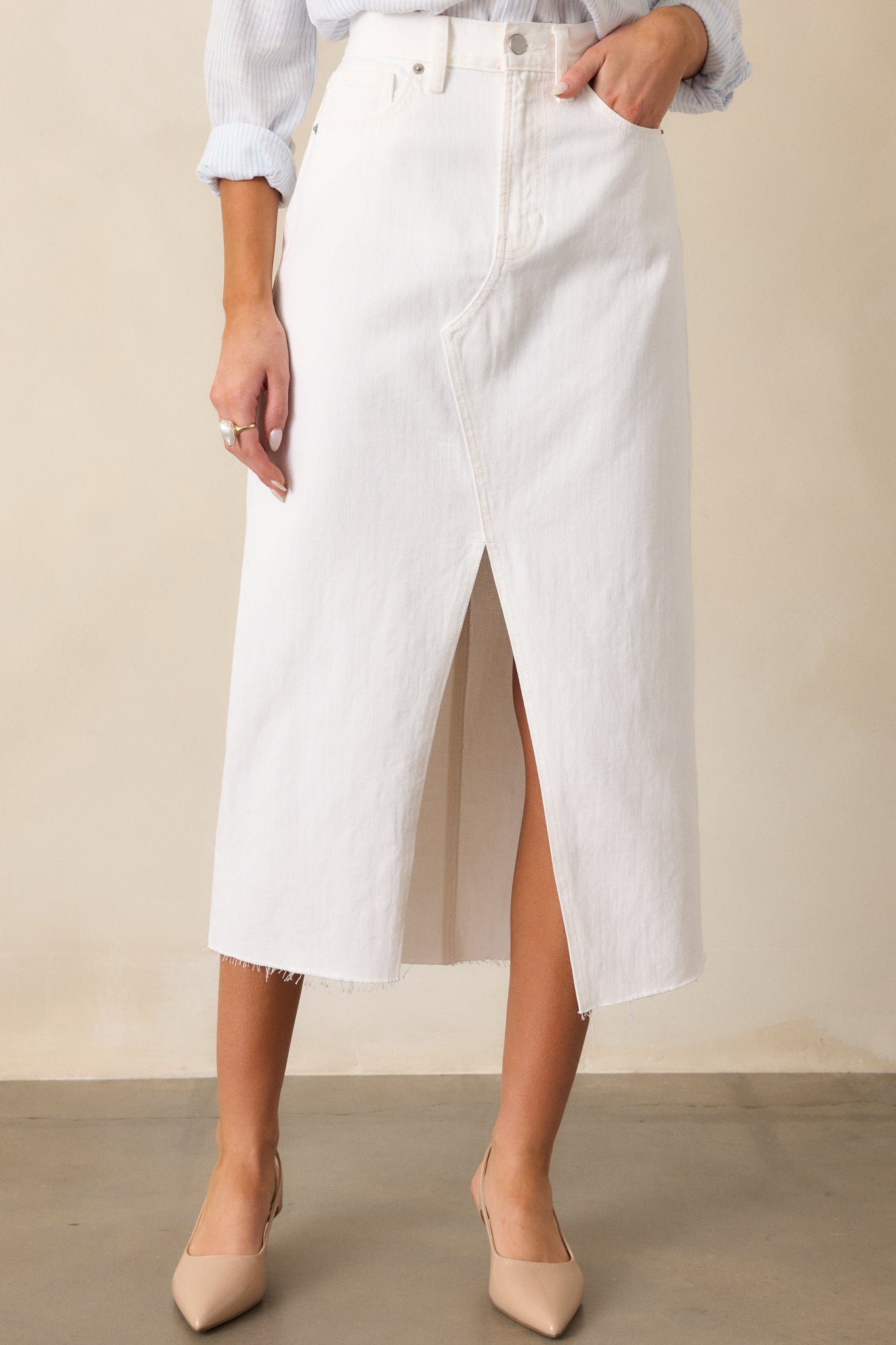 Start your day with a fresh, effortless look in our Bright Mornings White Denim Midi Skirt. Made with high-quality, stretchy denim for ultimate comfort and style. Timeless and versatile, this skirt pairs perfectly with any top. Make a statement with this must-have addition to your wardrobe. This white skirt features a high waisted design, functional belt loops, button and zipper closure, functional pockets, midi length, front slit, and raw bottom hem.