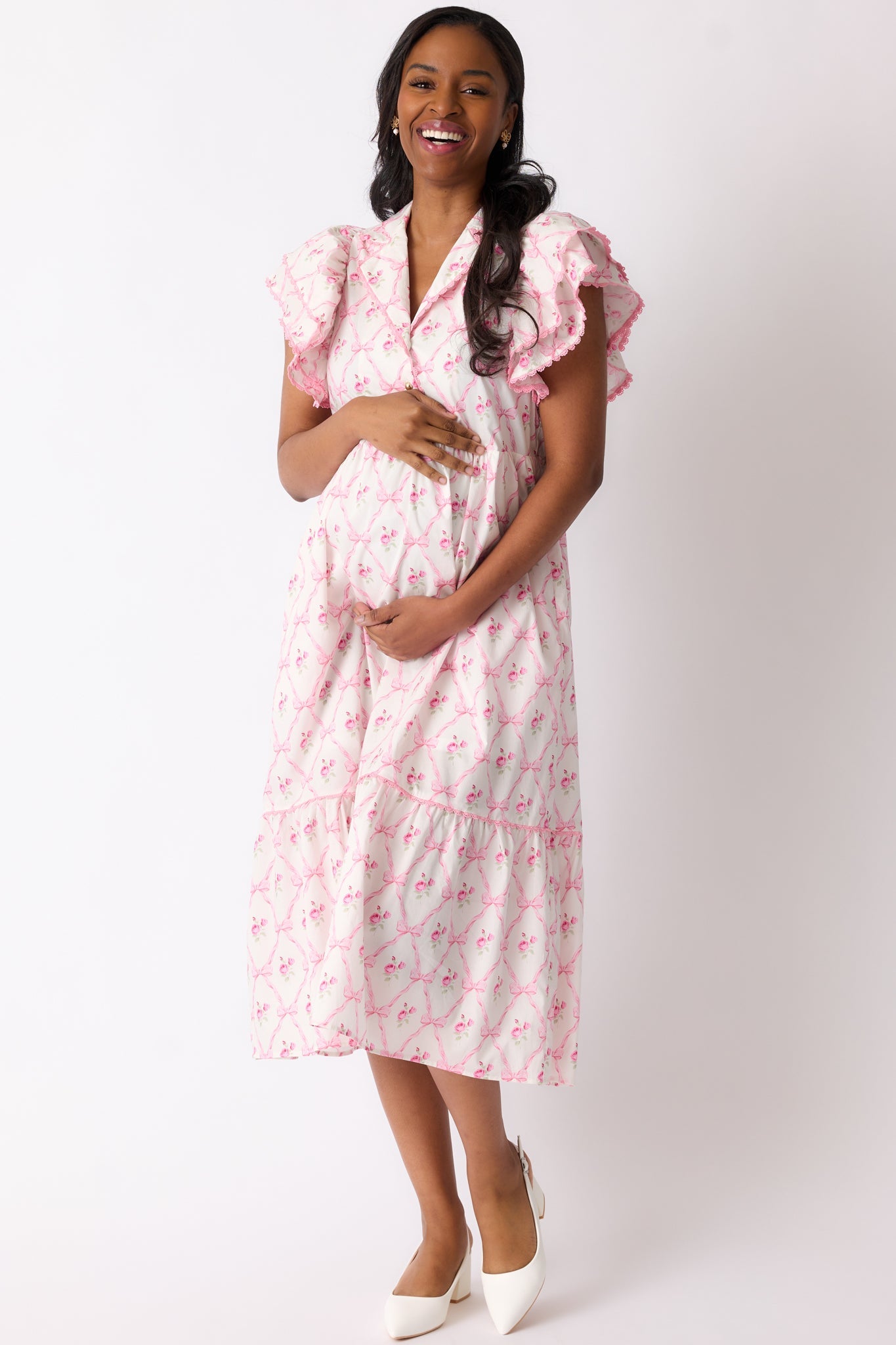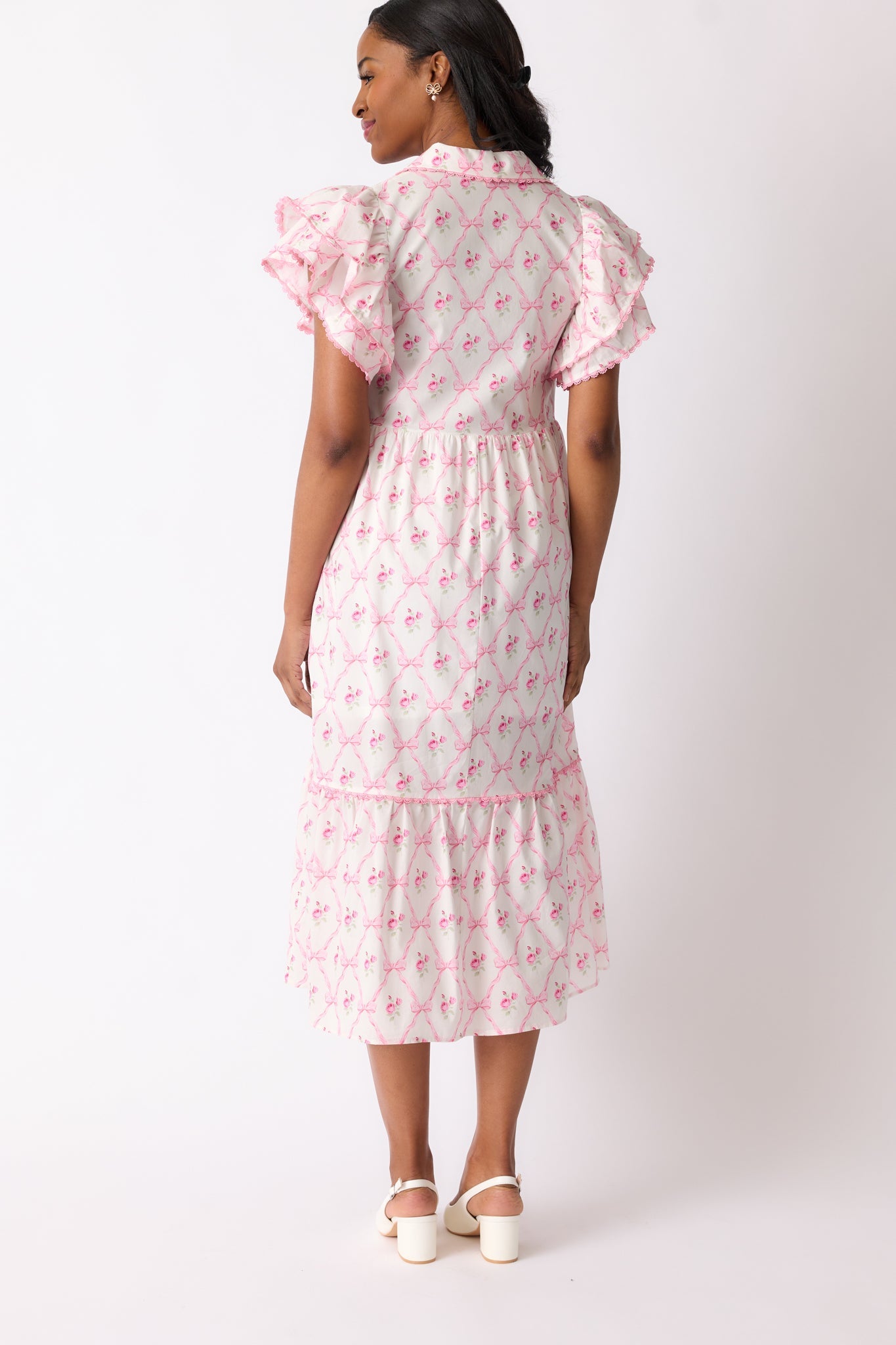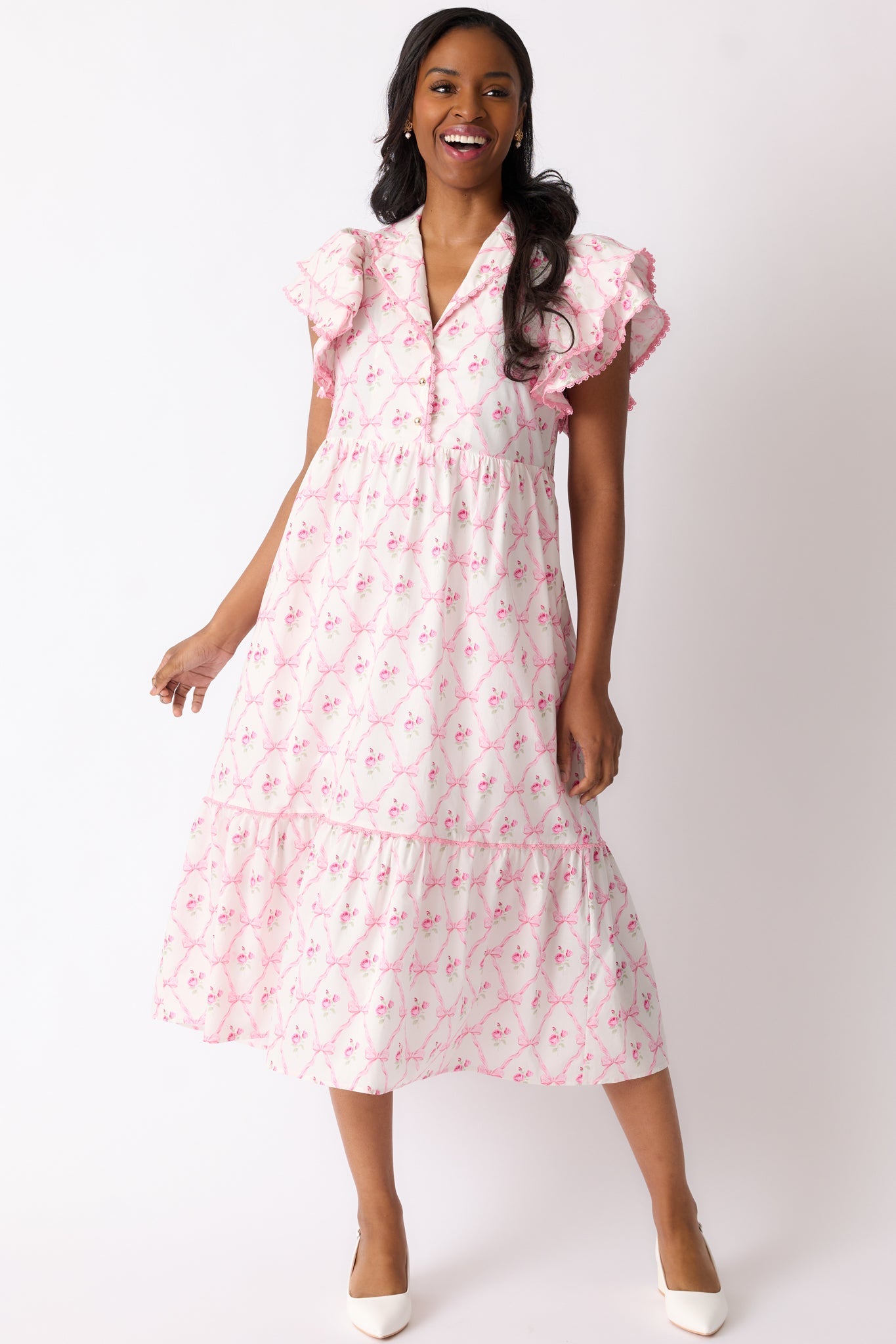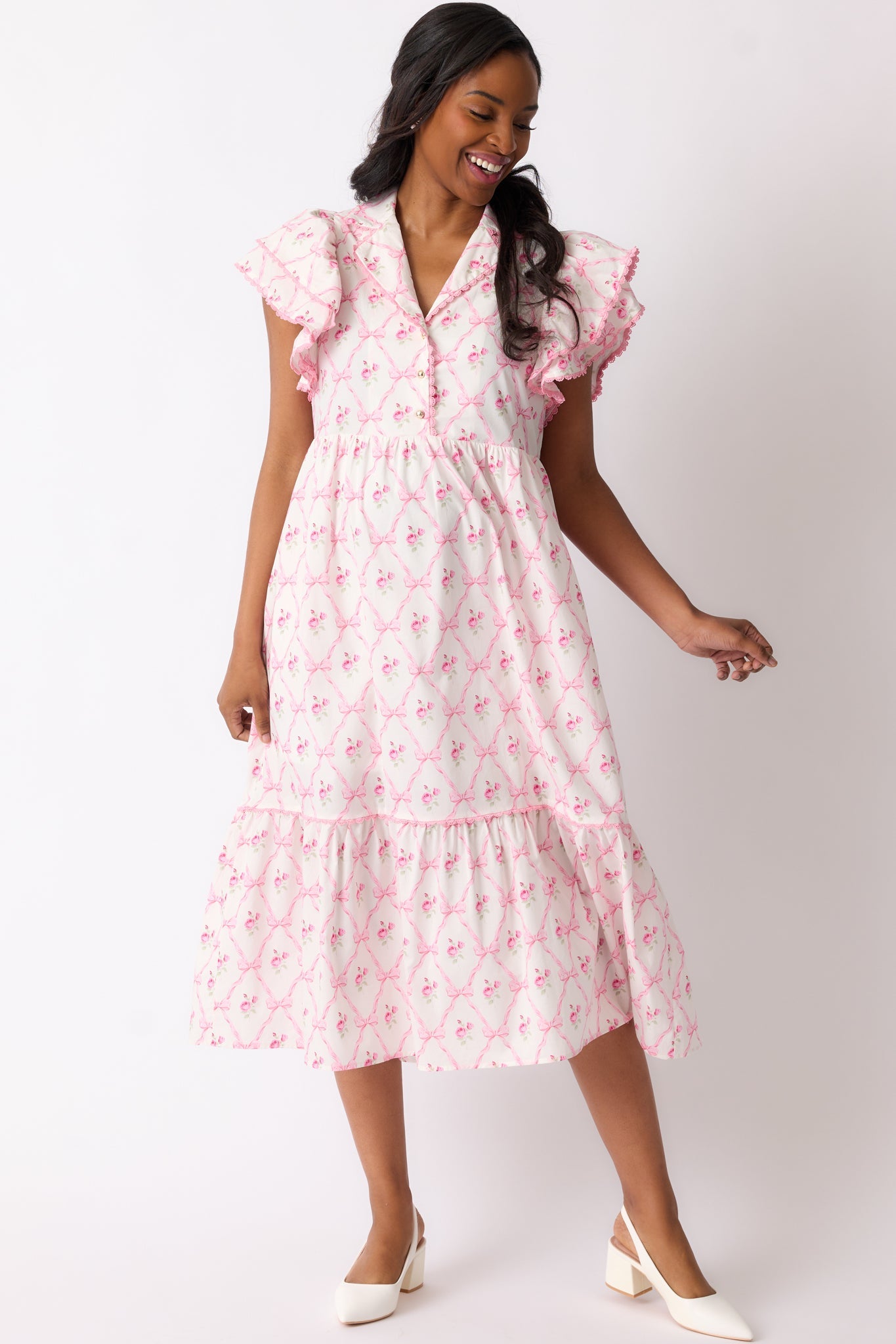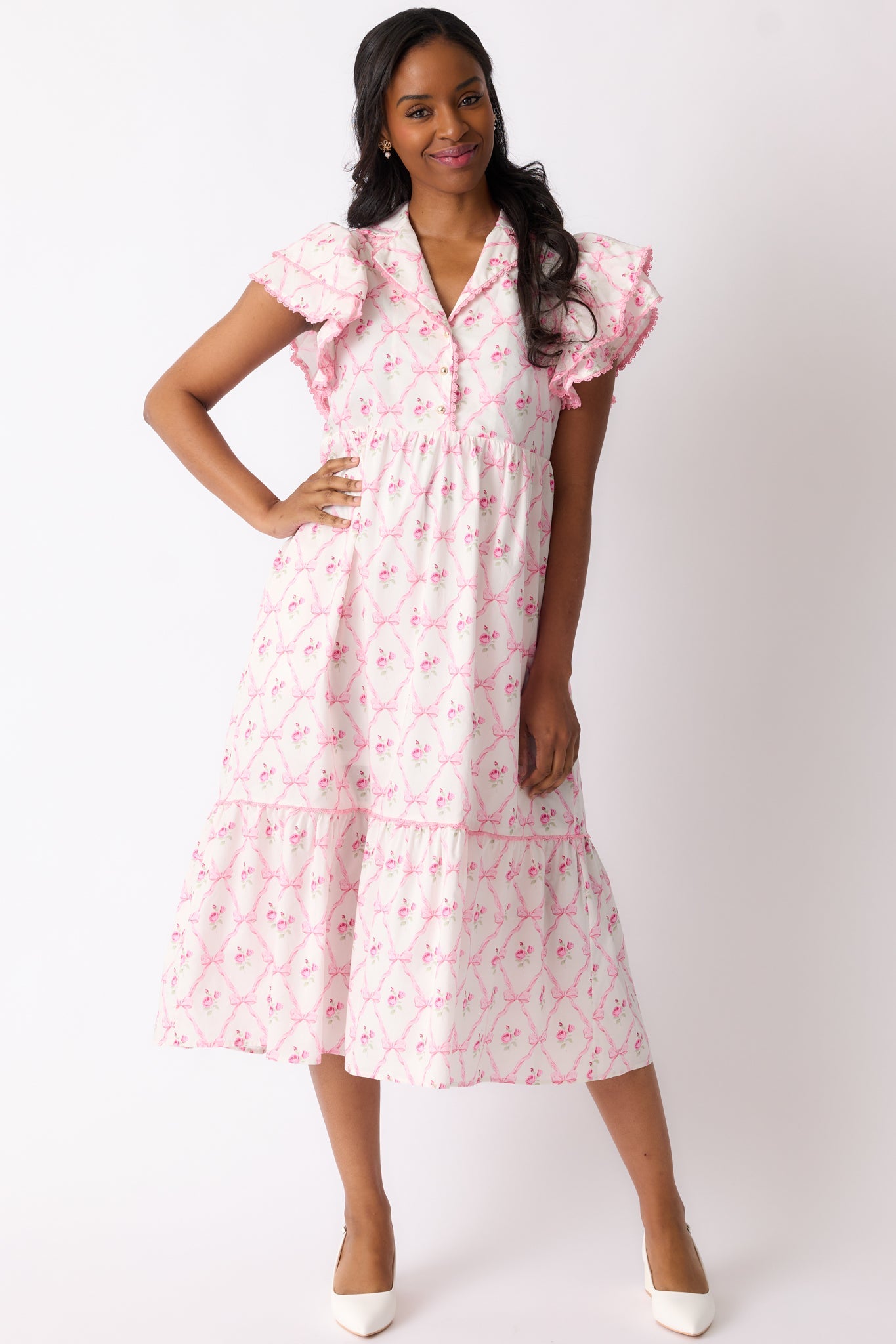 Flaunt a feminine and flowy look with our Brunch & Beyond Cotton Light Pink Floral Midi Dress! The delicate floral pattern adds a touch of elegance, perfect for any occasion. Enjoy the comfortable and lightweight material as you effortlessly make a statement. A must-have for your wardrobe! This light pink dress features a collared neckline, button front detailing, pink trim, a floral bow pattern, midi length, and flutter sleeves.