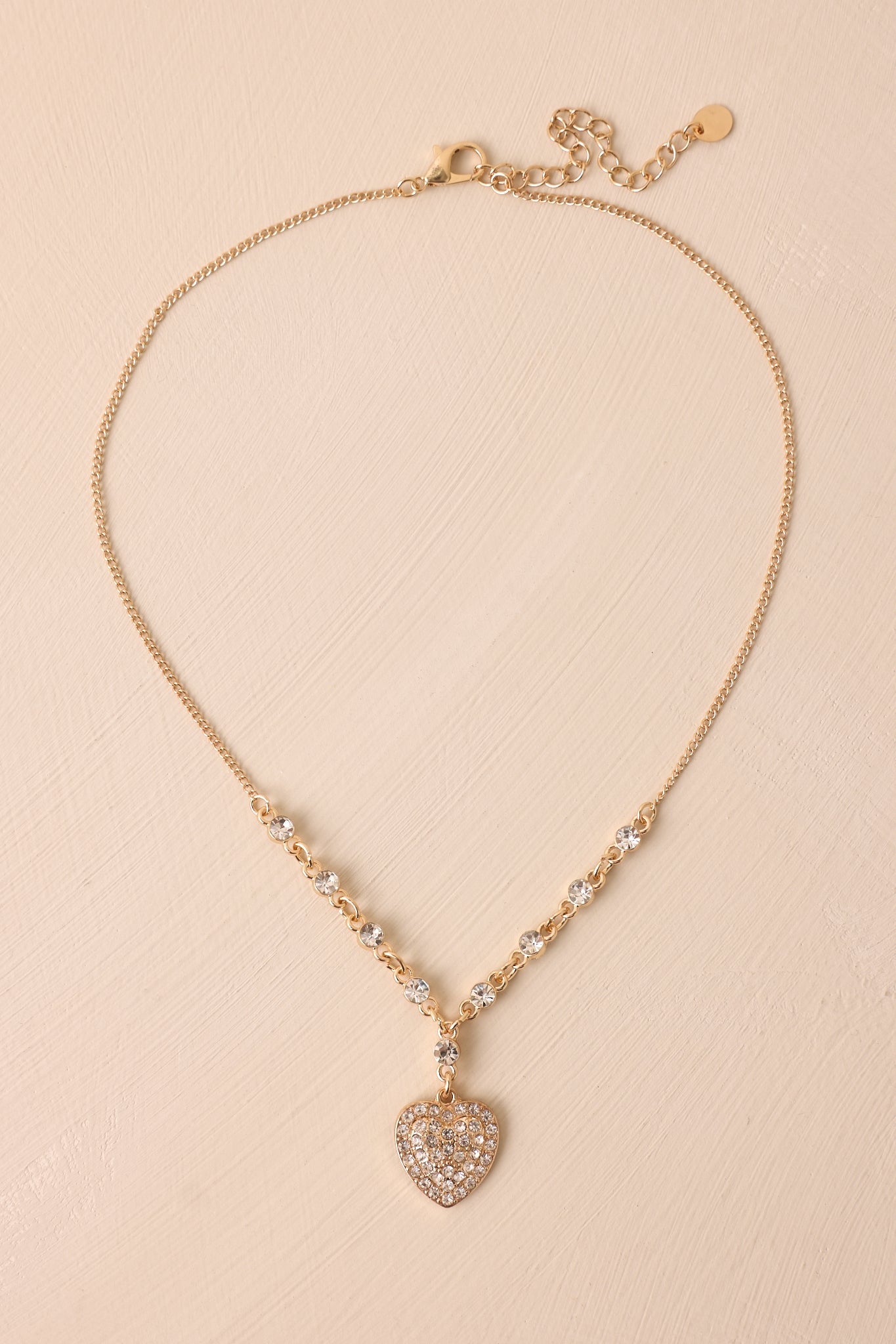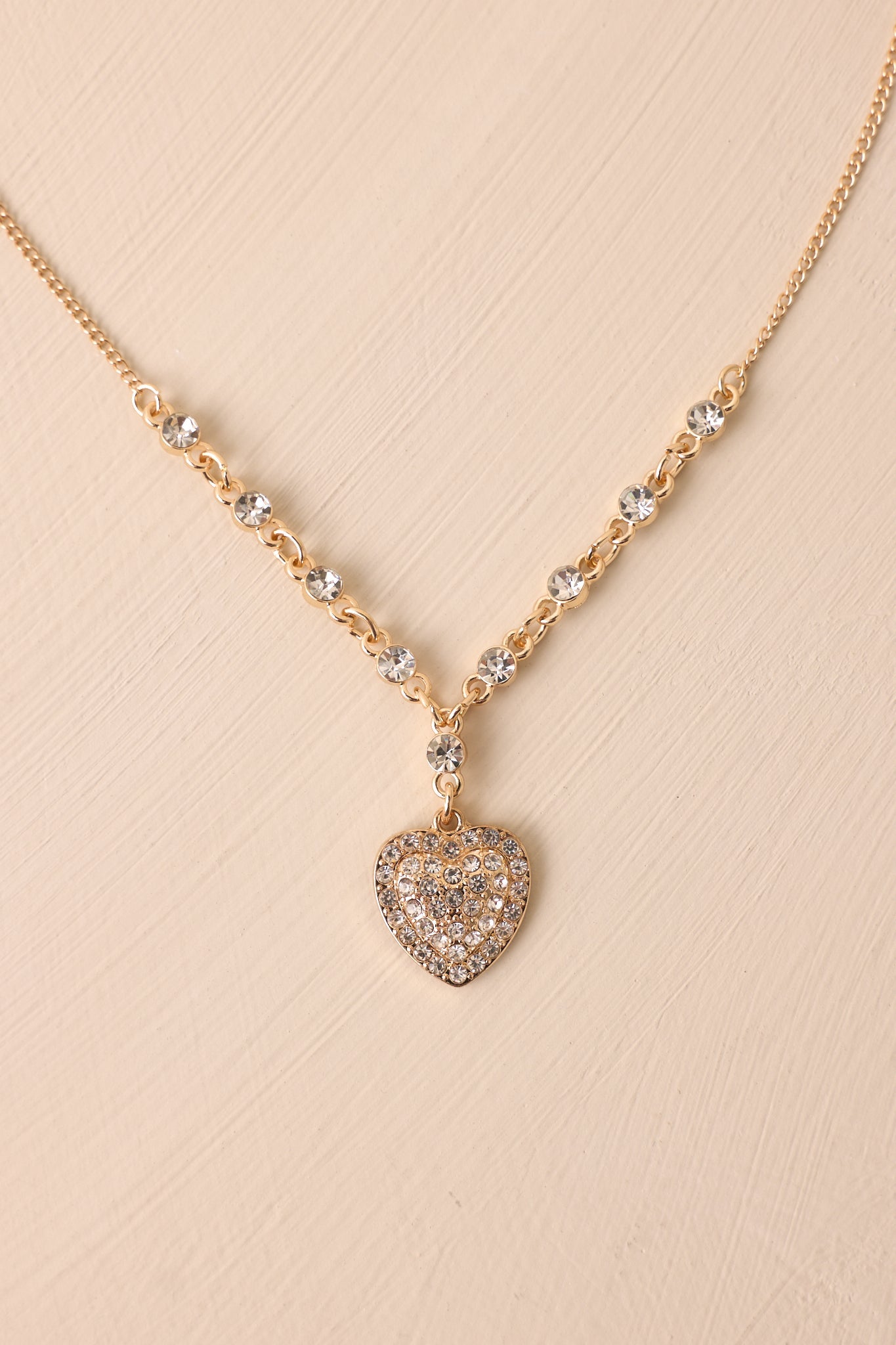 Spread the love with our Burning Love Rhinestone Heart Pendant Necklace. This elegant accessory is sure to add a touch of romance to any outfit. The sparkly rhinestones will catch the eye and the delicate heart design symbolizes affection and devotion. Perfect for date nights, weddings, or just to show someone you care. This rhinestone heart necklace features a very thin gold chain, a small rhinestone and gold patterned chain, a gold heart pendant covered in rhinestones and a lobster claw closure.