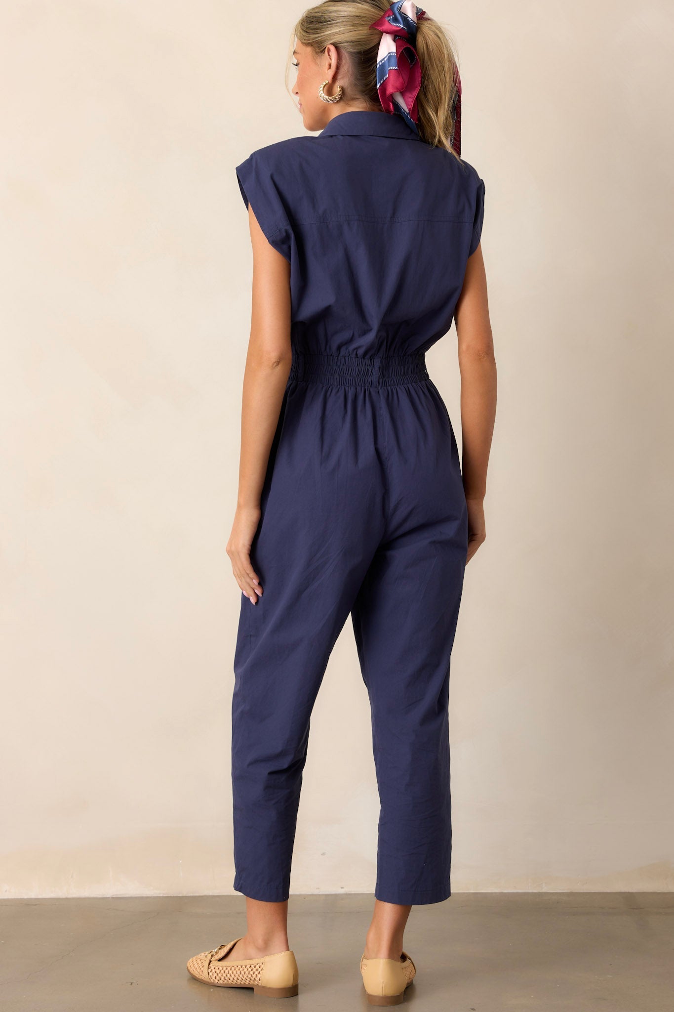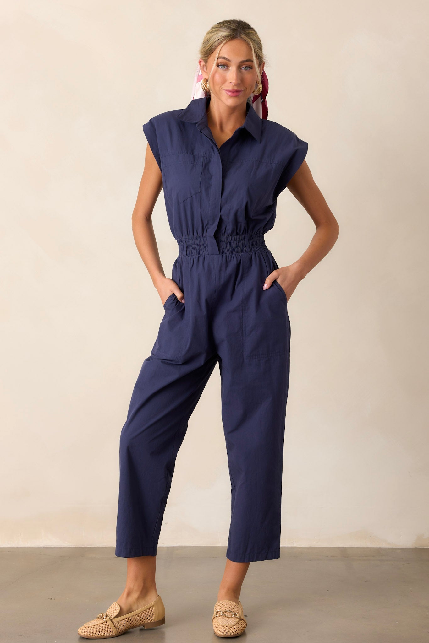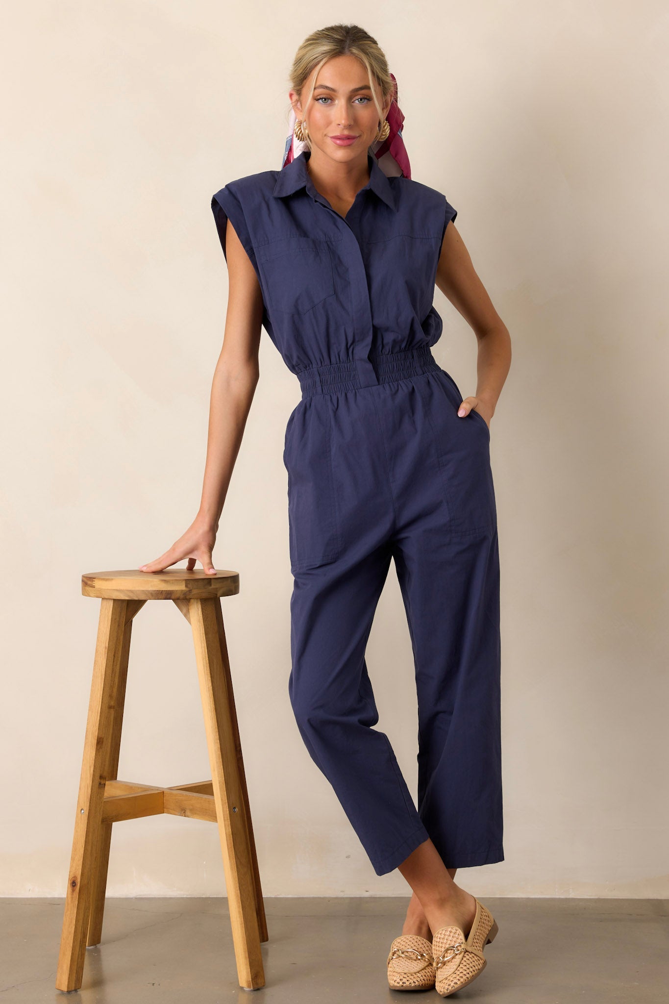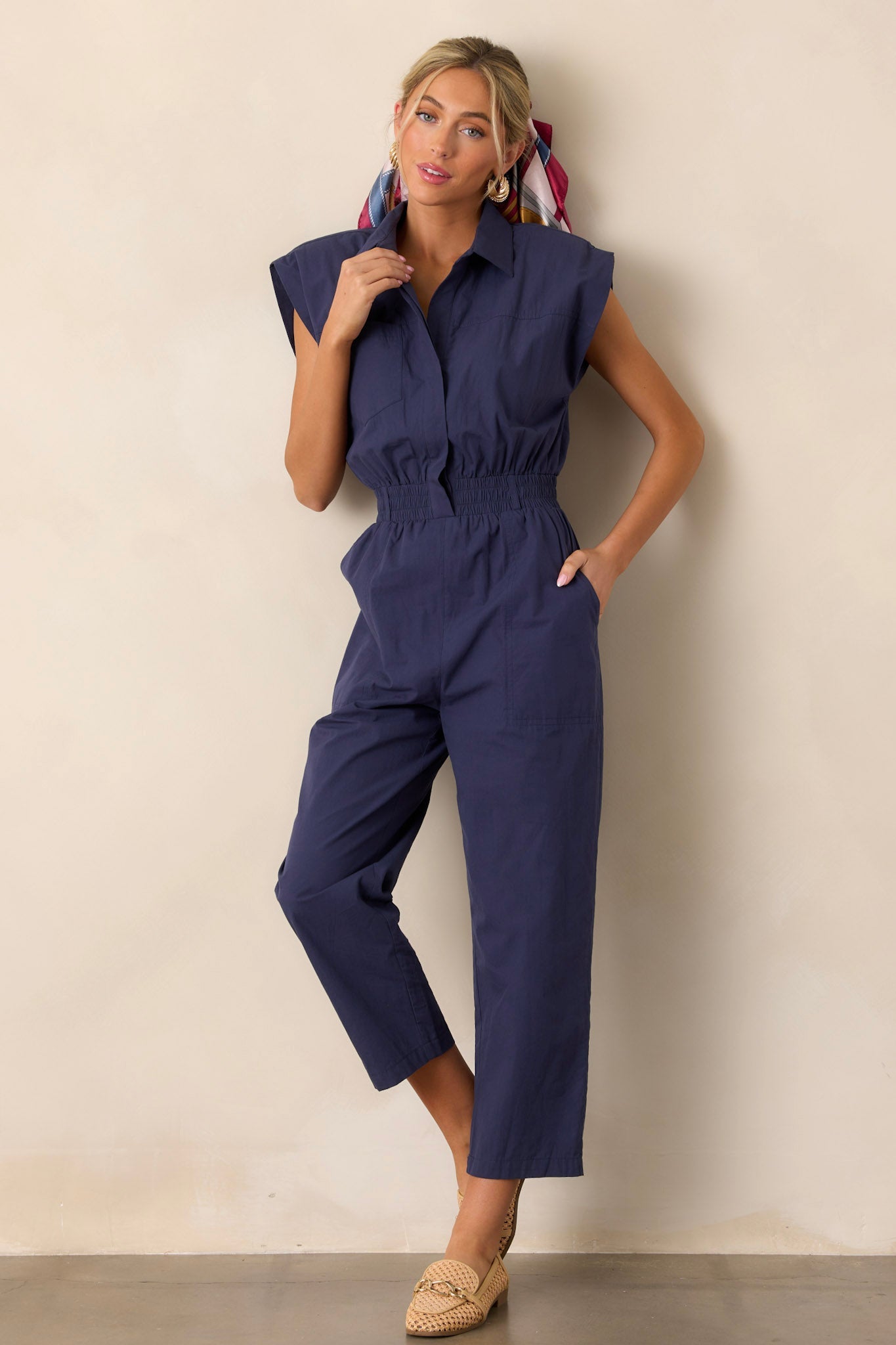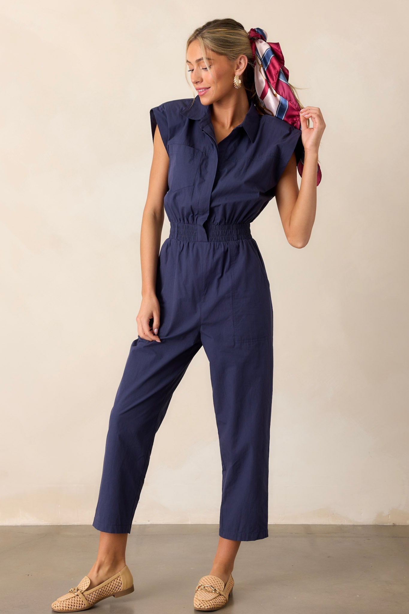 Embrace your adventurous spirit with our But A Dream Navy 100% Cotton Cargo Jumpsuit. Its navy color adds a touch of elegance, while its cargo style provides versatility and practicality. Take on new challenges and set your own trends with this bold wardrobe essential! This jumpsuit features two side pockets, a stretchy soft waistband and a popped collar.