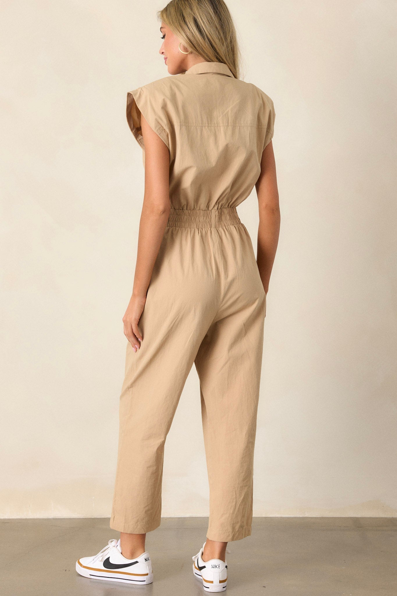 Embrace your adventurous spirit with our But A Dream Taupe 100% Cotton Cargo Jumpsuit. Its taupe color adds a touch of elegance, while its cargo style provides versatility and practicality. Take on new challenges and set your own trends with this bold wardrobe essential! This jumpsuit features two side pockets, a stretchy soft waistband and a popped collar.
