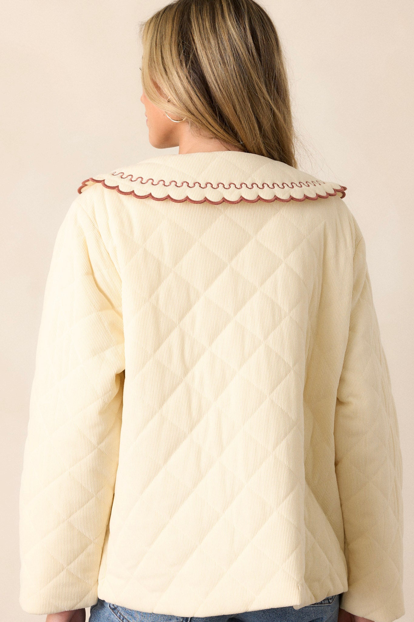 Stay stylish and warm this season with our Cafè Conversations Ivory Embroidered Quilted Jacket. Made with high-quality materials, this jacket is both cozy and chic. Perfect for any occasion, it features a unique ribbed design and a trendy collared neckline. Embrace comfort and fashion with this must-have jacket. This champagne jacket features a large scalloped collar neckline with brown embroidery detailing, a functional snap button front, functional hip pockets, and a ribbed quilted fabric.