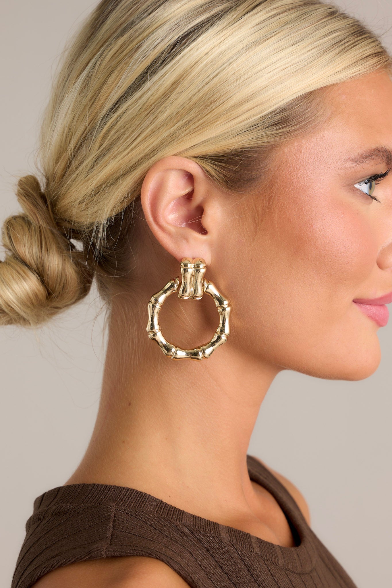 These California Stars Gold Drop Hoop Earrings will add a touch of effortless elegance to any outfit. Made with high-quality materials, these earrings are durable and comfortable to wear. The unique design is eye-catching and versatile, allowing you to easily dress up or down. A must-have addition to your jewelry collection. These gold earrings feature textured gold hardware, a textured stud with a connected textured hoop, and secure post backings.