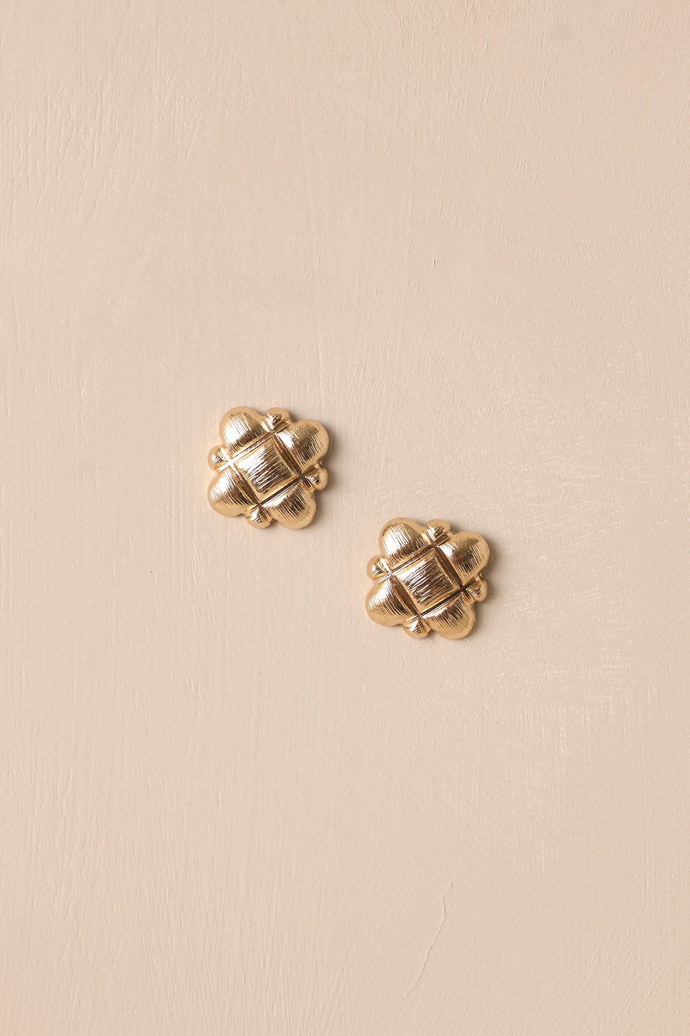 Shake up your earring game with our Call Back Vintage Gold Geometrical Earrings. These statement pieces feature unique geometrical designs, adding an unexpected twist to any outfit. With a touch of vintage charm, these earrings are the perfect accessory for those who like to stand out from the crowd. These gold earrings feature a geometric pattern with a square in the middle surrounded with semi-circles, a gold textured design and secure post backings.