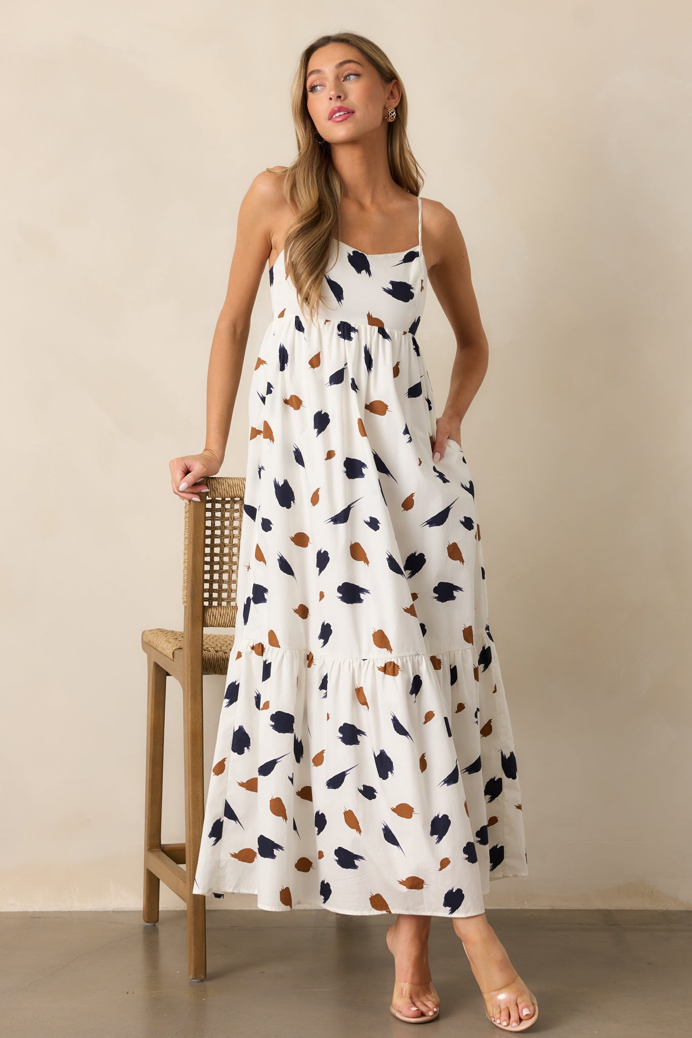 Make a statement in our Call The Shots Ivory Maxi Dress! Crafted from 100% cotton for a soft and comfortable feel, this dress is perfect for any occasion. With its flowing silhouette and flattering fit, you'll be sure to turn heads and feel confident with every step. This ivory dress features a slight v-neckline, a brown and navy brush stroke print, a smocked back panel, maxi length, and adjustable spaghetti straps.