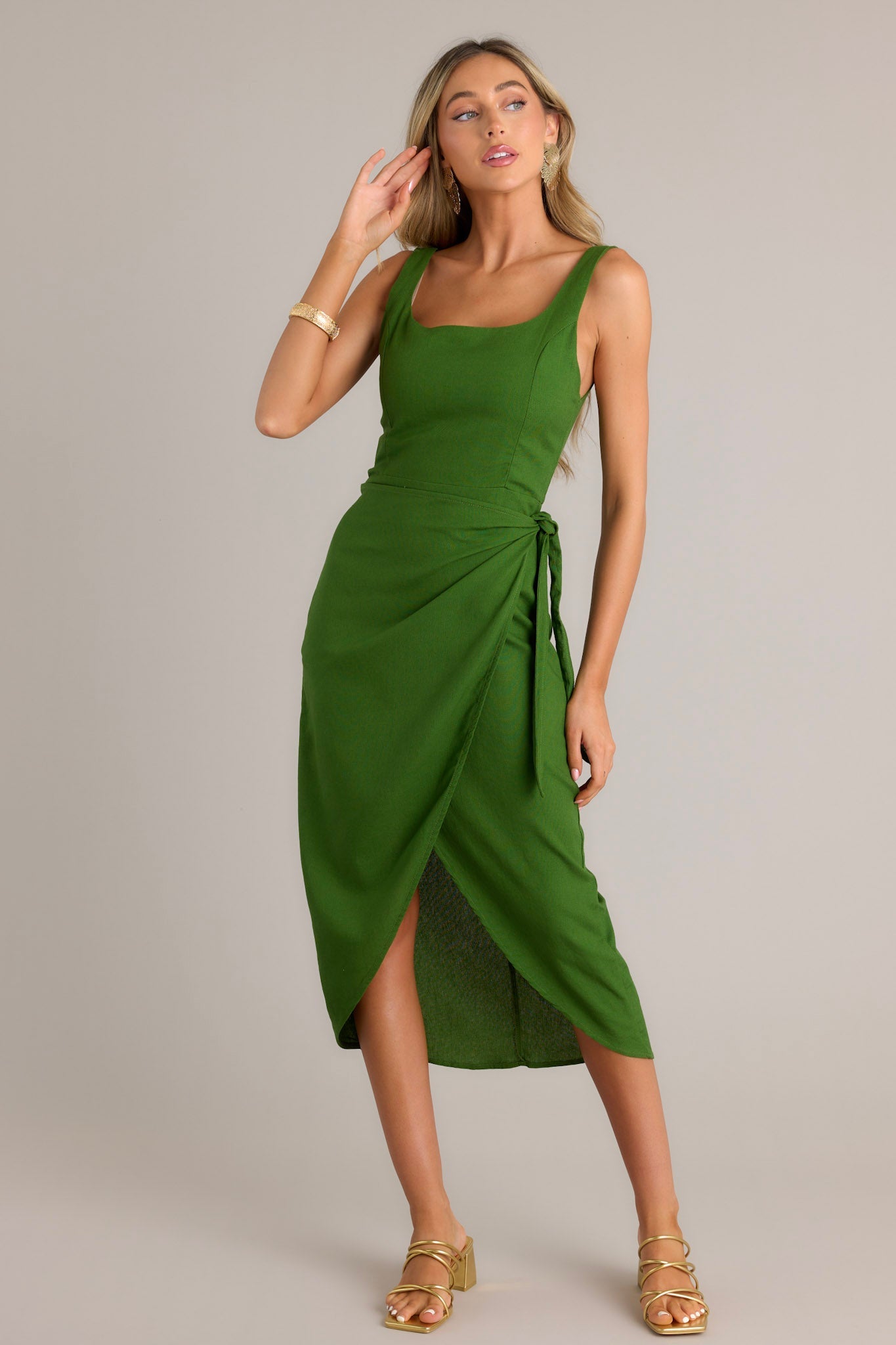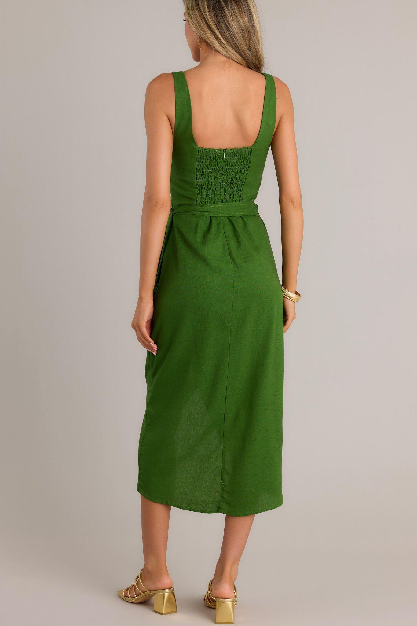 Express yourself with the Cardinal Couture Green Midi Dress! This playful dress features a vibrant red color that will make you stand out from the crowd. With its flattering midi length and comfortable fit, it's perfect for any occasion. Show off your unique style with this dress! This green midi dress features a square neckline, thick straps, a smocked back insert, a discrete zipper, a self-tie wrap feature, and a front slit.