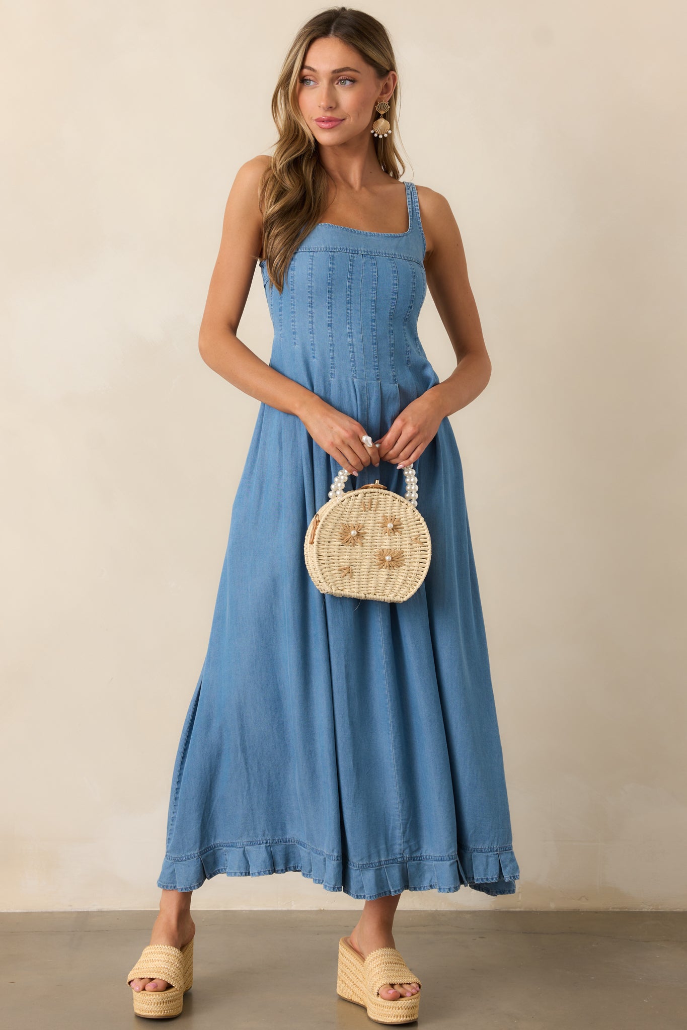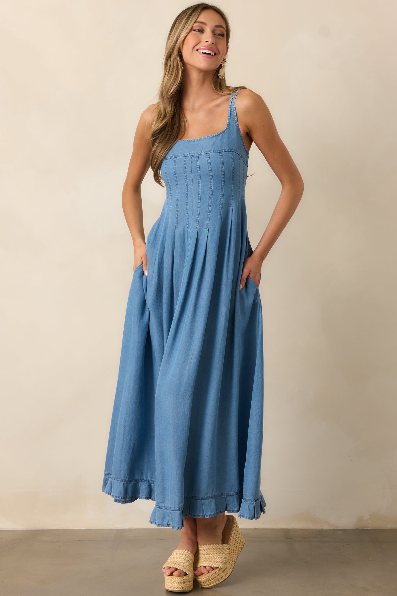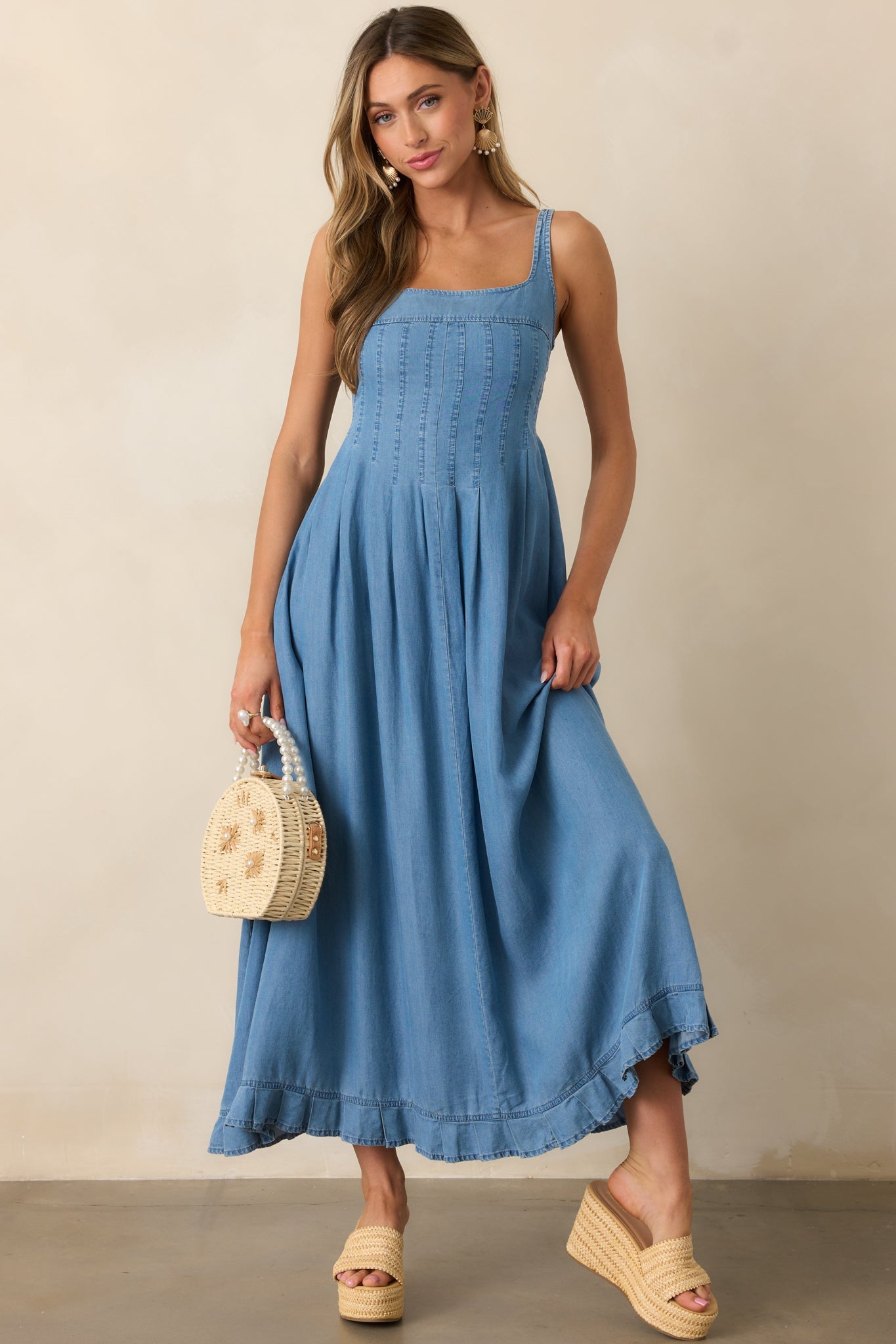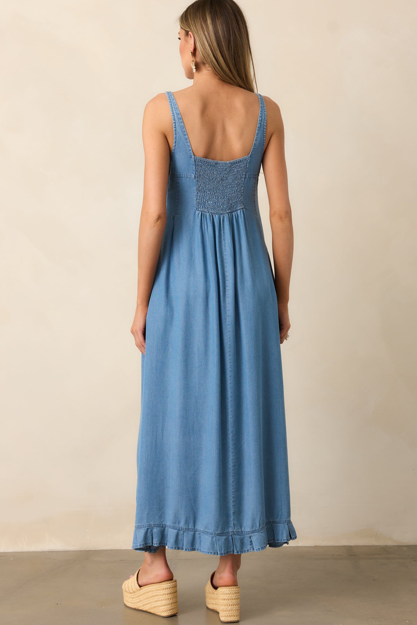 Get ready to turn heads in our Cascading Echoes Blue Chambray Maxi Dress. With its flowy silhouette and elegant cascading hemline, this dress is perfect for any occasion. The soft, lightweight chambray fabric offers comfort and style while the vibrant blue color adds a pop of color to your wardrobe. Elevate your look and confidence with this versatile and flattering maxi dress. This blue dress features a square neckline, corset detailing, smocked back, a-line skirt, pleated ruffle bottom seam detailing and a sleeveless design.