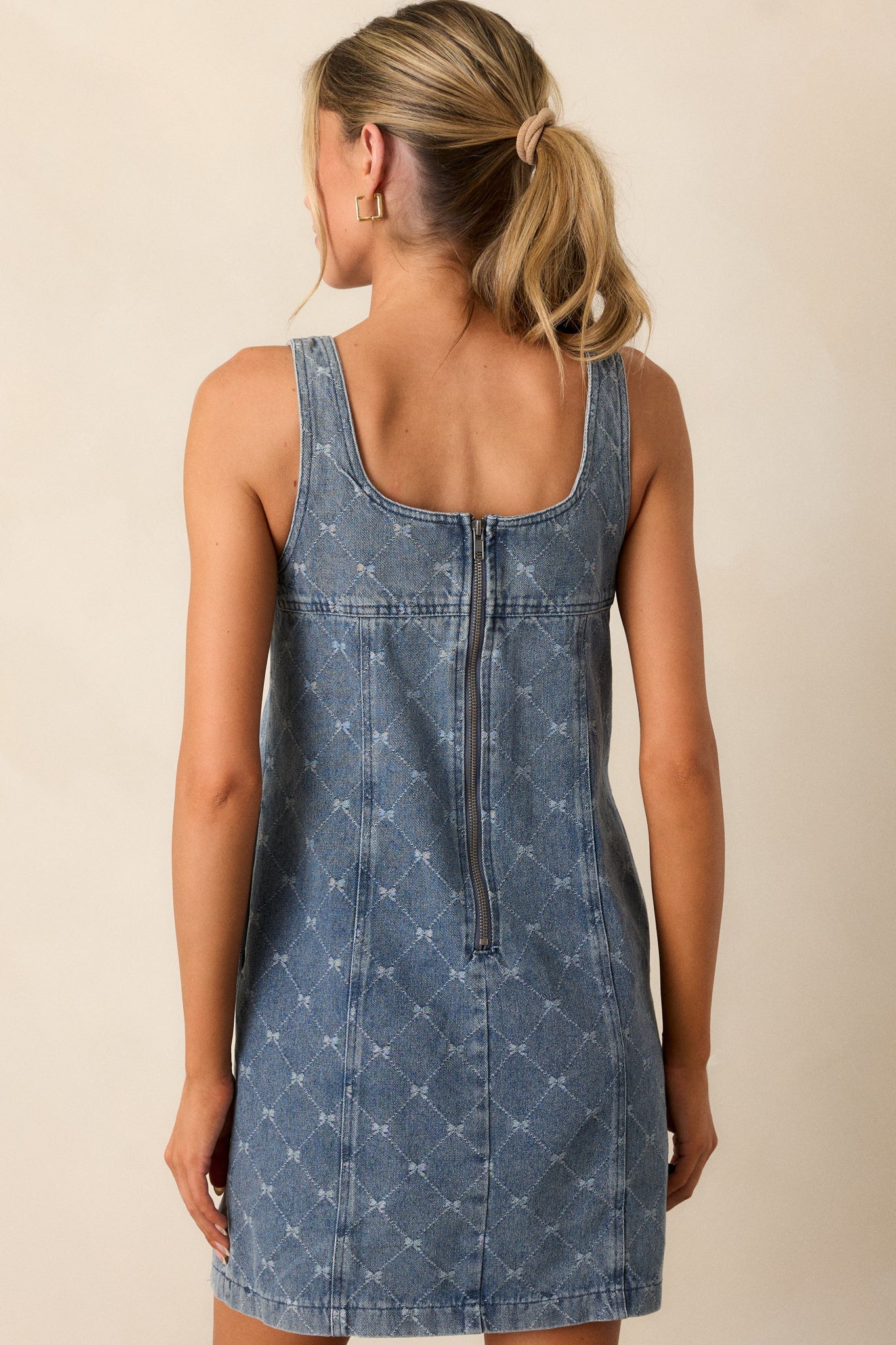Fall in love with our Caught Up Mini Shift Dress! This medium wash denim dress is the perfect combination of cute and casual. The mini length adds a playful touch, making it a versatile staple in your wardrobe. Dress it up or down for any occasion. A must-have for your next outing! This medium wash mini dress features a square neckline, an argyle bow print, a shift silhouette, a denim cotton blend fabric, and a sleeveless design.