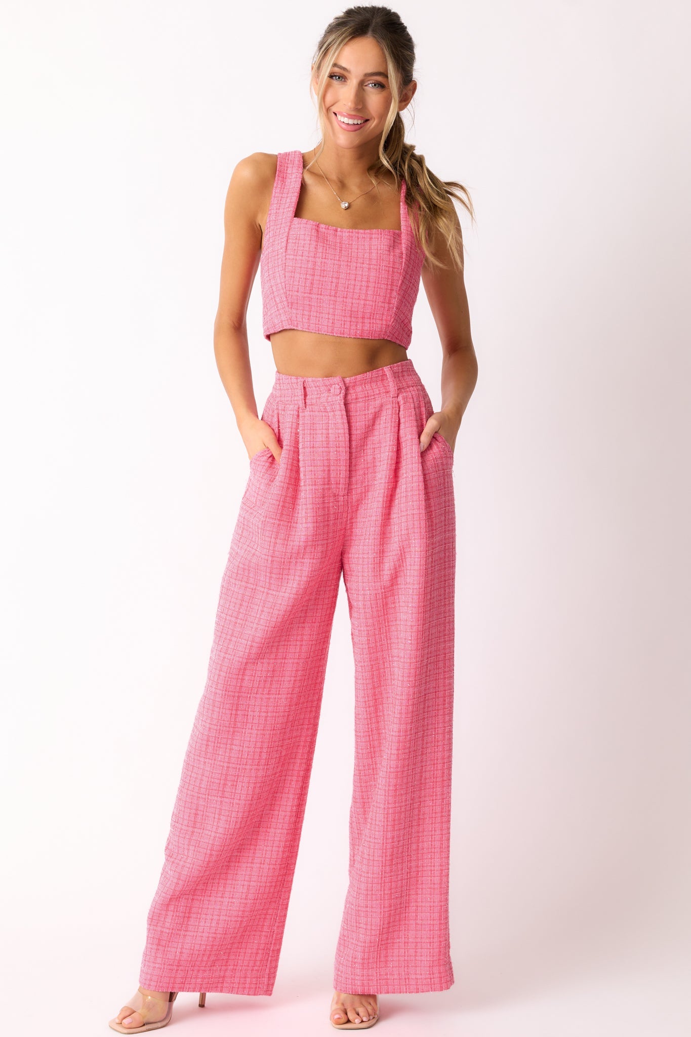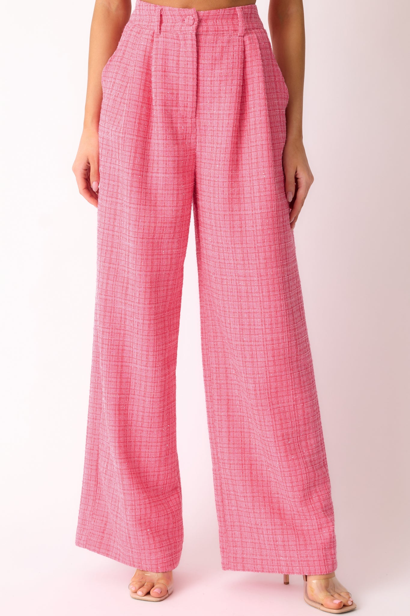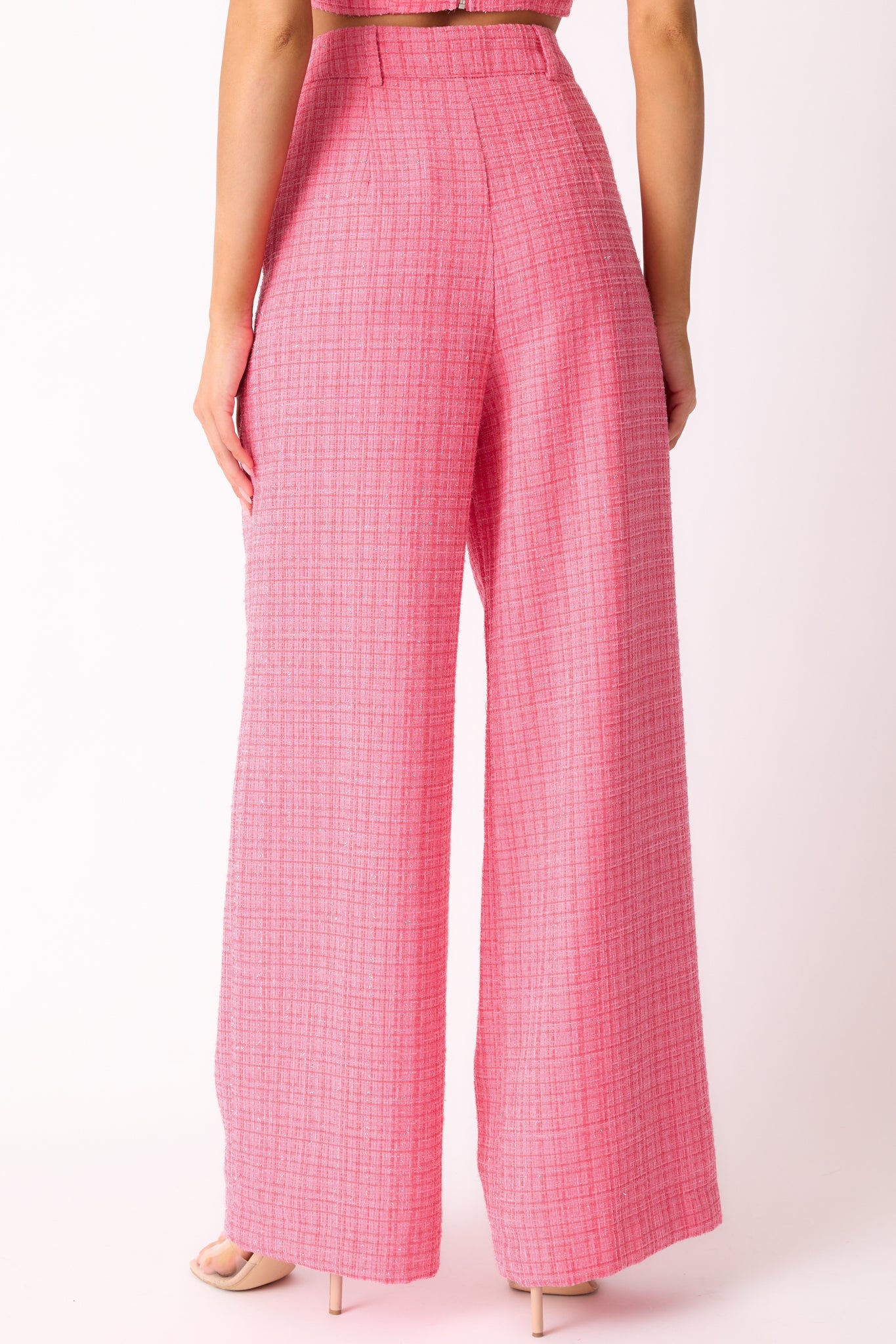 Chase the day in style with our fun Pink Tweed Wide Leg Pants! These pants offer a comfortable and chic option for any occasion. Embrace your inner fashionista and make a statement with every step in these wide leg pants. These pink pants feature a high waist design, shimmery tweed fabric, button and zipper closure, functional belt loops, functional pockets, and wide leg design.