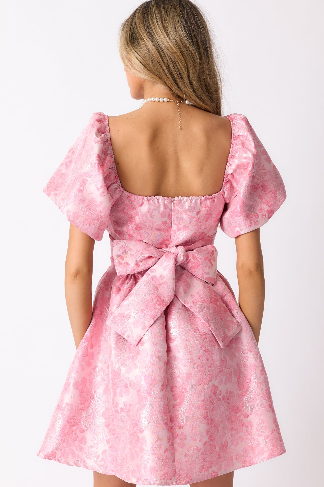 Celebrate life with the Cheers To Us Light Pink Floral Jacquard Mini Dress! Featuring a stunning floral jacquard fabric, this mini dress exudes elegance and femininity. The fun silhouette and slight sweetheart neckline flatter your figure, making you feel confident and beautiful. Perfect for any special occasion, this dress is a must-have in every fashion-forward wardrobe! This pink mini dress features a crossover sweetheart neckline, self tie pleated waistband, discrete back zipper, shimmery floral jacquard fabric, mini length and puff sleeve design.
