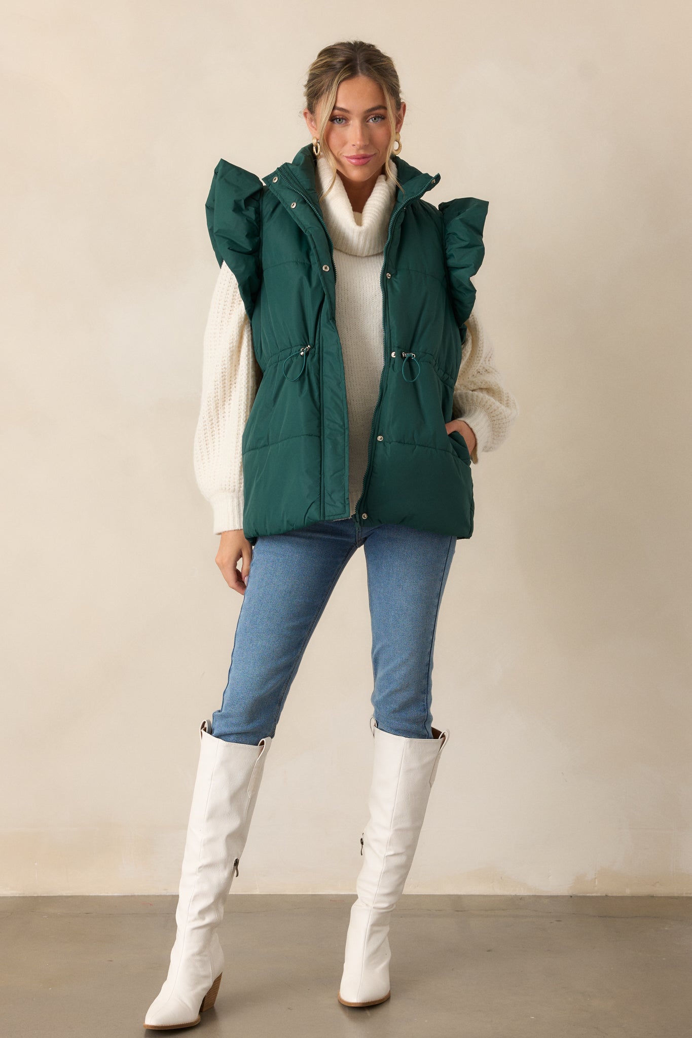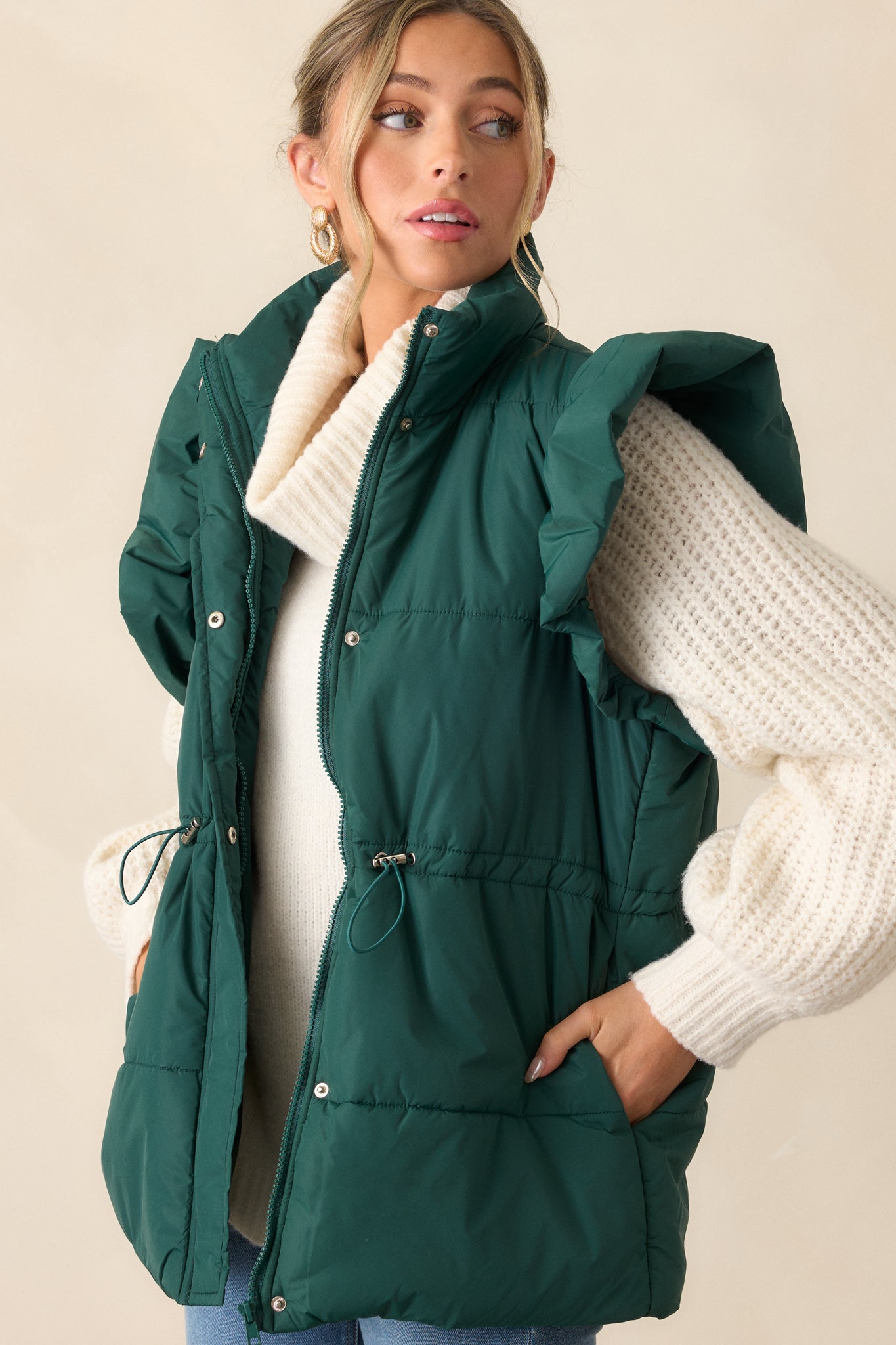 Add a touch of whimsy to your wardrobe with our Cherry on Top Forest Green Flutter Sleeve Puffer Vest! The flutter sleeves and puffer design provide both style and warmth, perfect for any season. With this vest, you'll be sure to stand out and make a statement. This forest green puffer vest features a high neckline, puffer line detailing, hidden snap button and zipper front, string cinch waist detailing with silver hardware, functional hip pockets and a fluffy flutter sleeve.