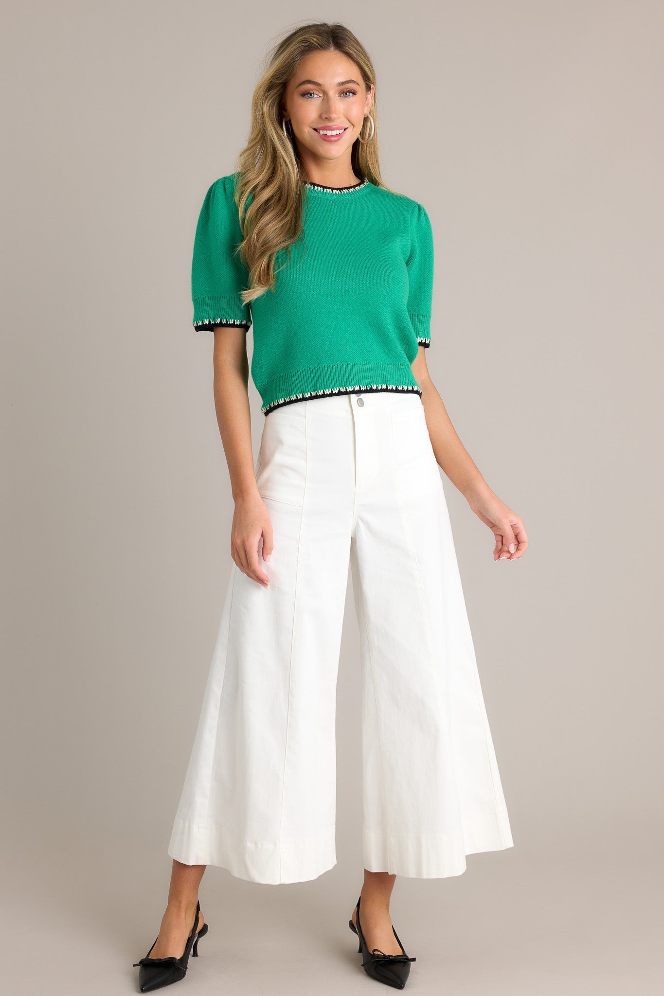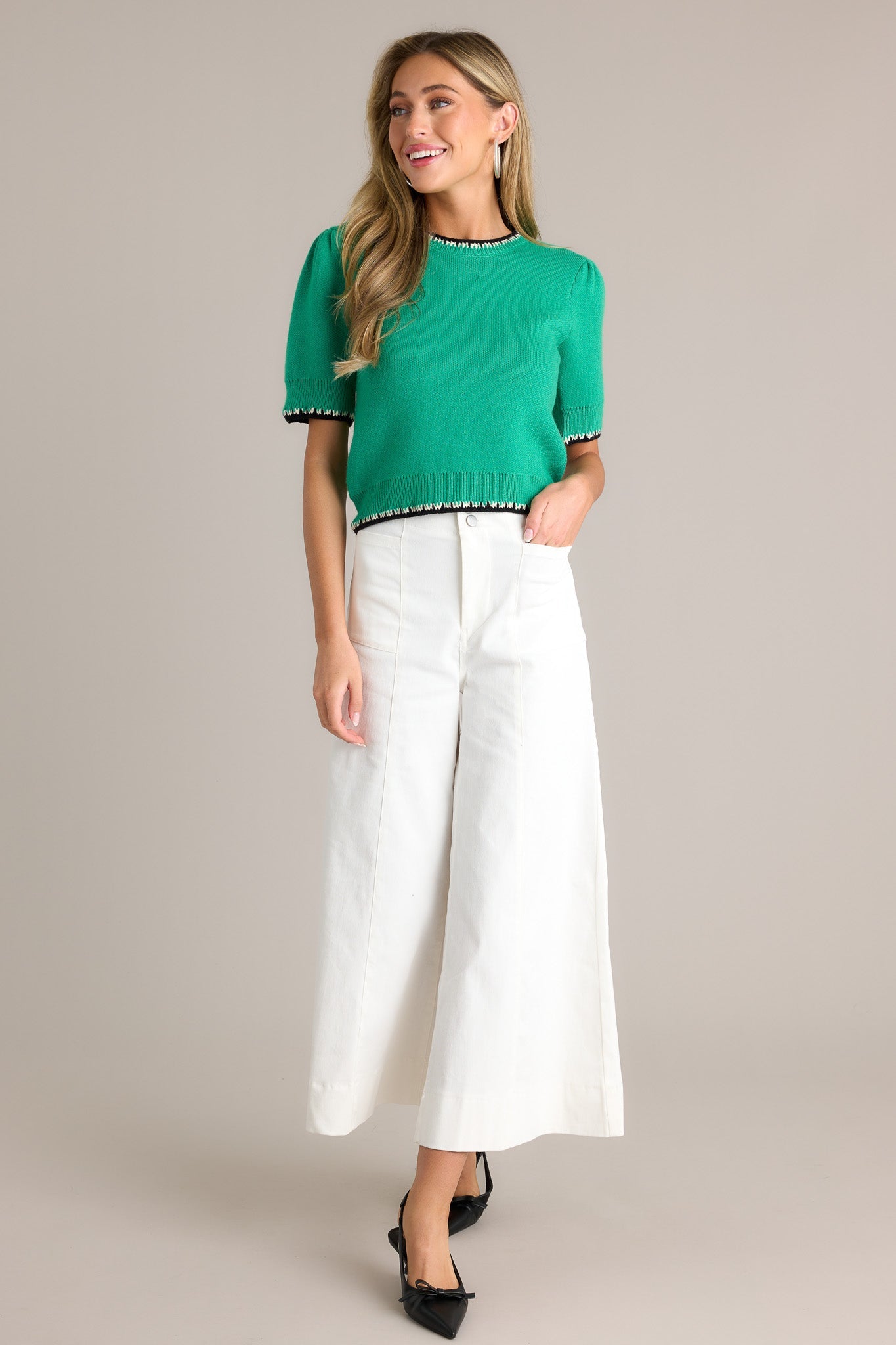 Stay cozy and chic in our Kelly Green Sweater Top. Made from the softest fabric, this top is perfect for any occasion. The charming kelly green color adds a touch of personality to your wardrobe, while the versatile design allows for endless styling possibilities. Express your unique charisma with this must-have sweater top. This green sweater top features a rounded neckline, a soft material, a ribbed hemline, ribbed cuffed half sleeves, and black & white trim.