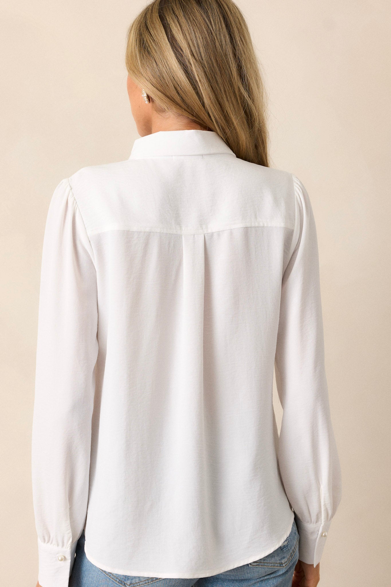 Get ready to slay all day with the Chic Chronicles Ivory Long Sleeve! This must-have piece features a stylish long sleeve design that will keep you looking chic and cozy. Perfect for any occasion, add this top to your wardrobe and stay stylishly warm all season long. This ivory top features a collared neckline, two faux pearls on the neckline, cuffed long balloon sleeves and a light breathable fabric.
