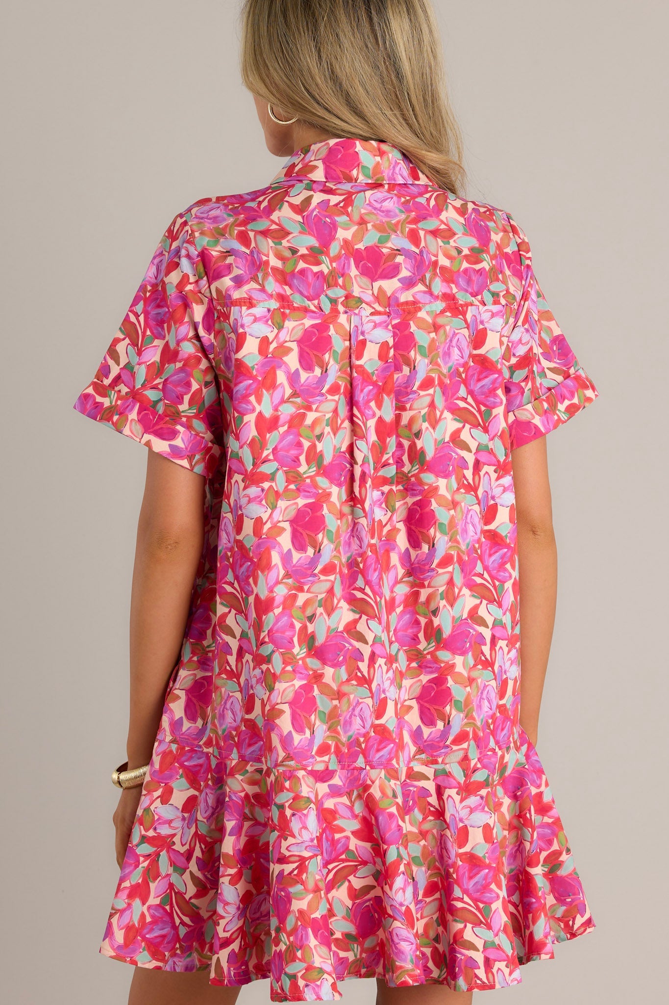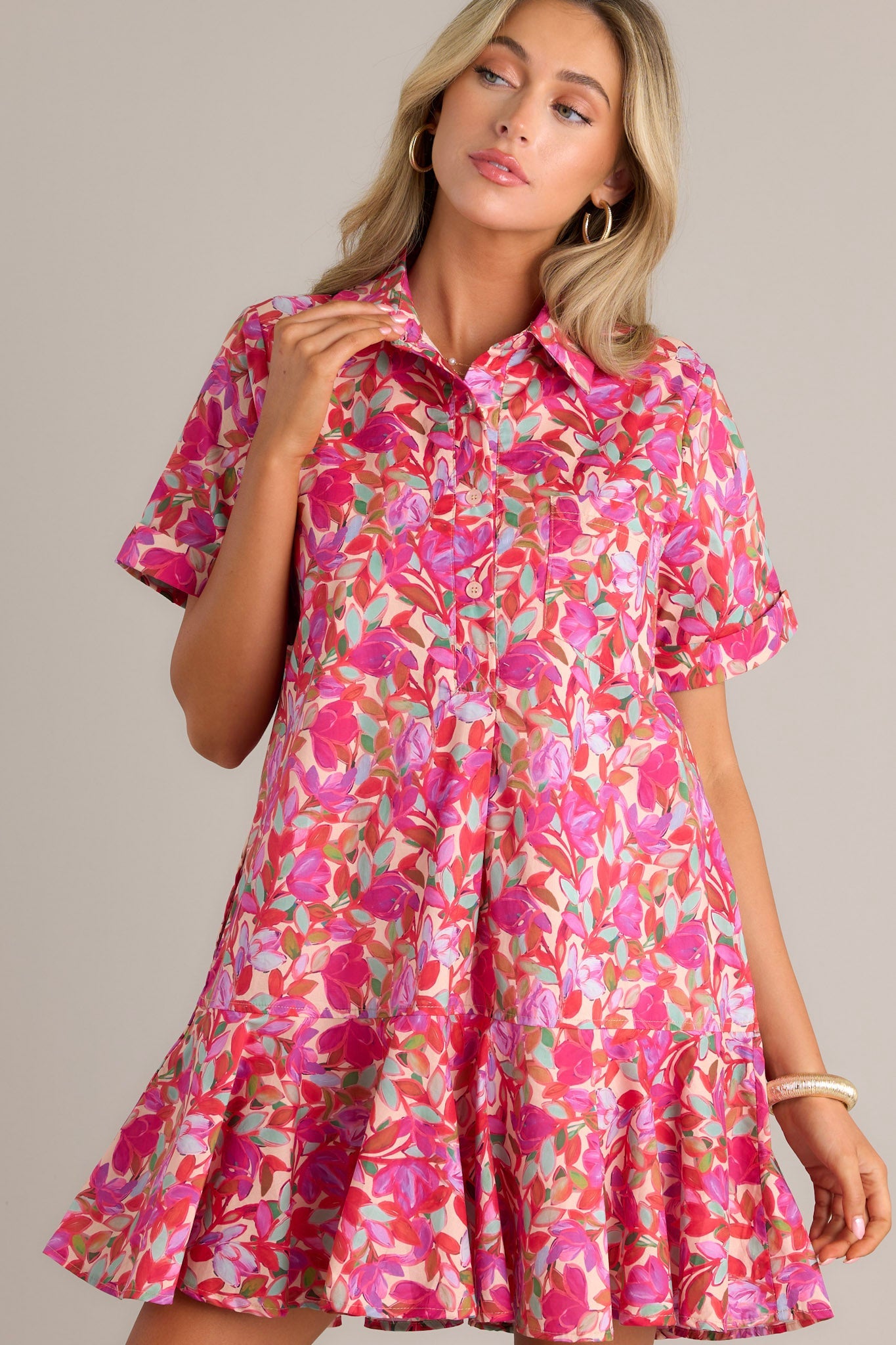 Get ready to turn heads in our Chic Harmony Pink Floral Mini Shirt Dress! This playful pink dress features a flattering mini length and a charming floral pattern. Perfect for any occasion, this dress is sure to add a touch of fun and style to your wardrobe. Don't miss out on this must-have piece! This pink mini dress features a collared neckline, a breast pocket, a button front bodice, functional hip pockets, a single tier, and cuffed short sleeves.