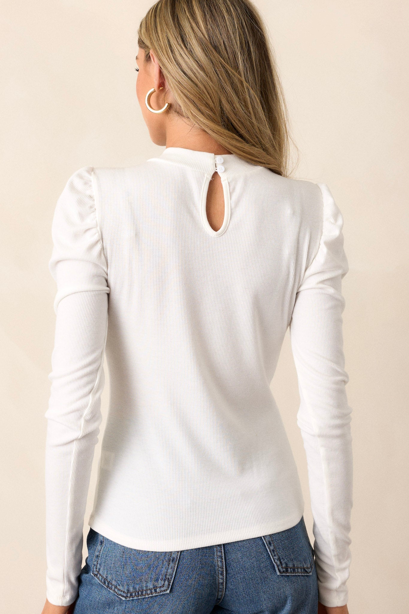 This chic long sleeve top is perfect for the minimalist in you. Made with ribbed fabric in a bold white color, it adds a pop of color to any outfit. Its stylish design will keep you comfortable and fashionable all day. Perfect for the fashion-forward and playful people. This long sleeve ribbed top features a high neckline, a back cut out with a loop closure, a soft ribbed material and a slight ruffled long sleeve.