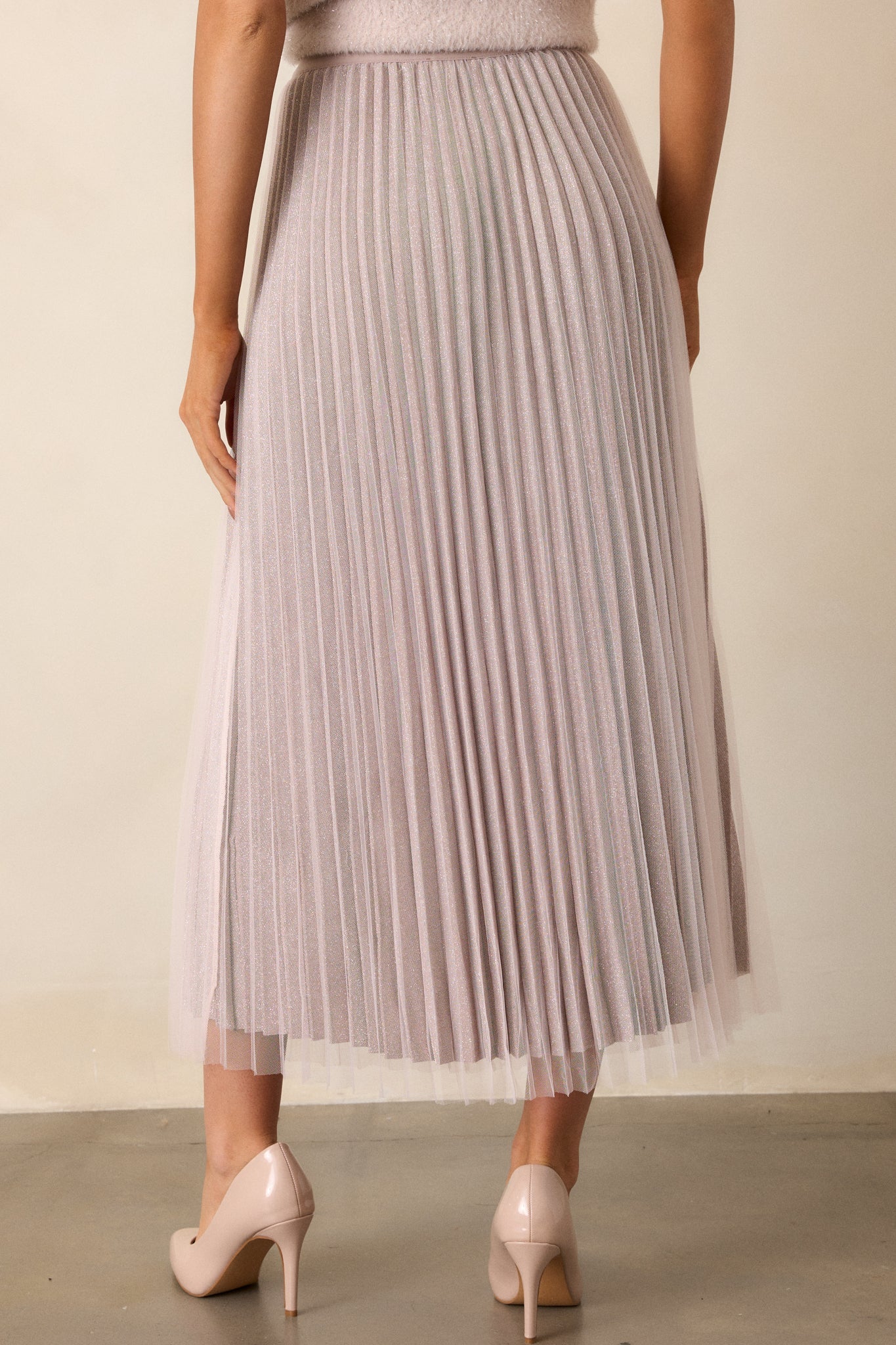 Elevate your style with the Chic Radiance Mauve Pleated Midi Skirt. With delicate pleats, this skirt not only adds texture and movement to your outfit, but also provides a flattering silhouette. Perfect for any occasion, this skirt will be a versatile addition to your wardrobe. This mauve skirt features an elastic waistband, pleated shimmer underlay, pleated tulle overlay, and midi length.