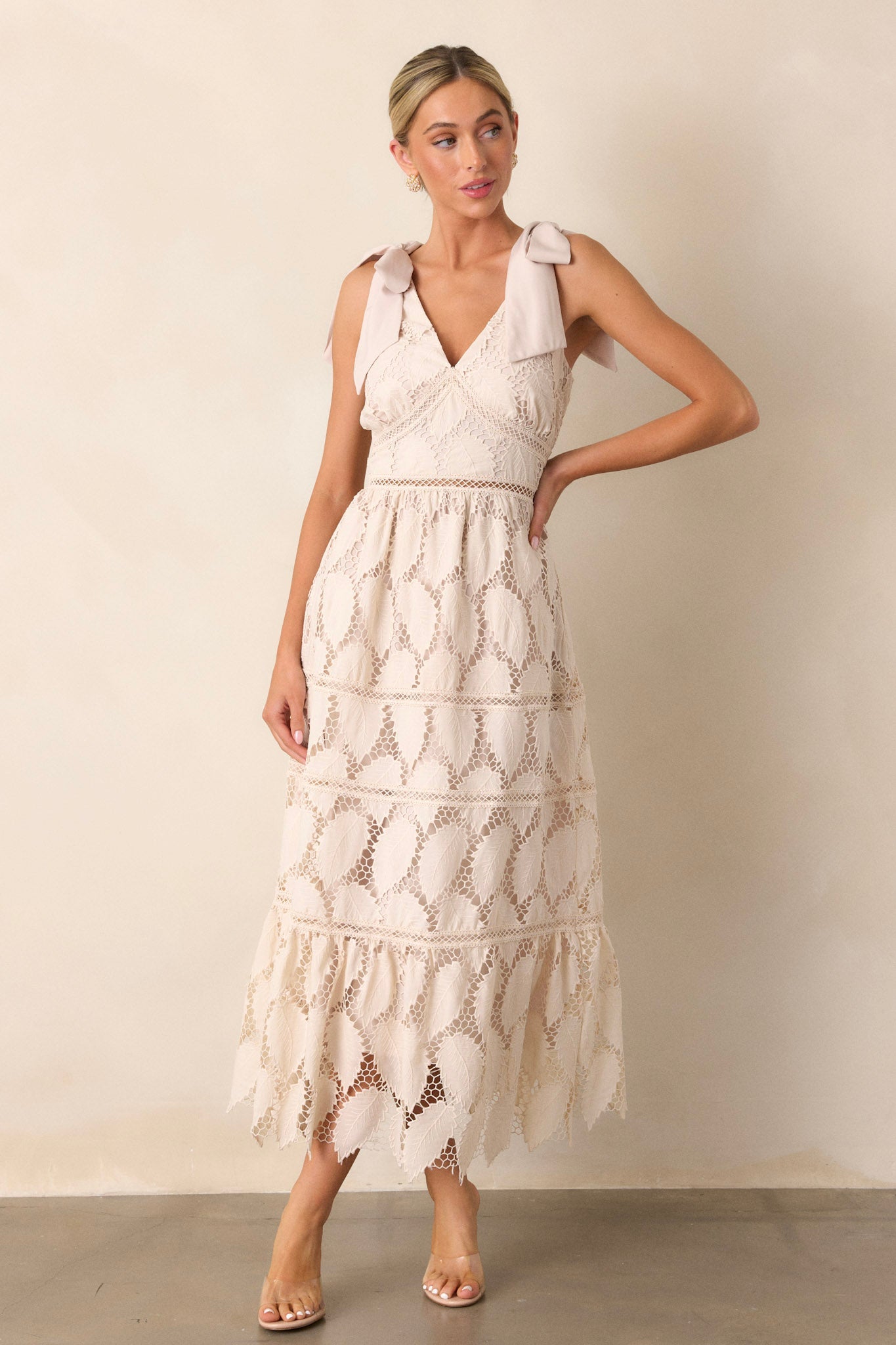 Experience effortless elegance in our Cinnamon Girl Light Beige Lace Midi Dress. The delicate lace detailing and flattering midi length make this dress perfect for any occasion. Stay stylish and comfortable with its lightweight, breathable fabric. Elevate your wardrobe with versatile and timeless style. This beige dress features a side-zipper and two tie functional straps.