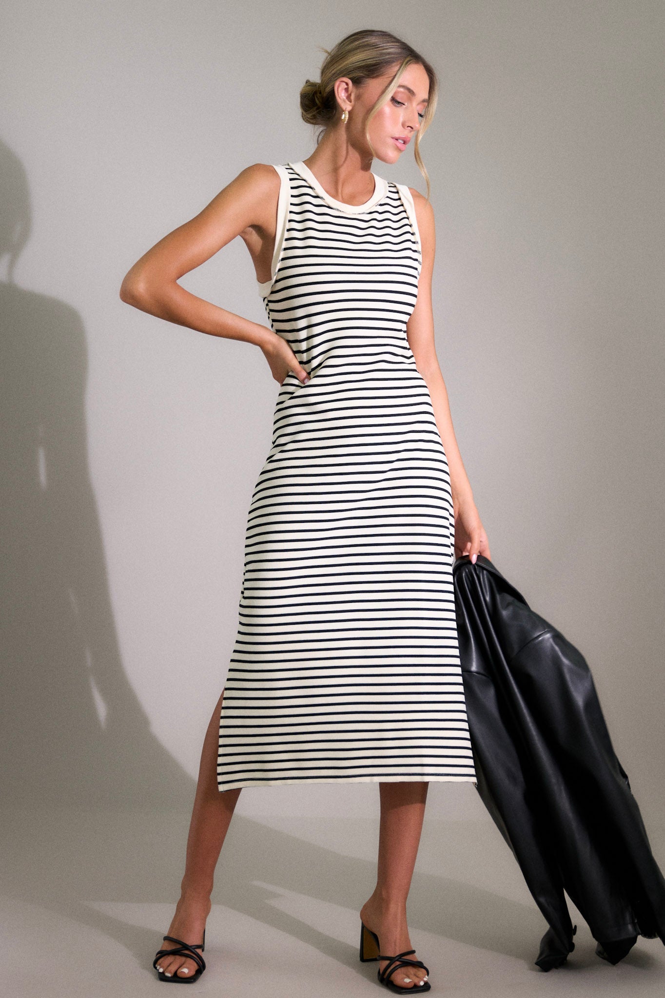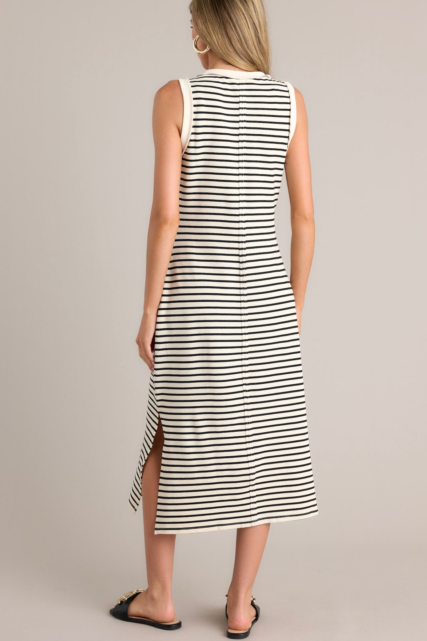 Get ready to turn heads in our Classic Contrast Ivory Stripe Midi Dress! This bold, yet timeless dress features a striking contrast stripe pattern that adds a touch of playfulness to your wardrobe. With its midi length and classic design, this dress is perfect for any laid back occasion! This ivory stripe midi dress features a crew neckline, a classic horizontal stripe design, and a split hemline.
