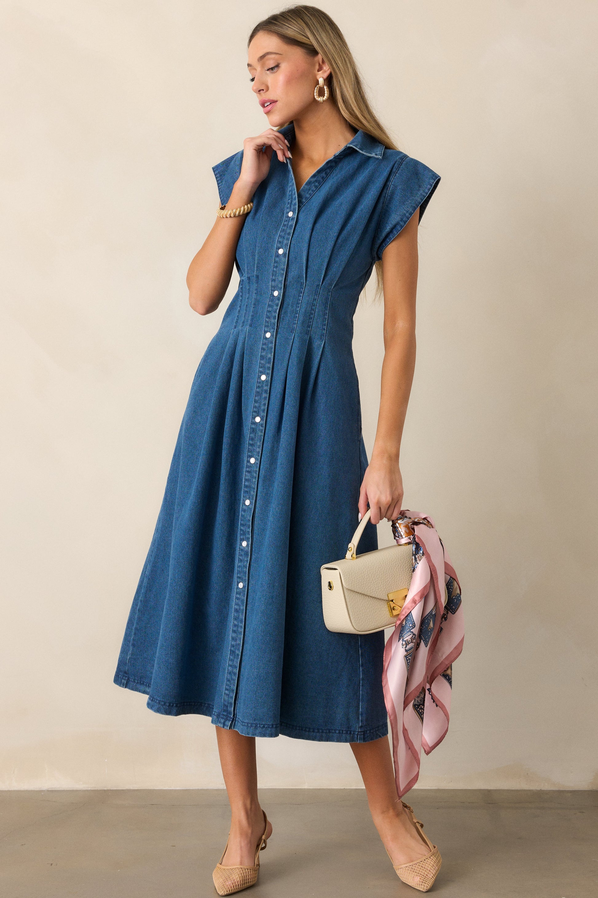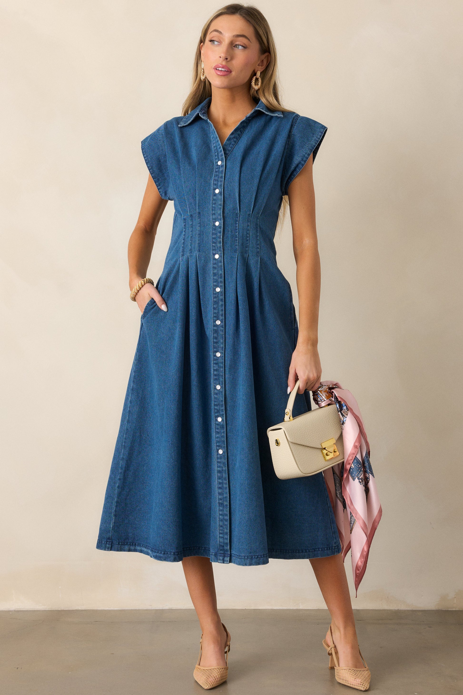Embrace vintage charm with our Classic Tea Party Dark Wash Denim Button Front Pleated Midi Dress. Made from high-quality denim, this dress features a flattering button front and pleated design for a timeless look. Perfect for any occasion, it offers both style and comfort. Elevate your wardrobe with this must-have piece! This dark wash dress features cap sleeves, a button front with pearlized snap closures, two functional pockets, and a pleated design around the waist.