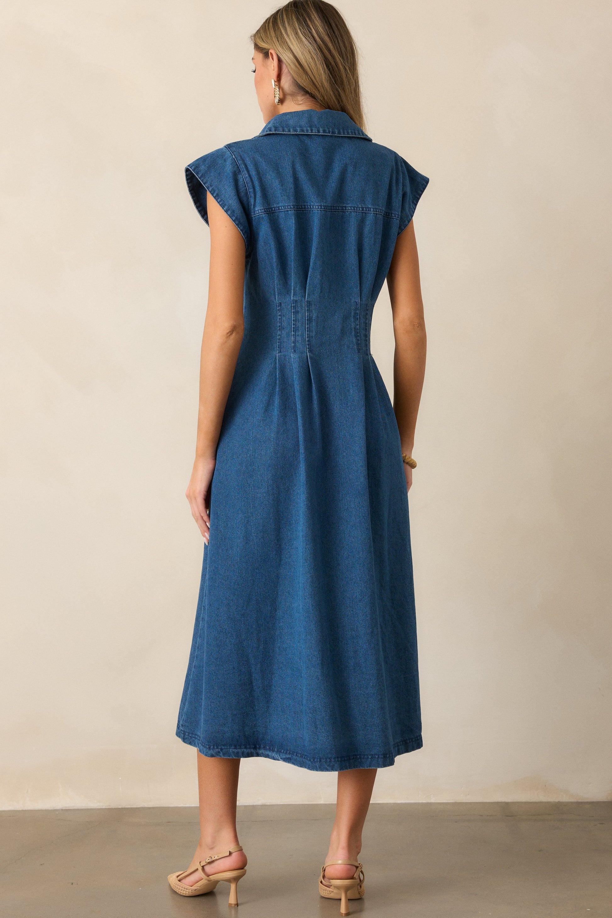 Classic Tea Party Dark Wash Denim Button Front Pleated Midi Dress