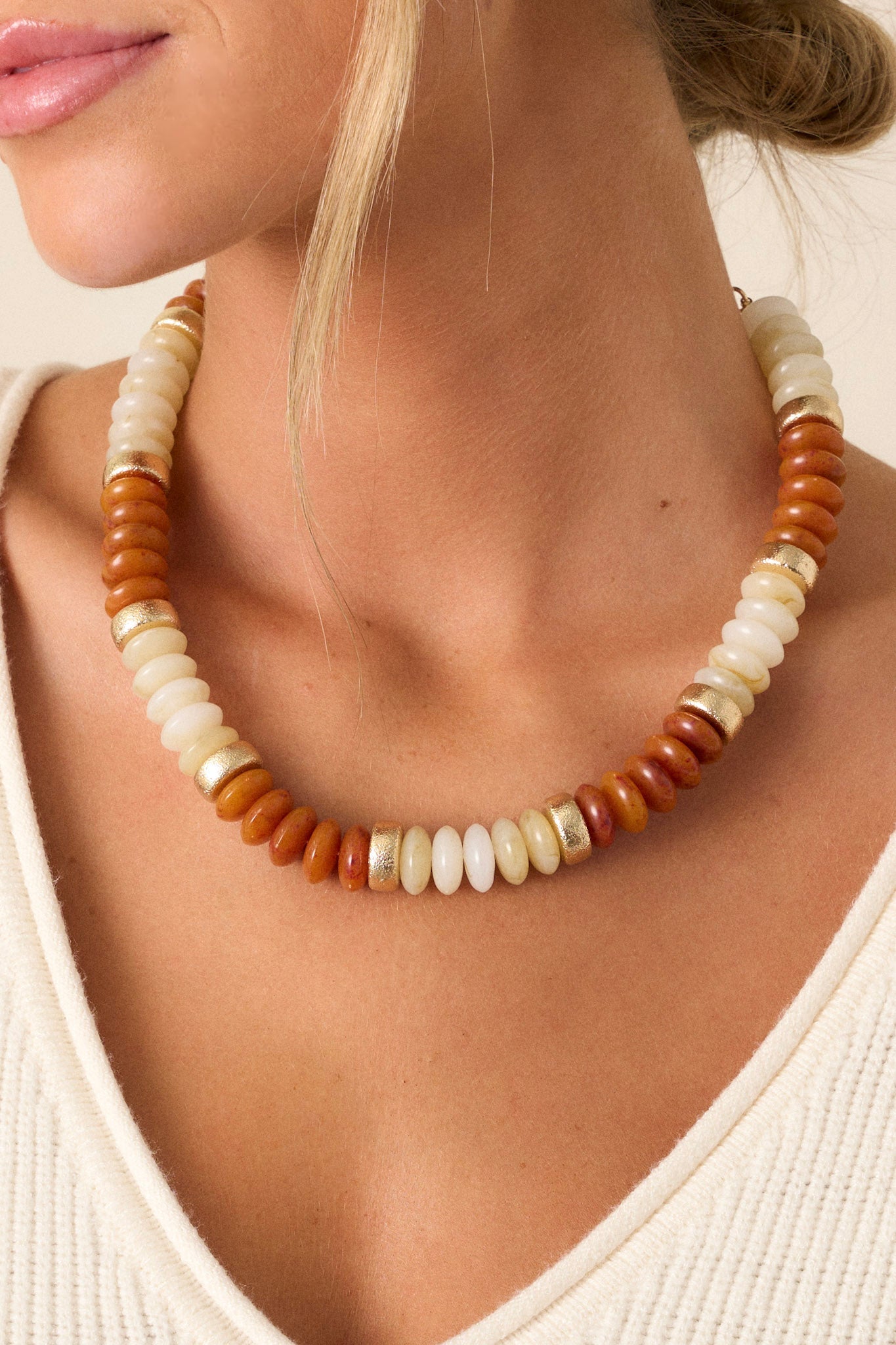 Elevate your look with our Clear As Day Brown & Gold Beaded Necklace. Hand-crafted with exquisite ivory and gold beads, this necklace is sure to add a touch of elegance to any outfit. Dazzle in the light with its beautiful shine and make a statement wherever you go. This brown necklace features gold hardware, ivory, gold, and brown flat beads, and a lobster clasp closure.