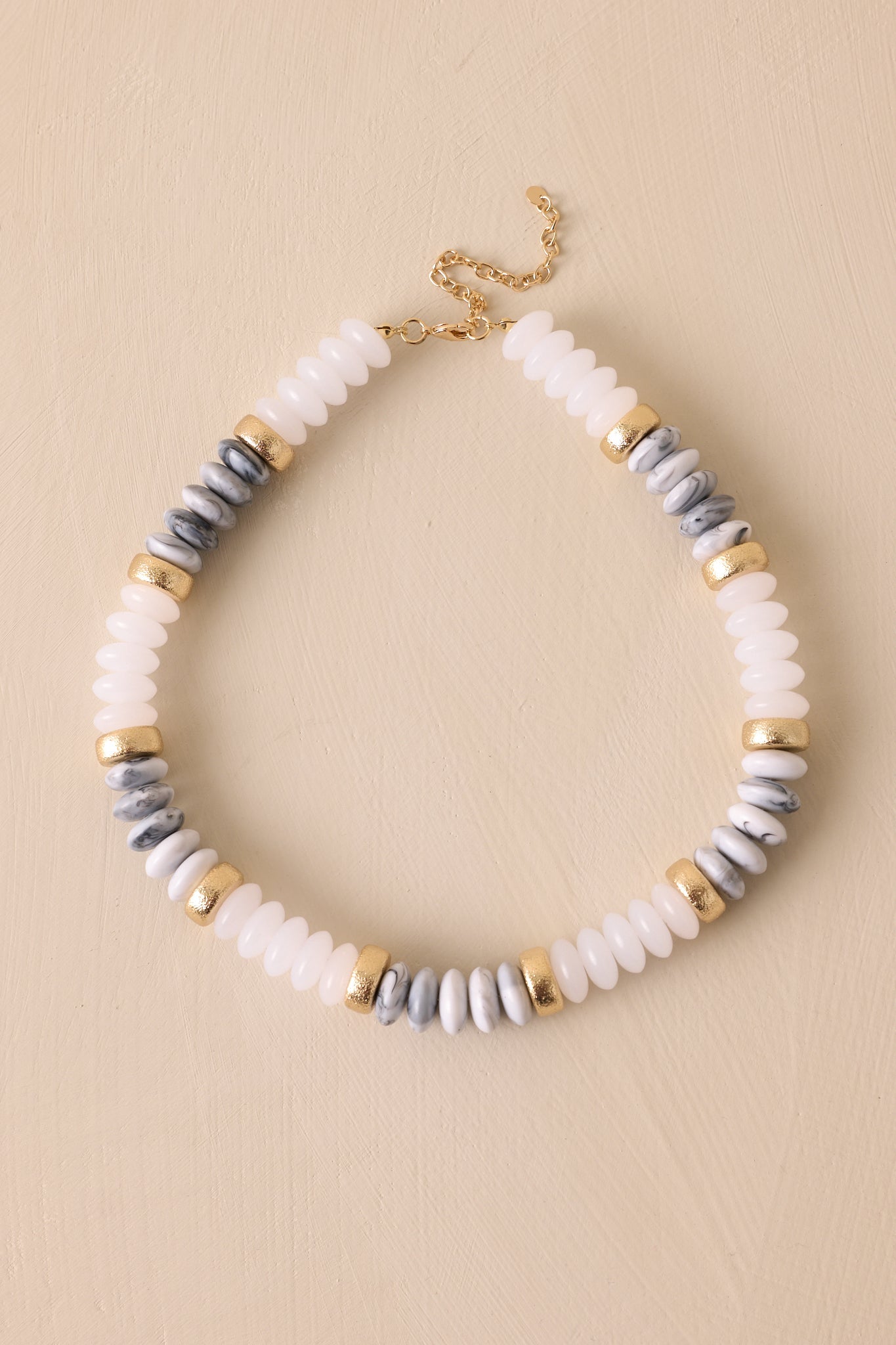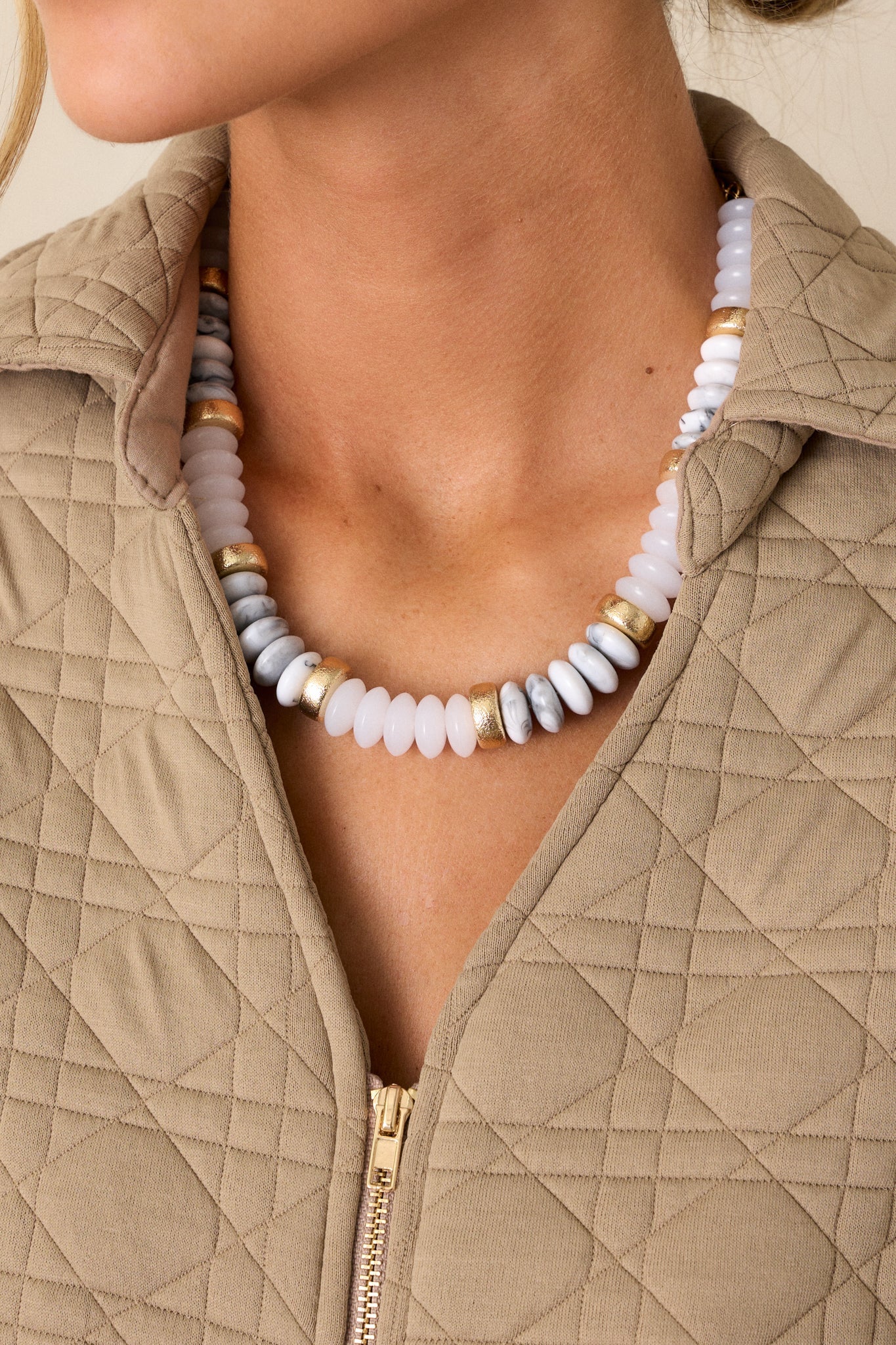 Elevate your look with our Clear As Day Ivory & Gold Beaded Necklace. Hand-crafted with exquisite ivory and gold beads, this necklace is sure to add a touch of elegance to any outfit. Dazzle in the light with its beautiful shine and make a statement wherever you go. This ivory necklace features gold hardware, ivory, gold, and marbled flat beads, and a lobster clasp closure.