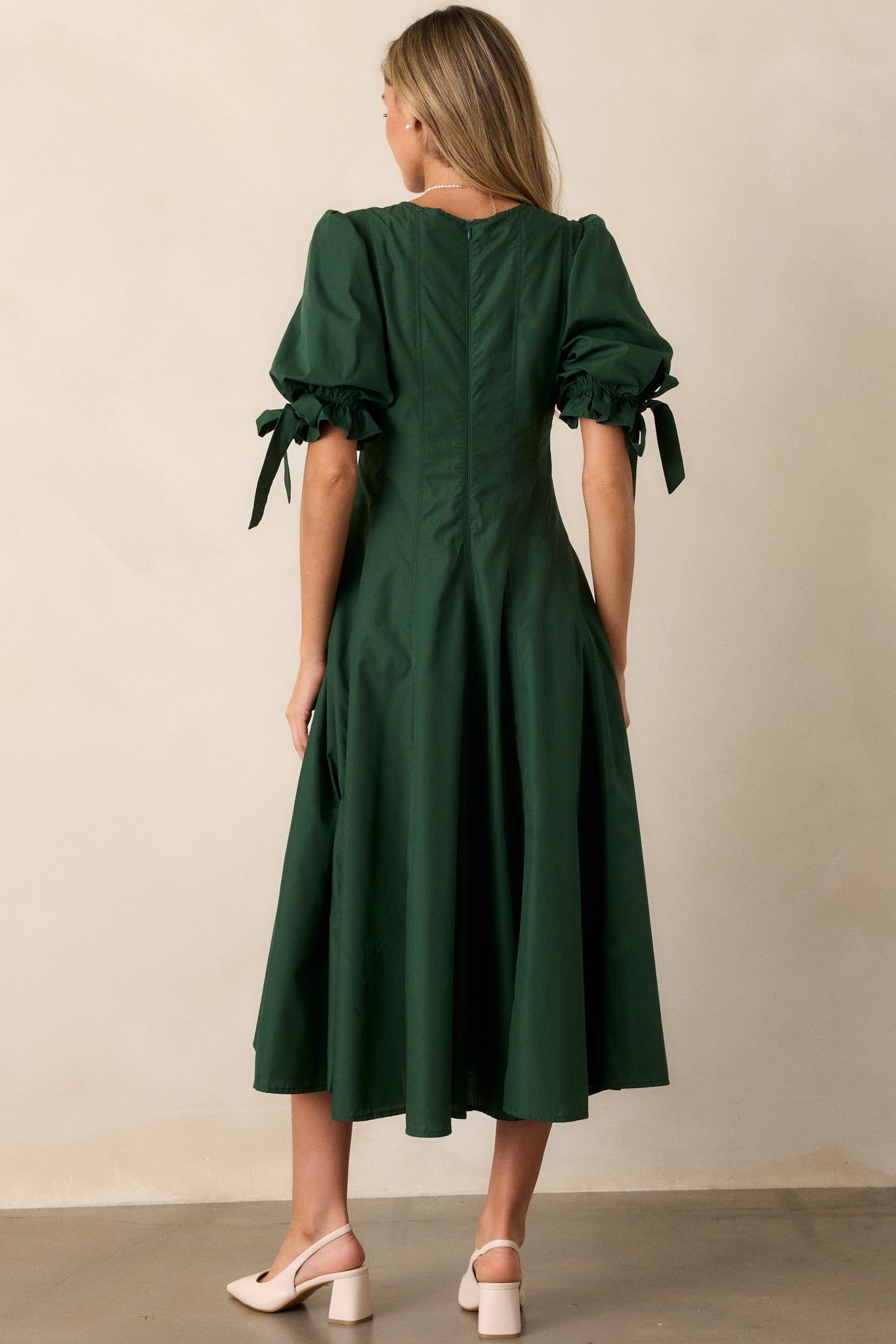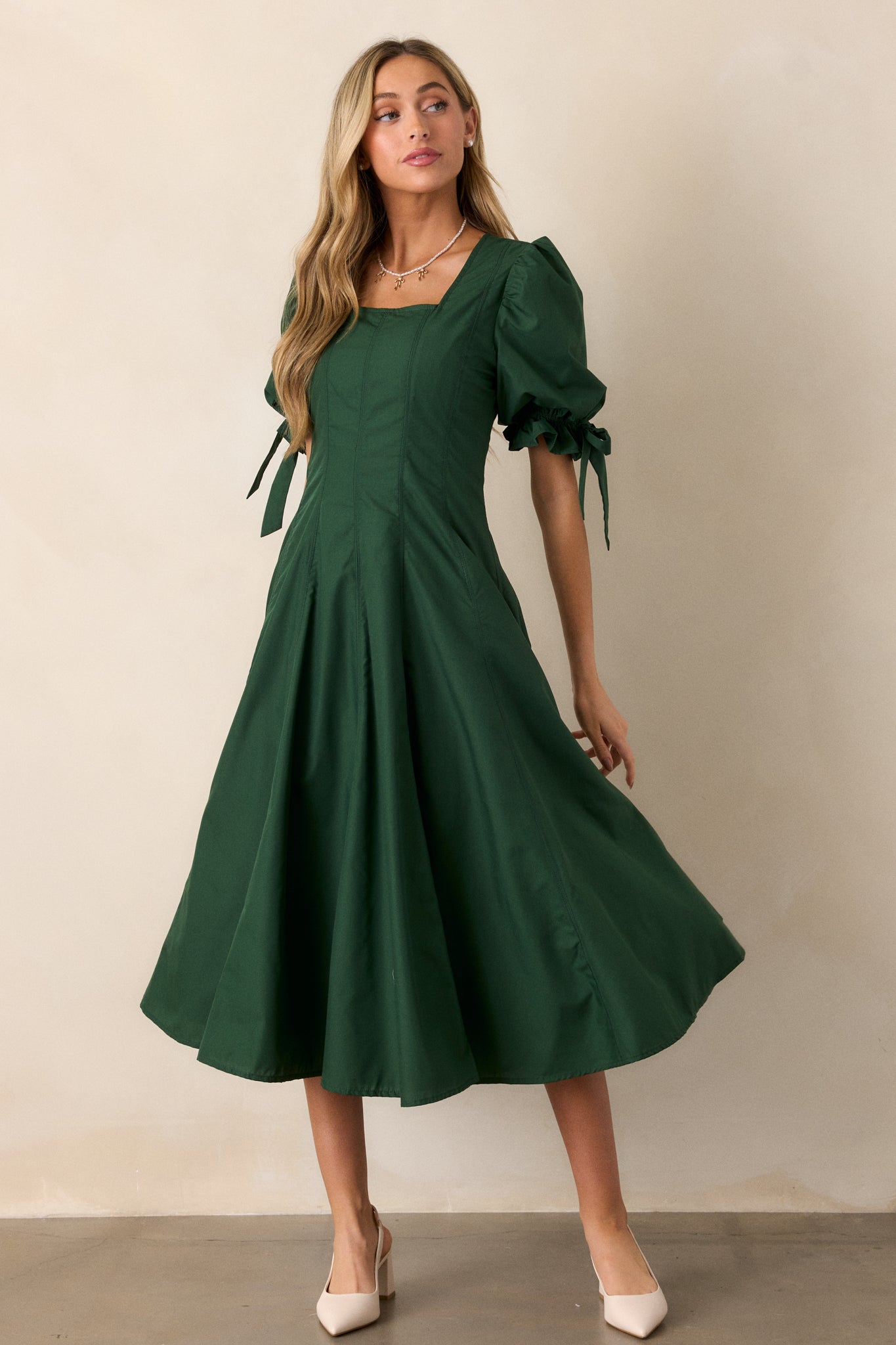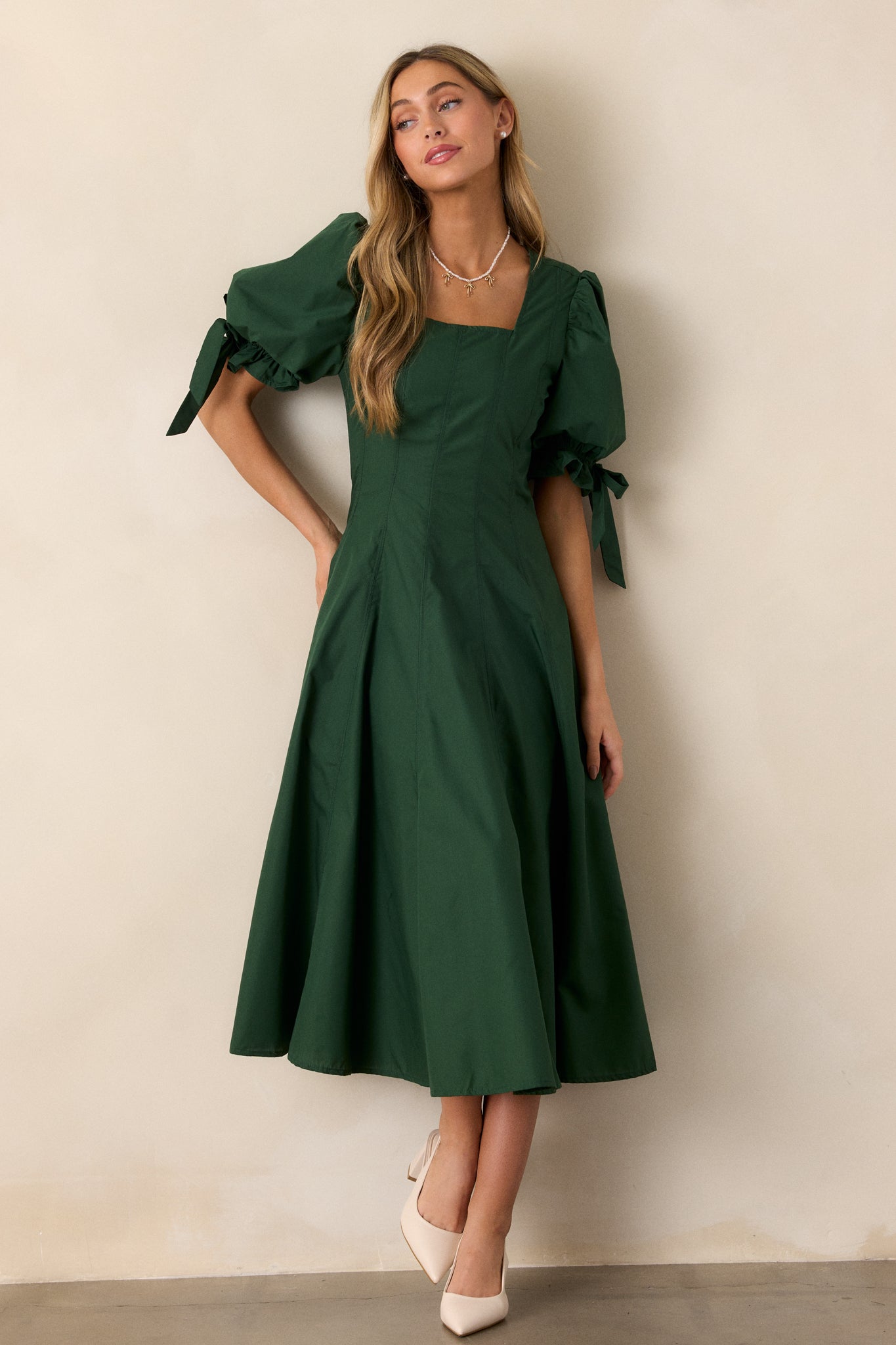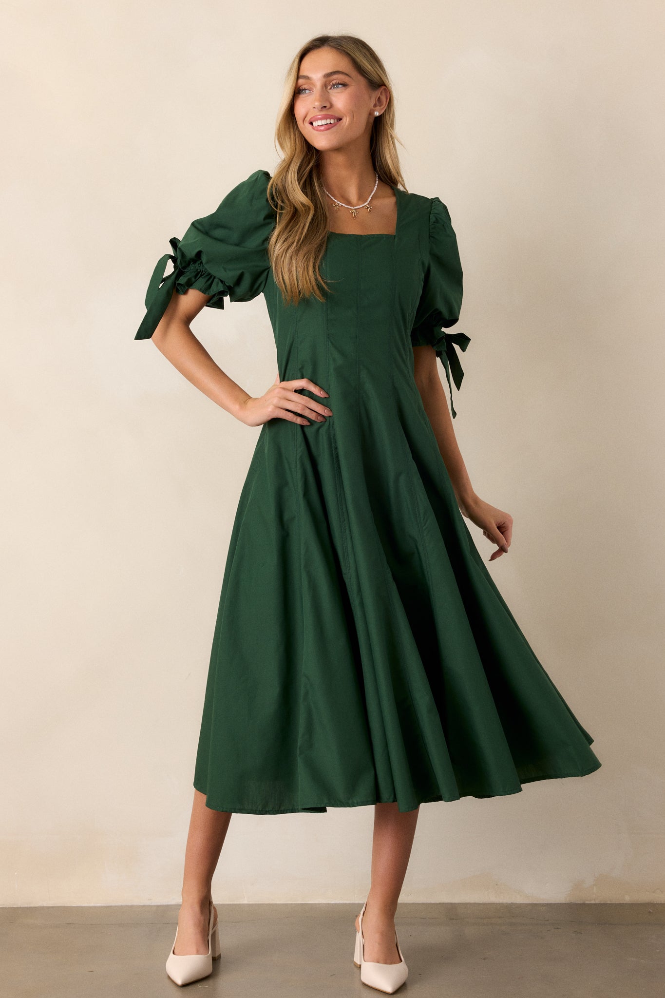 Introducing the Clover Fields 100% Cotton Green Midi Dress! Stay comfortable and stylish all day long while enjoying the soft, breathable fabric. Perfect for any occasion, from a casual day out to a special event. Elevate your wardrobe with this must-have piece! This green dress features a square neckline, midi length, fit and flare design, discrete back zipper, vertical detail seams, and elastic cuffed short puff sleeves with bow accents.