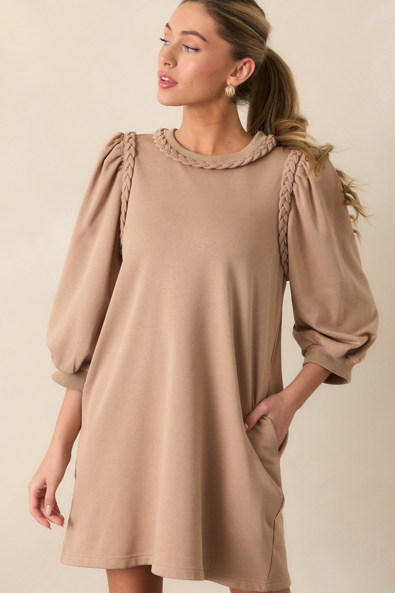 Experience the perfect combination of comfort and style with our Cocoa Haze 100% Cotton Tan Long Sleeve Mini Dress. Made with soft and breathable fabric, this dress will keep you feeling cozy while looking fabulous. The long sleeves provide additional warmth, making it ideal for cooler weather. Elevate your wardrobe with this must-have piece! This tan dress features a braided neckline, braided shoulder detailing, puff 3/4 sleeves and a boxy fit.