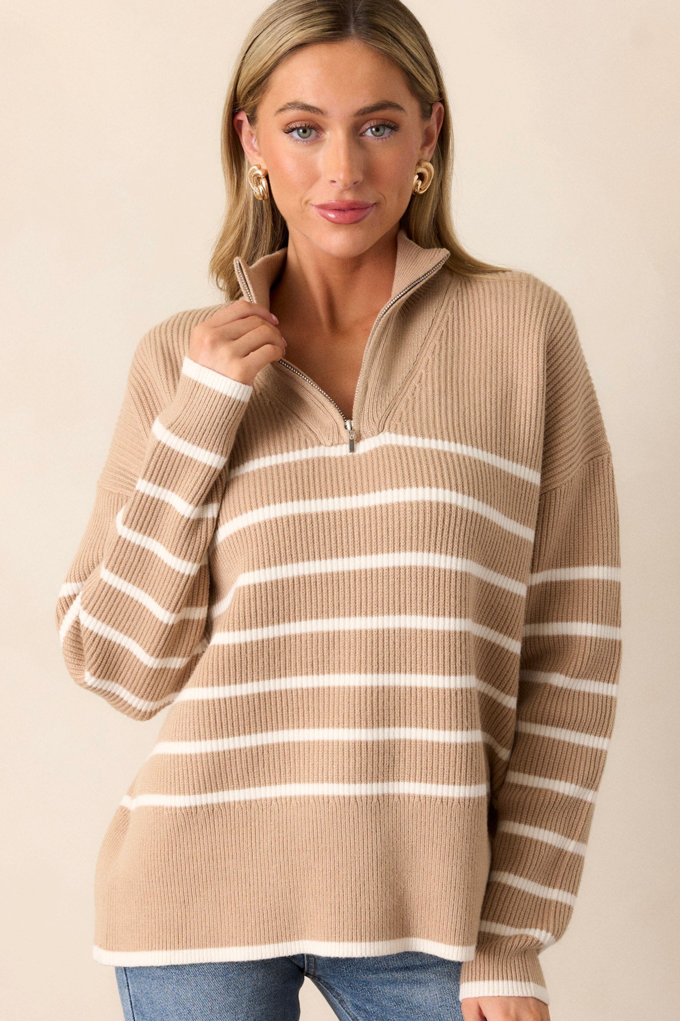 Comfort Cutie Khaki Stripe Quarter-Zip Sweater