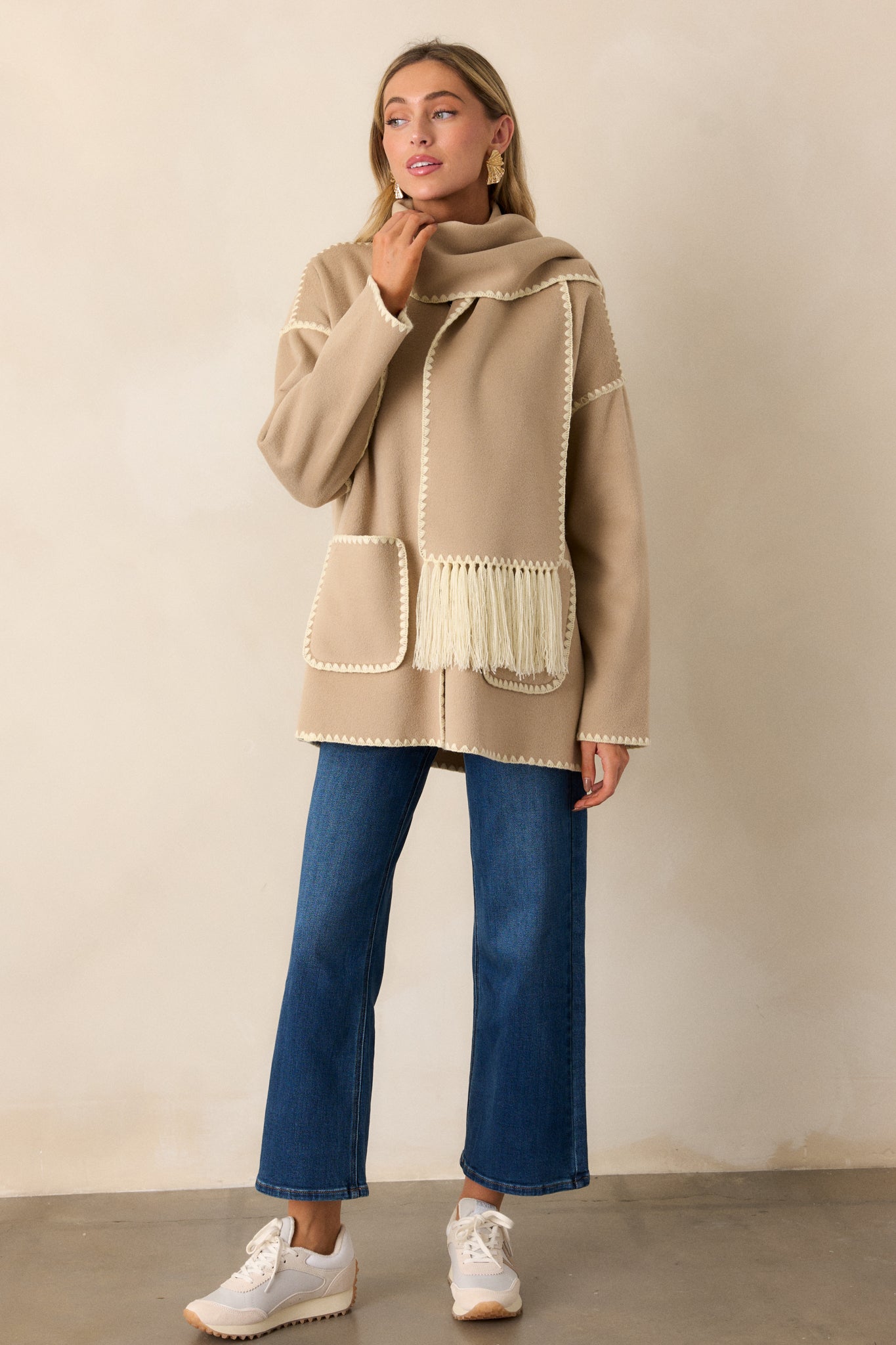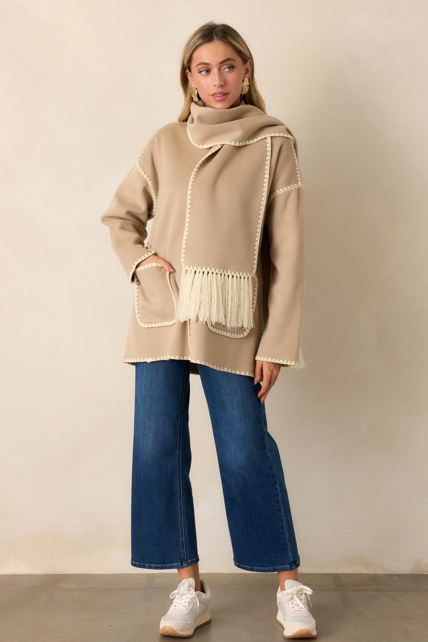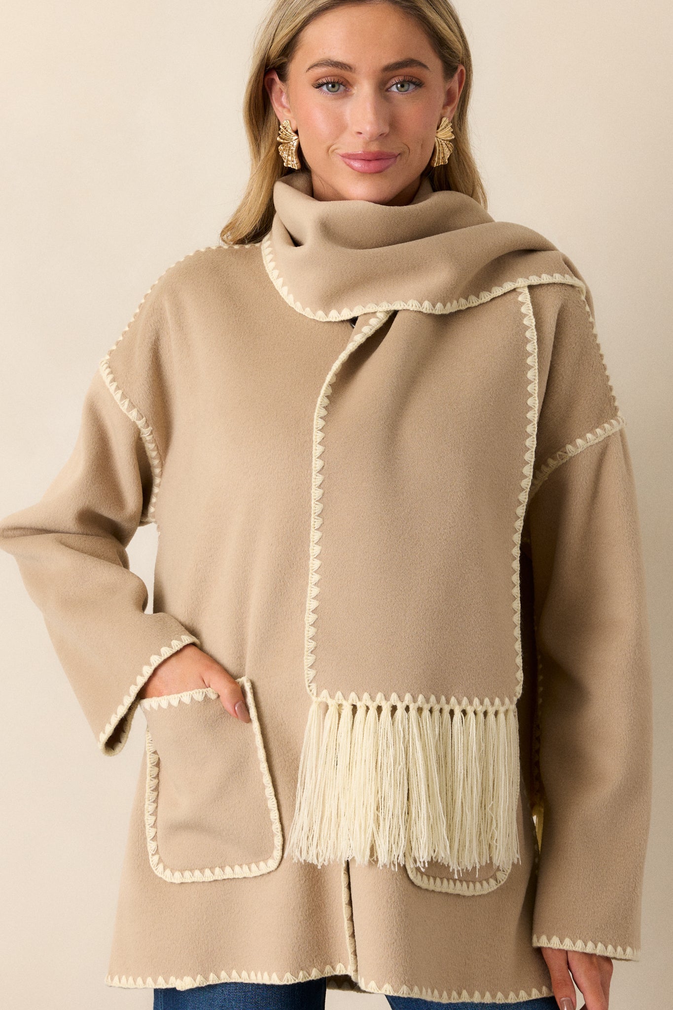 Wrap yourself in luxury with our Coming Around Taupe Blanket Stitch Coat. Made with high-quality materials and accented with beautiful blanket stitching, this coat will keep you warm and stylish all winter long. Embrace the warmth and comfort while looking effortlessly chic. This Taupe Coat features a rounded neckline, functional button front, blanket stitch hems, functional front pockets, long sleeves with blanket stitch detailing and a blanket stitch scarf with fringe detailing.