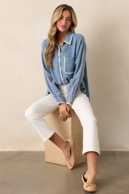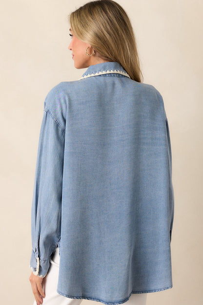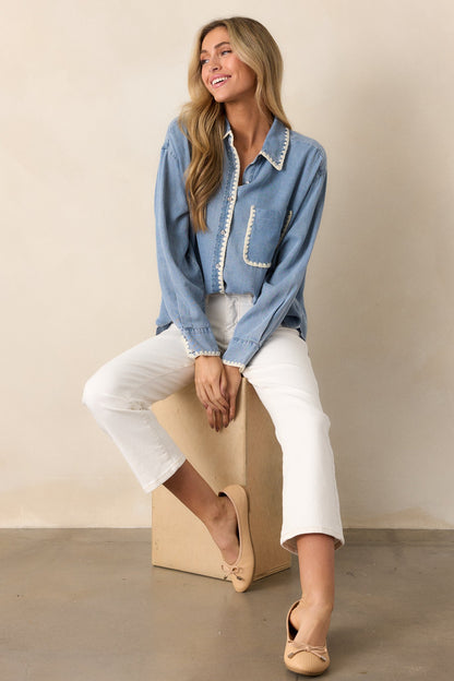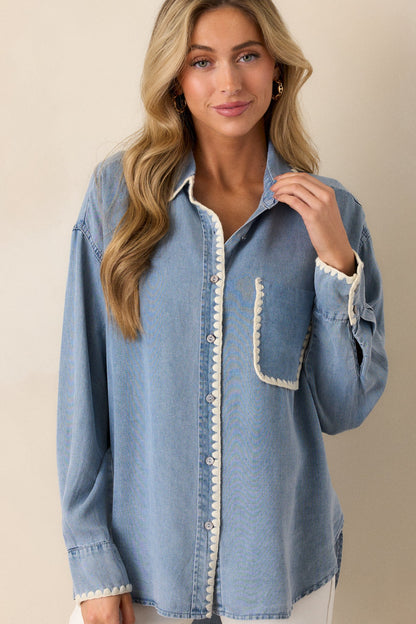 Experience ultimate comfort and style with our Cool Breezes Light Chambray Button Front Top. Made from soft and breathable material, this top will keep you cool and comfortable all day long. The timeless button up design adds a touch of sophistication to any outfit. Get yours today and feel the breeze! This light wash chambray top features a collared neckline, a functional button front, a functional breast pocket, ivory blanket stitch trim, and long sleeves with a functional button cuff.