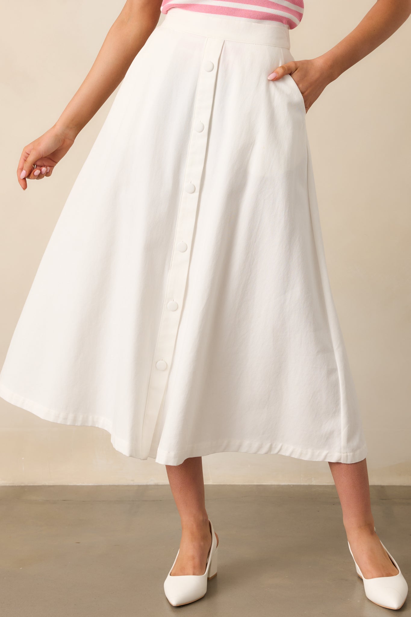 Get ready to add a touch of charm to your wardrobe with our Countryside Charm 100% Cotton Ivory Midi Skirt! With its playful button front and flattering midi length, this skirt is perfect for all occasions. Plus, the elegant ivory color will make you stand out in style. This ivory midi shirt features a high waisted design, a elastic insert along the back of the waistband, and faux buttons down the front.