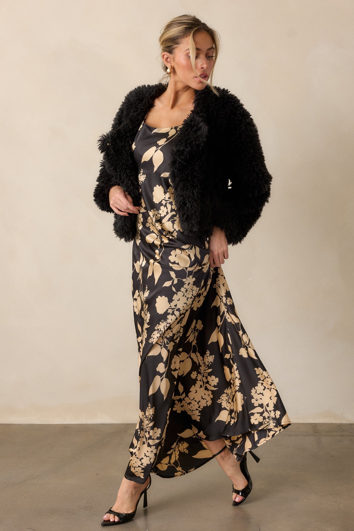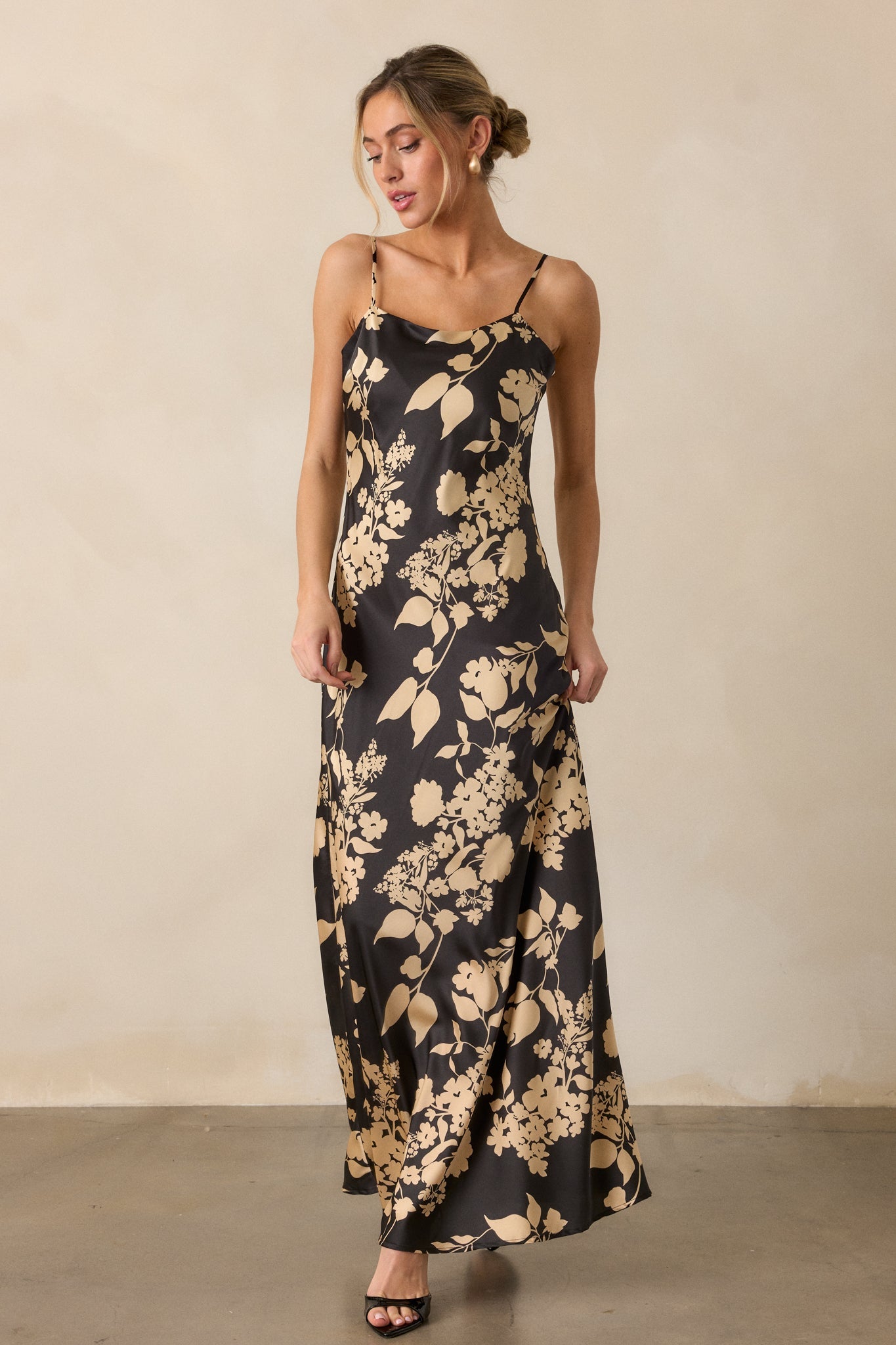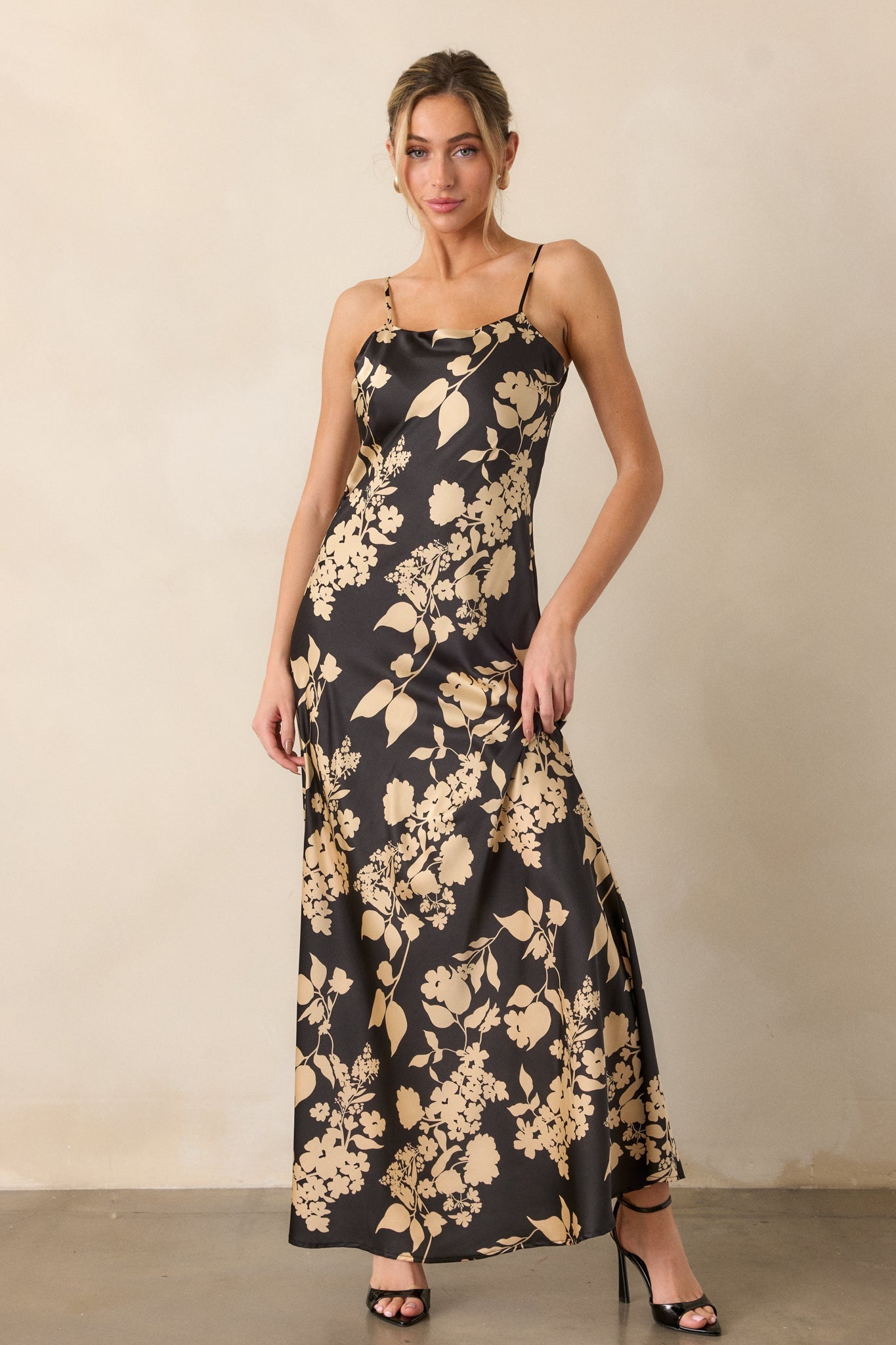 Elevate your style with our Crescent Glow Black Floral Satin Maxi Dress. Crafted with premium satin fabric, this dress boasts a flattering silhouette and a stunning floral pattern. The perfect combination of comfort and elegance, it's ideal for any occasion. Make a statement and stand out in this beautiful dress. This black dress features a bold black & gold floral design, slightly curved neckline, maxi length and sleeveless design.