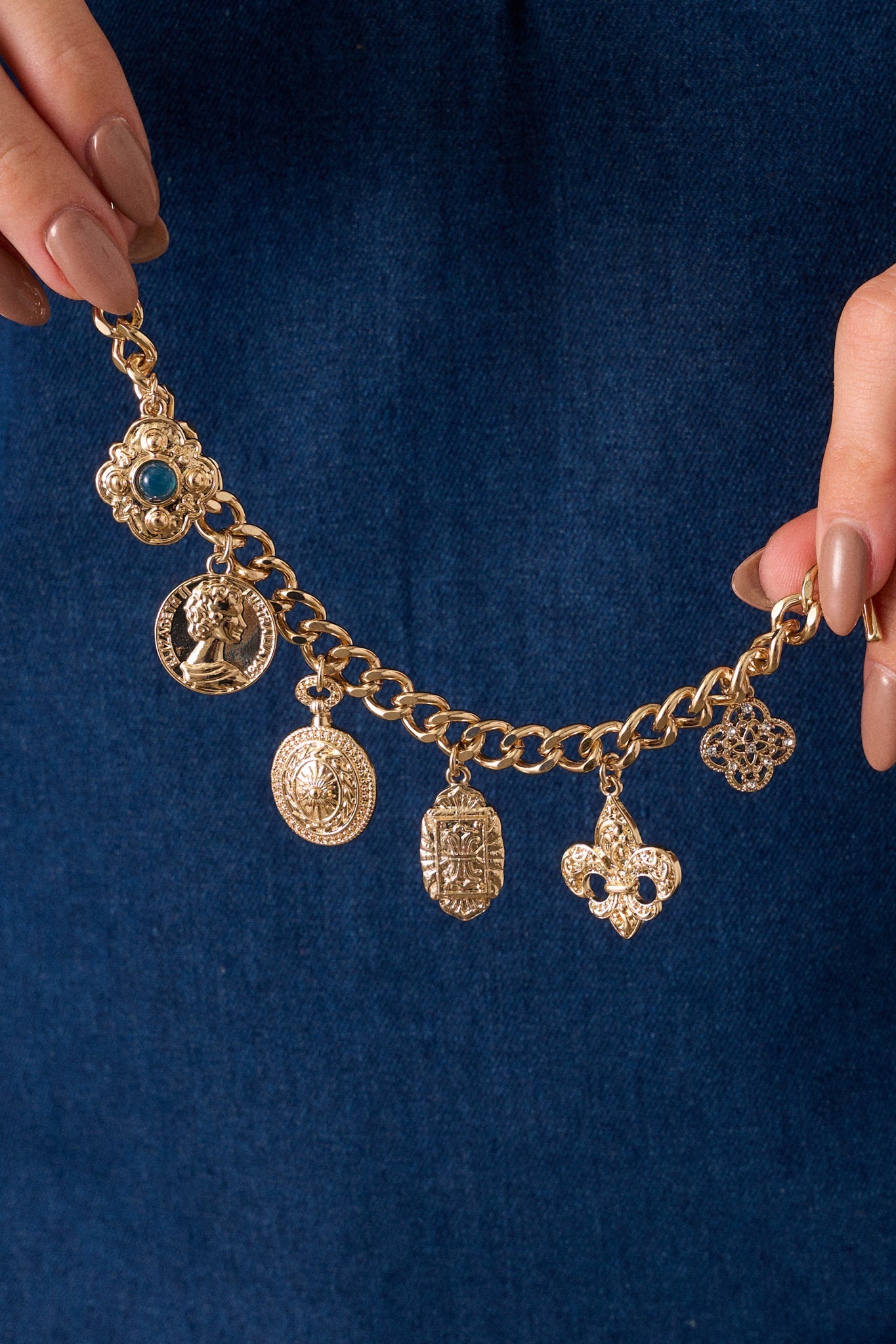 This Crimson & Clover Gold Charm Chain Bracelet is a stylish and versatile accessory that will add a touch of elegance to any outfit. The gold charm and chain design is perfect for both casual and formal occasions, making it a must-have for any jewelry collection. Elevate your style with this beautiful bracelet. This gold charm bracelet features gold hardware, a thick gold chain, six gold pendants with all different shapes and designs and a toggle clasp closure.