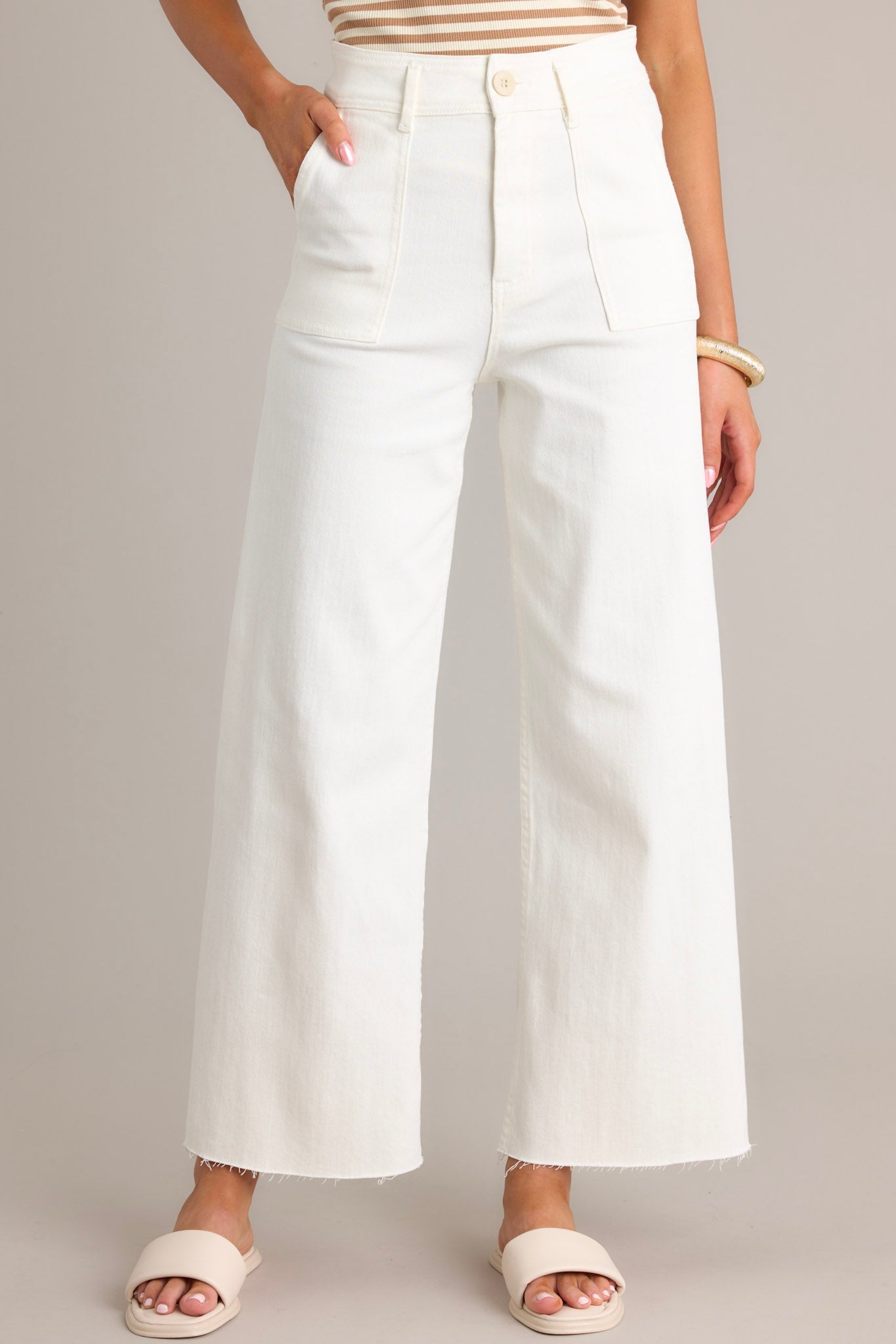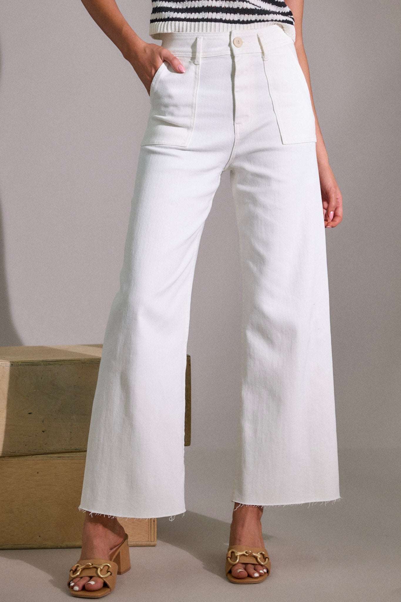 Unleash your inner fashionista with the Crisp Canvas White Denim Wide Leg Jeans. These stylish pants feature a wide leg design for a flattering fit and are made from a high-quality crisp material for a clean look. Perfect for any occasion, these pants will have you looking and feeling your best! These white jeans feature a high waisted design, a classic button & zipper closure, belt loops, functional front & back pockets, a wide leg design, and a raw hemline.