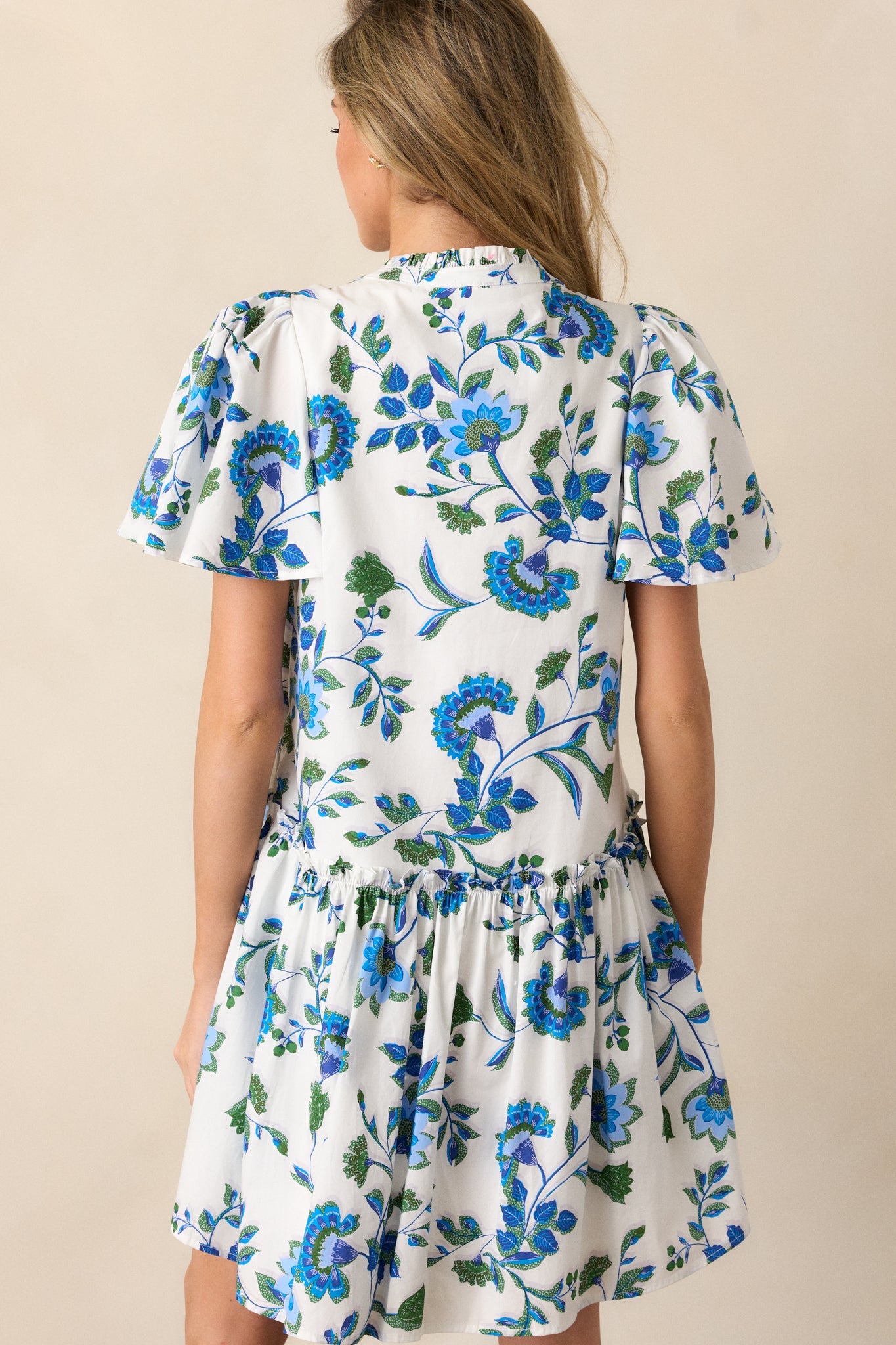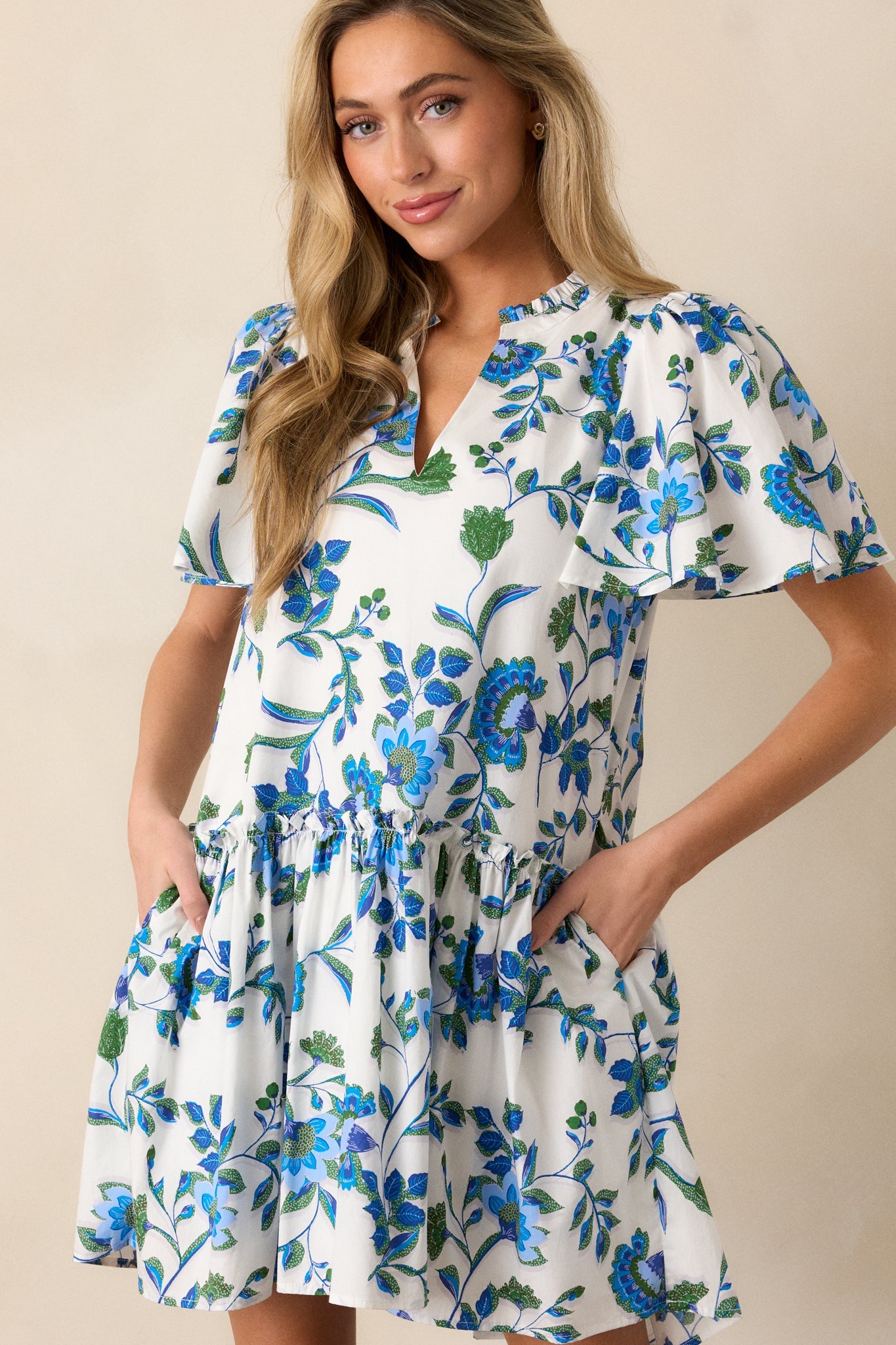 Float through your day in our Crystal Waters 100% Cotton Blue Floral Mini Dress. Made with breathable cotton, this dress keeps you cool and comfortable while the playful blue floral pattern adds a touch of whimsy. Perfect for everyday wear or a picnic in the park! This blue floral dress features a v-neckline, pleated detailing around neck, a single tier, and short sleeves.
