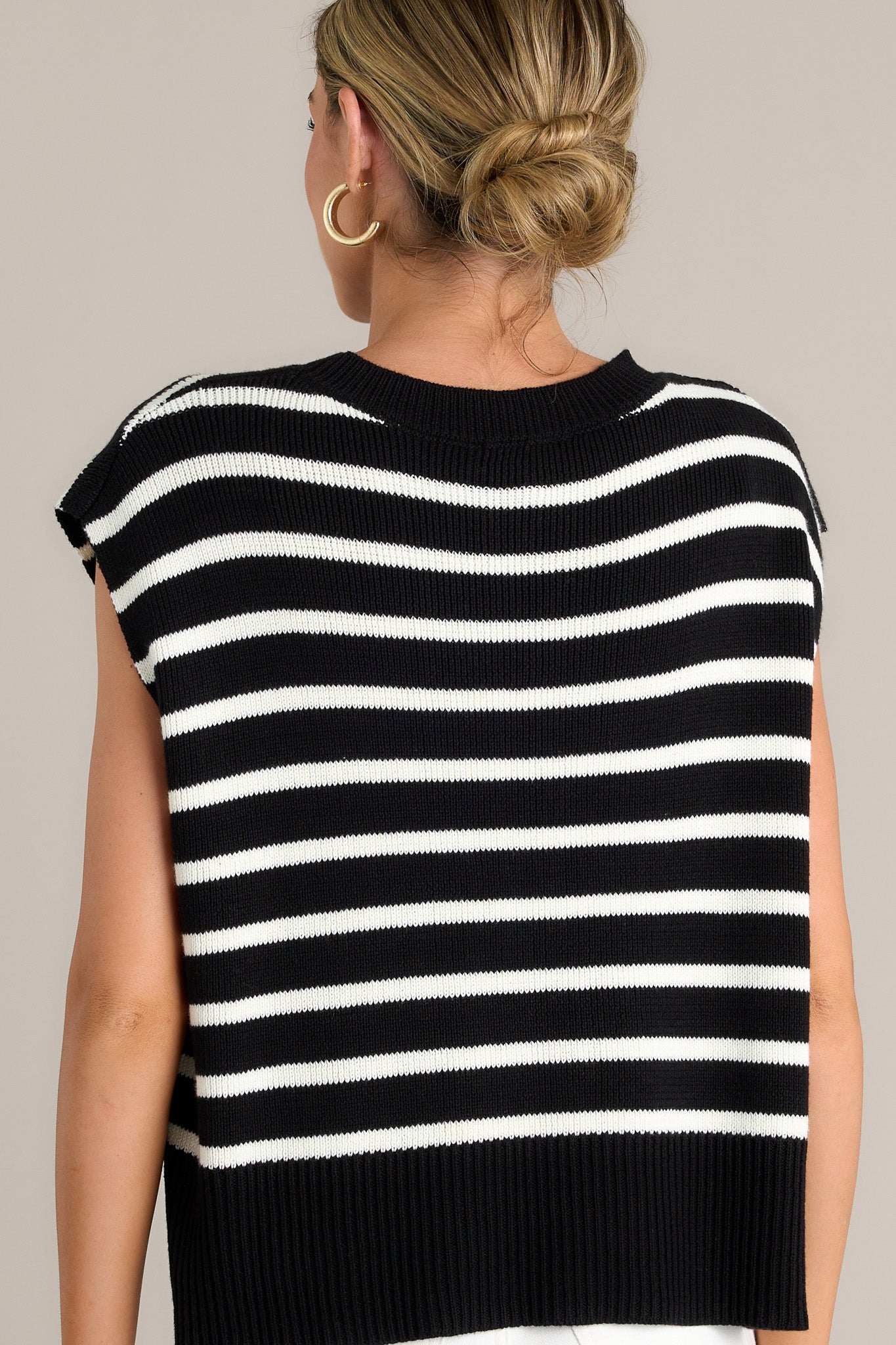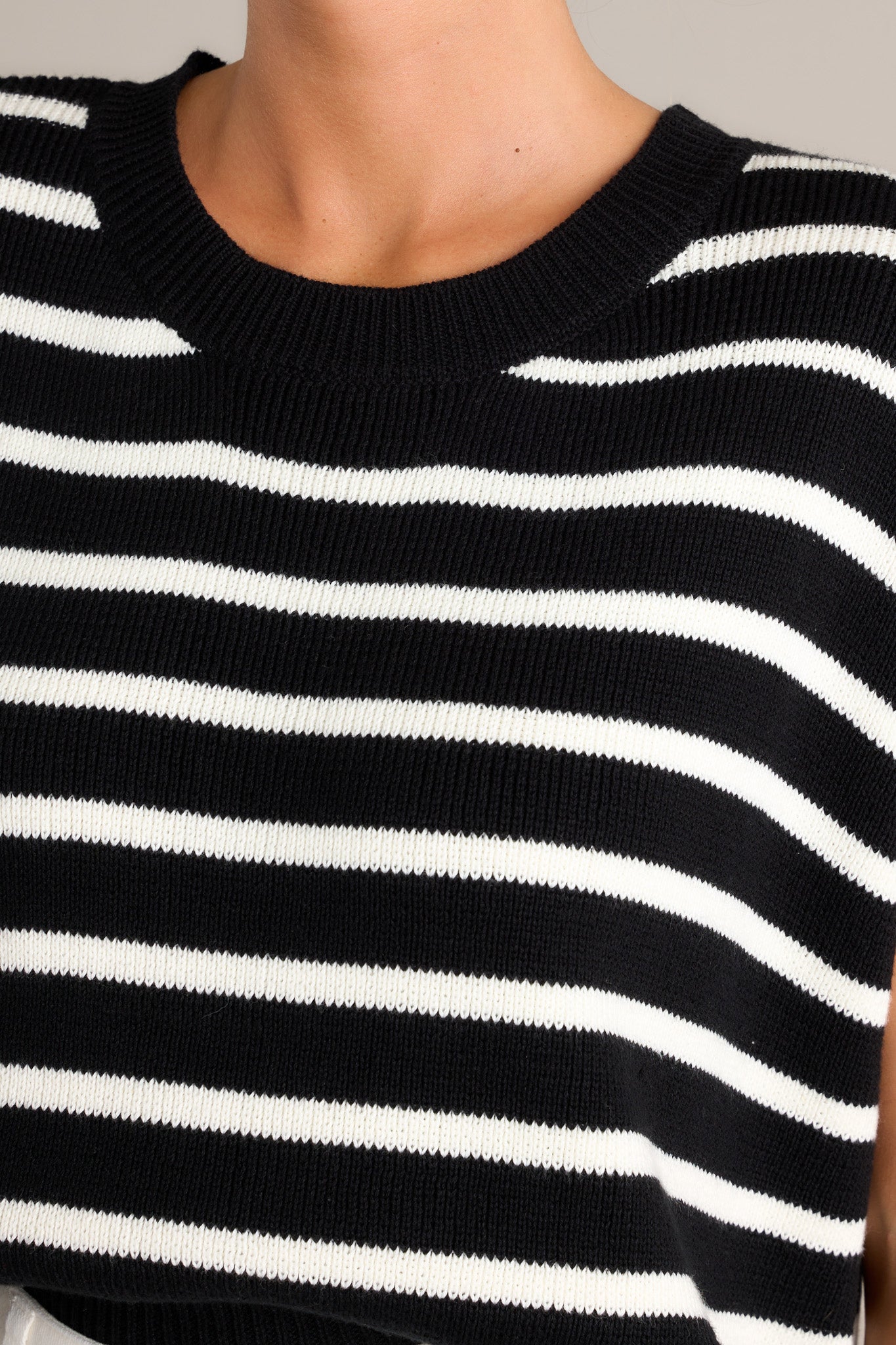 Unleash your bold side with the Daring Diva Black Stripe Sweater Top. This playful top is perfect for making a statement with its eye-catching stripe design that adds a touch of fun and flair to any outfit. Let your personality shine through with this must-have piece! This black sweater top features a ribbed crew neckline, horizontal stripes, a split ribbed hemline, and short sleeves.