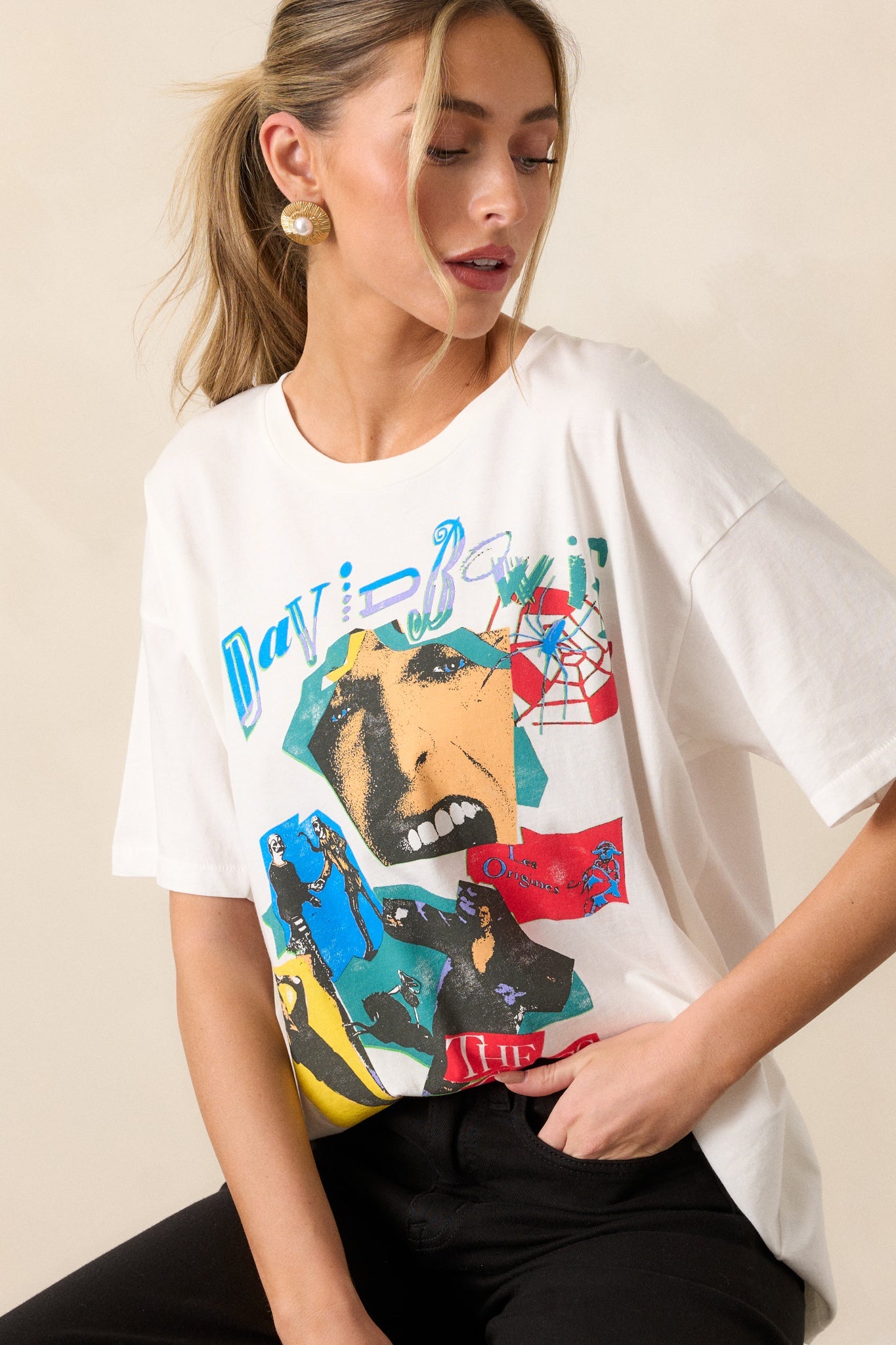 Indulge in the iconic style of David Bowie with this soft white Les Origines Merch Tee! Embrace the legacy of Ziggy Stardust and bring your wardrobe to life with this classic design. Made with premium materials, this t-shirt provides both comfort and style. Channel your inner rockstar and make a statement with this must-have piece. This white tee features a round collar, short sleeves, and a "David Bowie The Glass Spider Tour" graphic on the front and back.