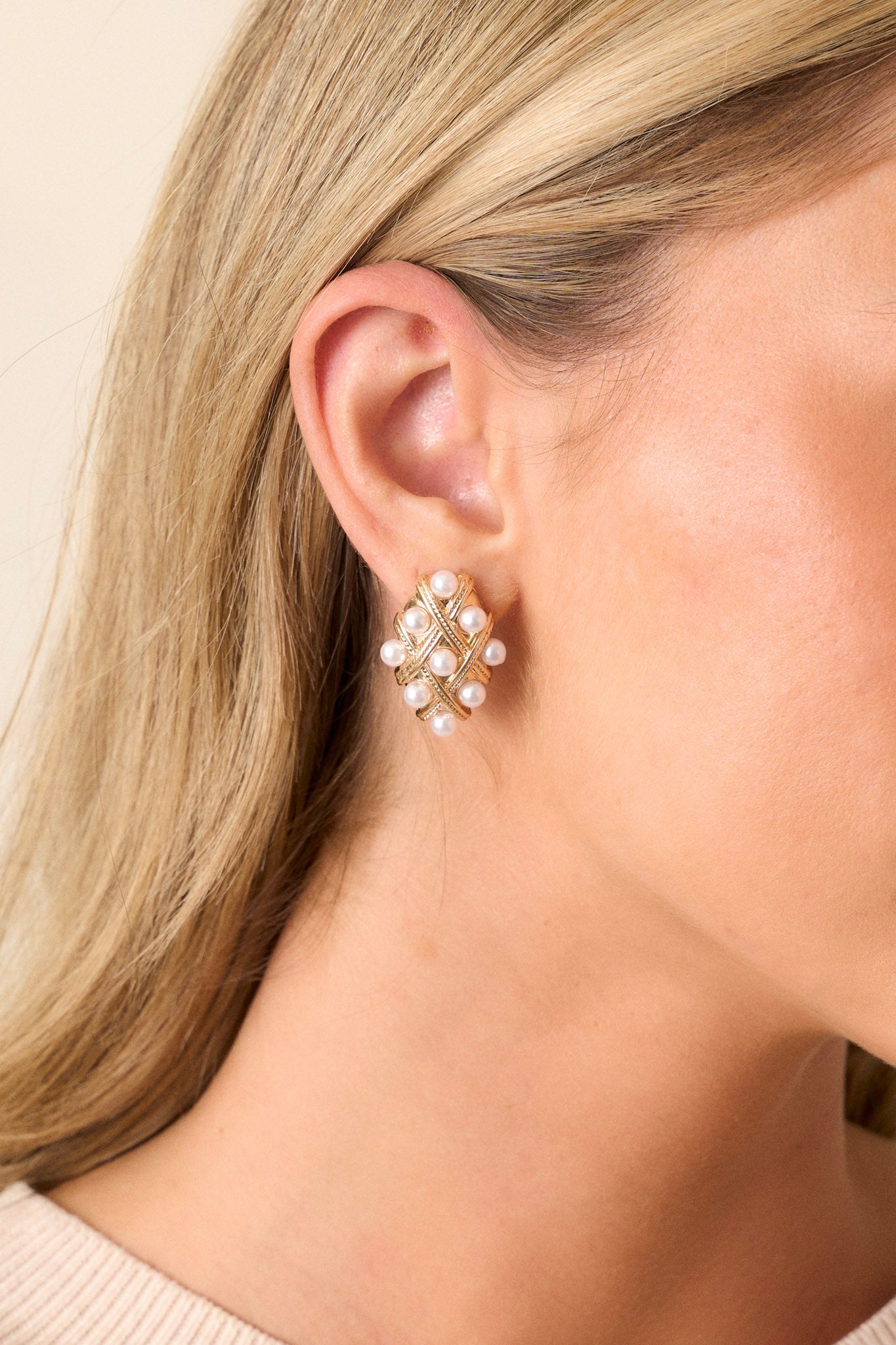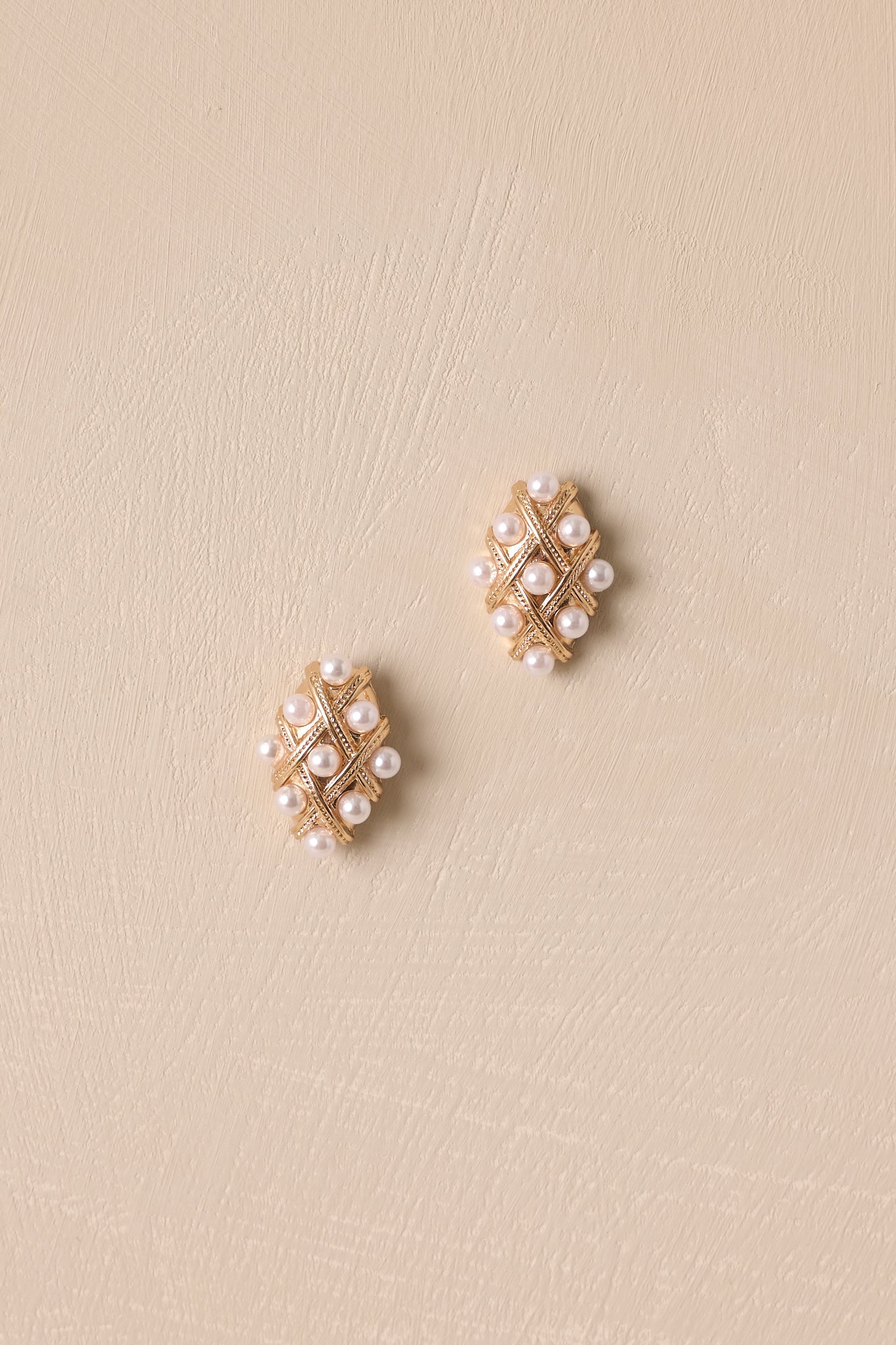 Add a touch of elegance and whimsy with our Daydream Believer Gold & Faux Pearl Earrings. Featuring delicate gold plating and lustrous faux pearls, these earrings add a touch of glamour to any outfit. Perfect for daydreamers and believers alike, they make a great gift or addition to your own jewelry collection. These gold & faux pearl earrings feature a diamond shape, gold hardware, a quilted design, faux pearls accents and secure back postings.