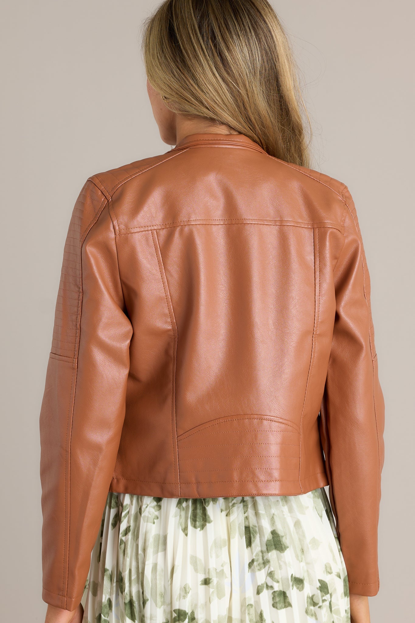 Make a statement worthy of the comebacks you love to give with this Defying The Odds Caramel Faux Leather Jacket. Its edgy flair gives you that challenge-ready look while keeping you warm and comfy! Break the mold and show everyone you're unafraid of the odds. This moto jacket features a snap button at the front of the neck, a zipper down the front, two functional pockets with zipper closures, stitched detailing on the shoulders, gold hardware, and a faux leather finish.
