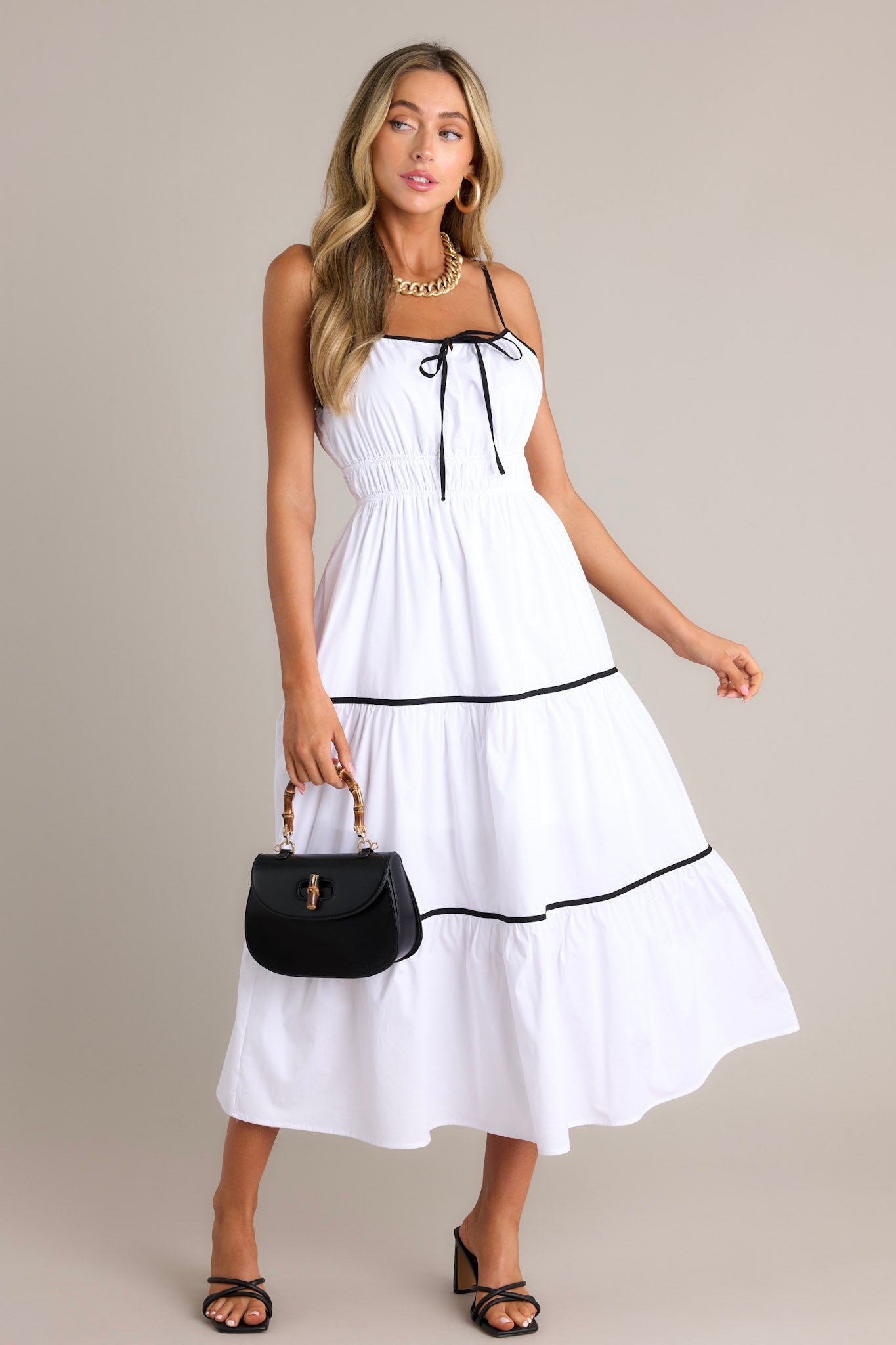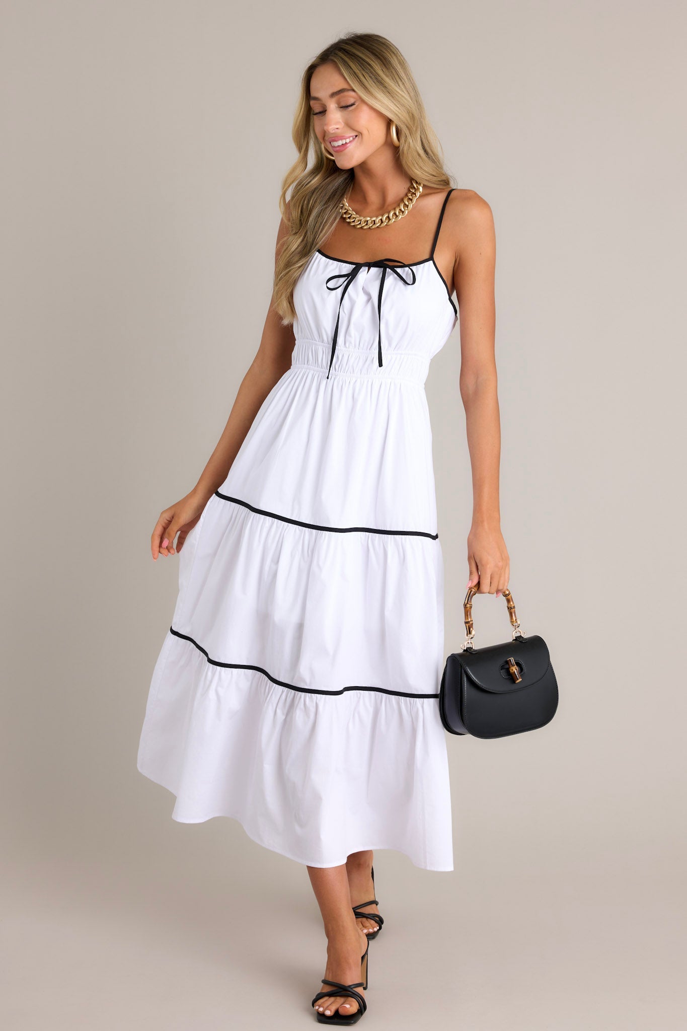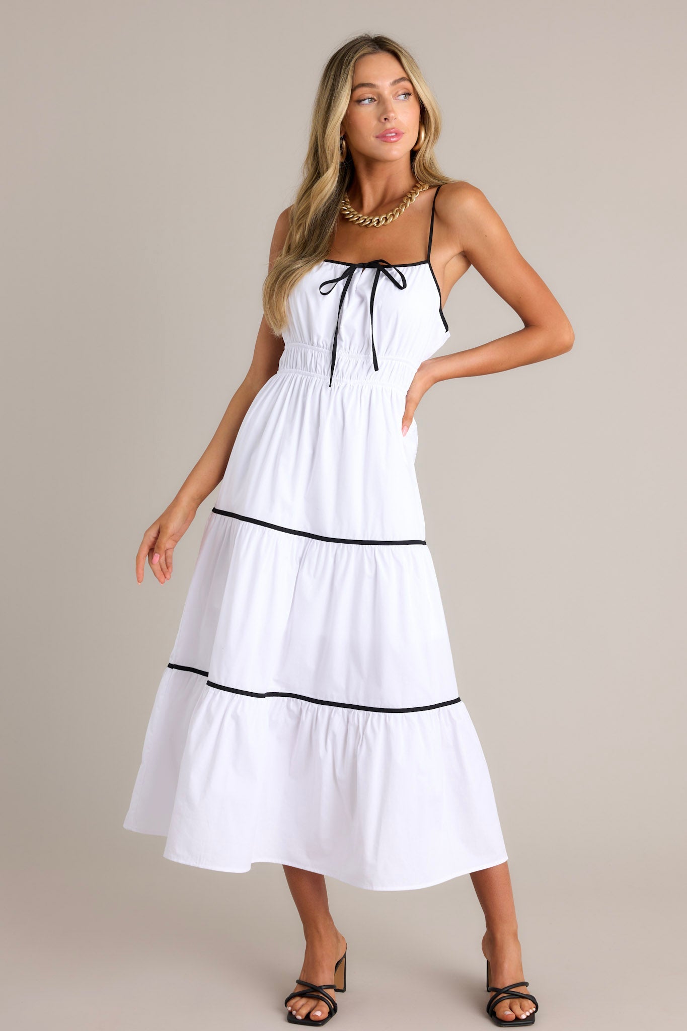 Discover a delightful surprise with our White Tiered Midi Dress. Each tier adds a playful twist to your outfit, while the midi length flatters your figure. Perfect for any occasion, this dress will have you turning heads with its unique style. This white midi dress features a square neckline, thin adjustable straps, a self-tie bust feature, an elastic waist, contrasting tiers, and a flowing silhouette.